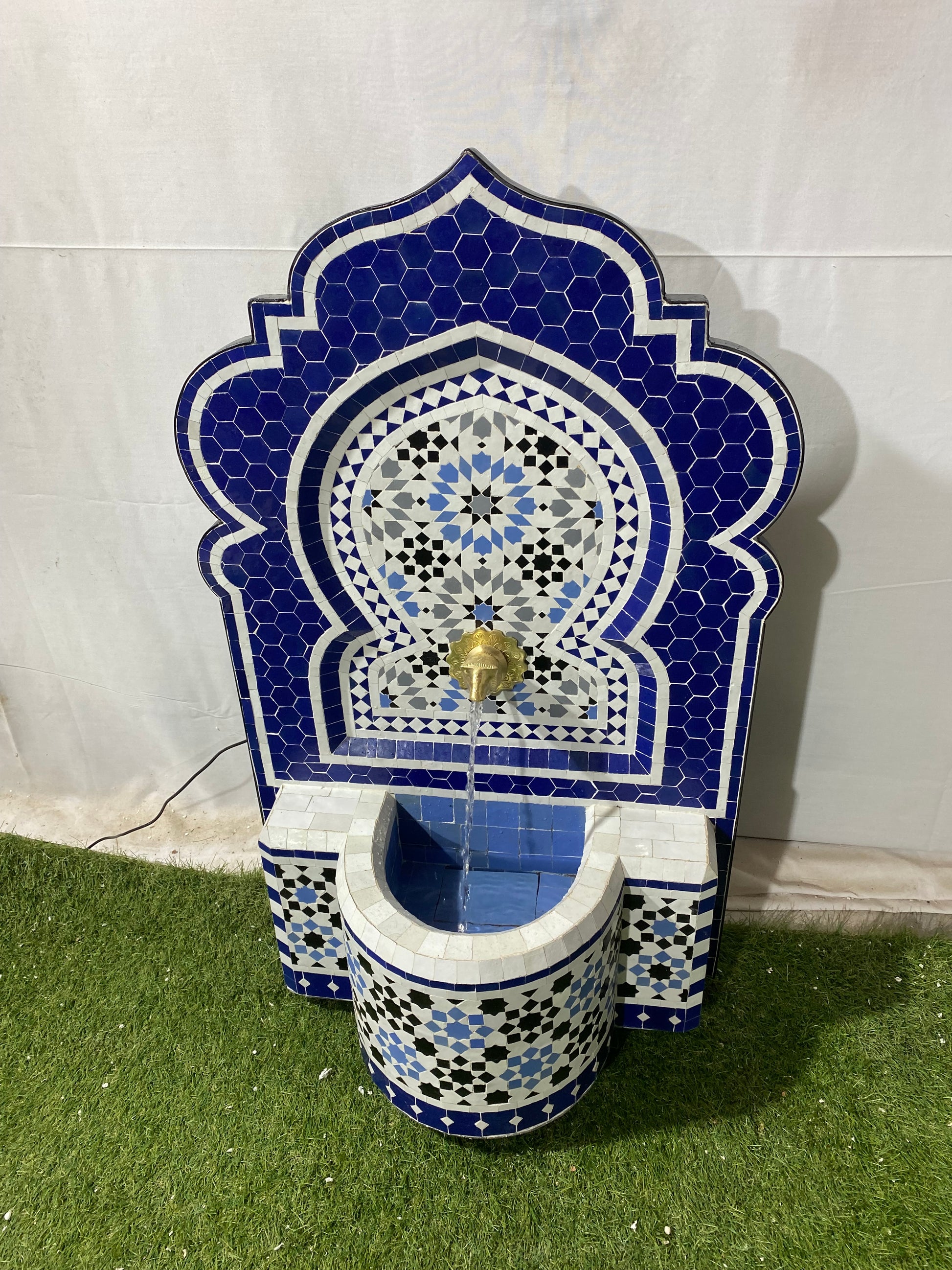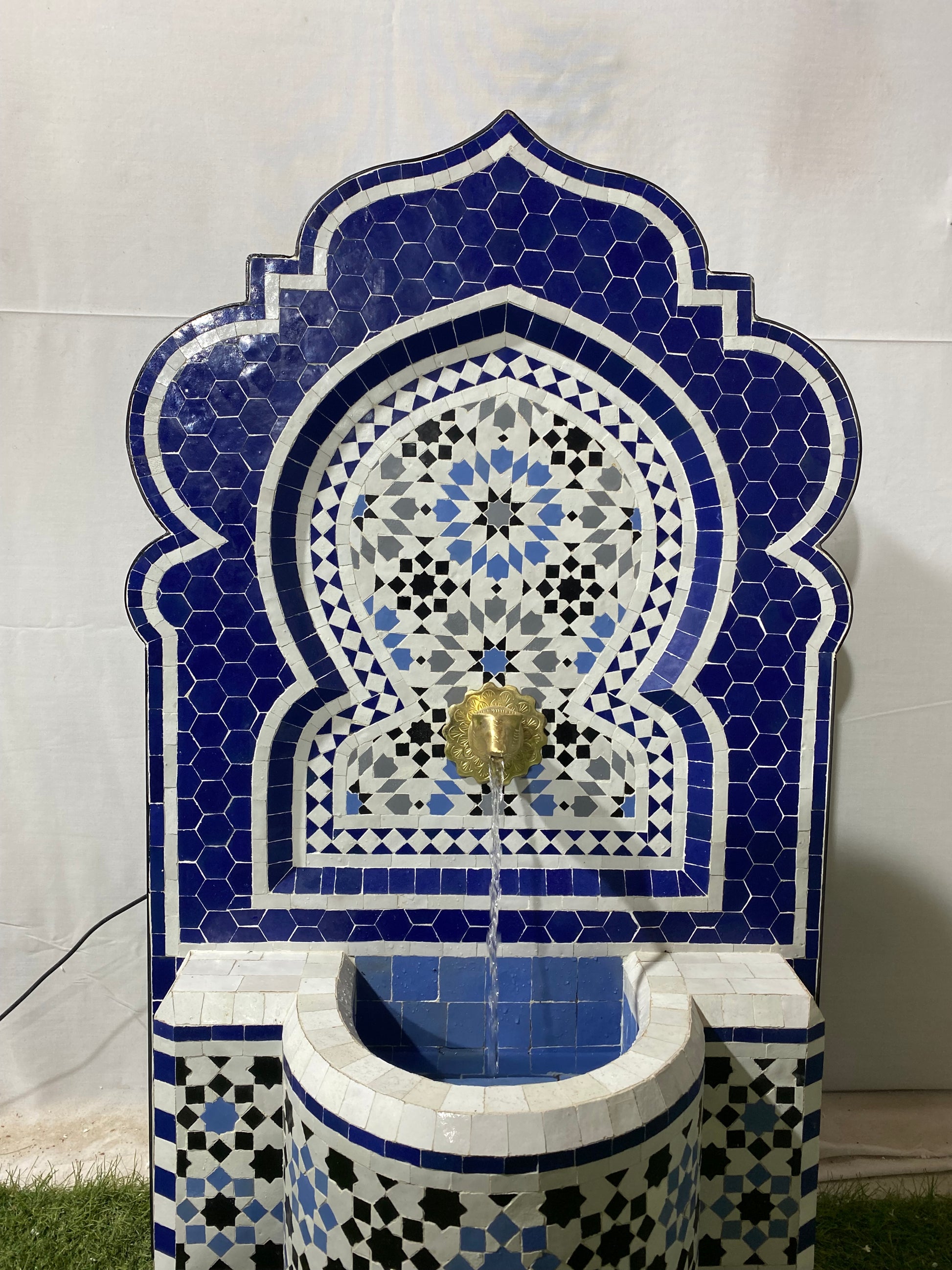 This exquisite Moroccan fountain features a stunning deep blue and white Zellige mosaic, a handcrafted brass tap, and a soothing water flow. Whether for indoor or outdoor use, it brings the perfect balance of tradition and elegance to any space.