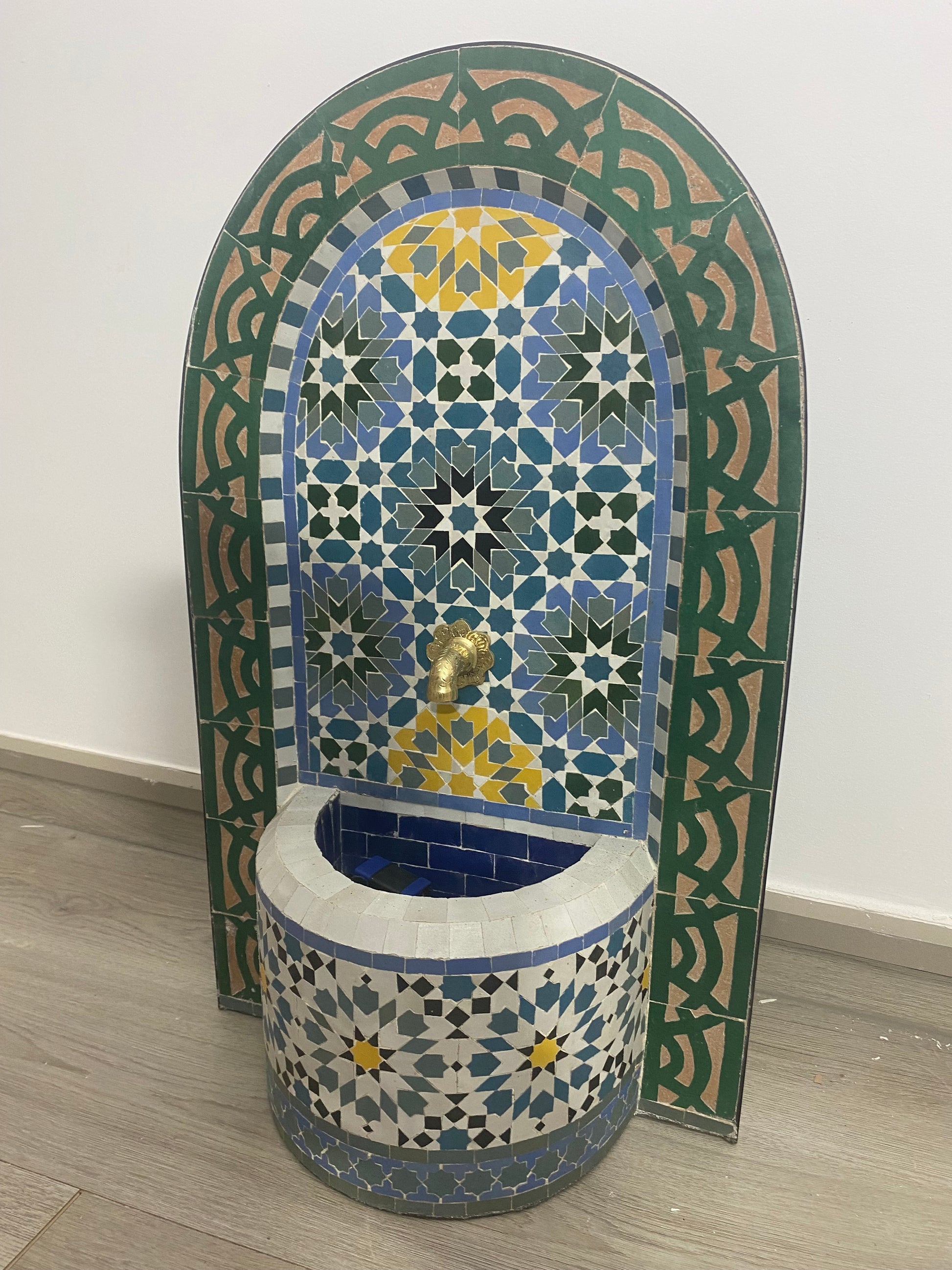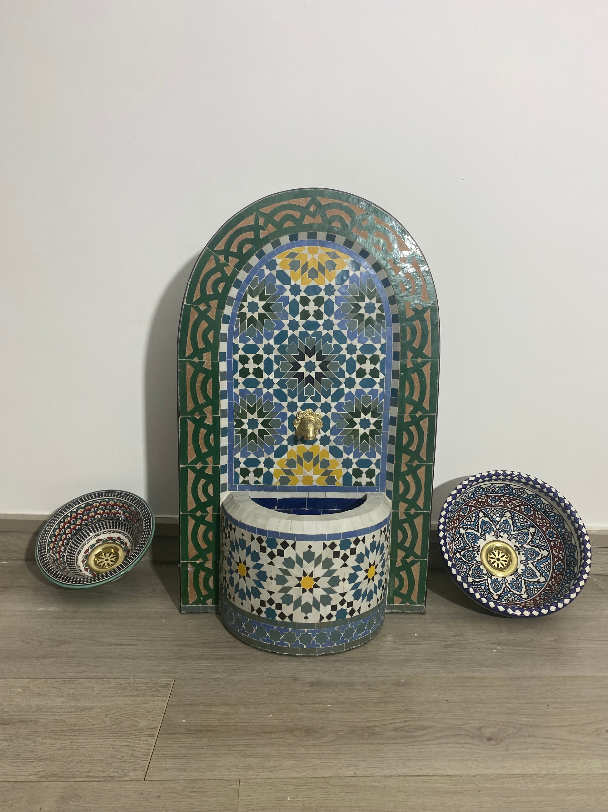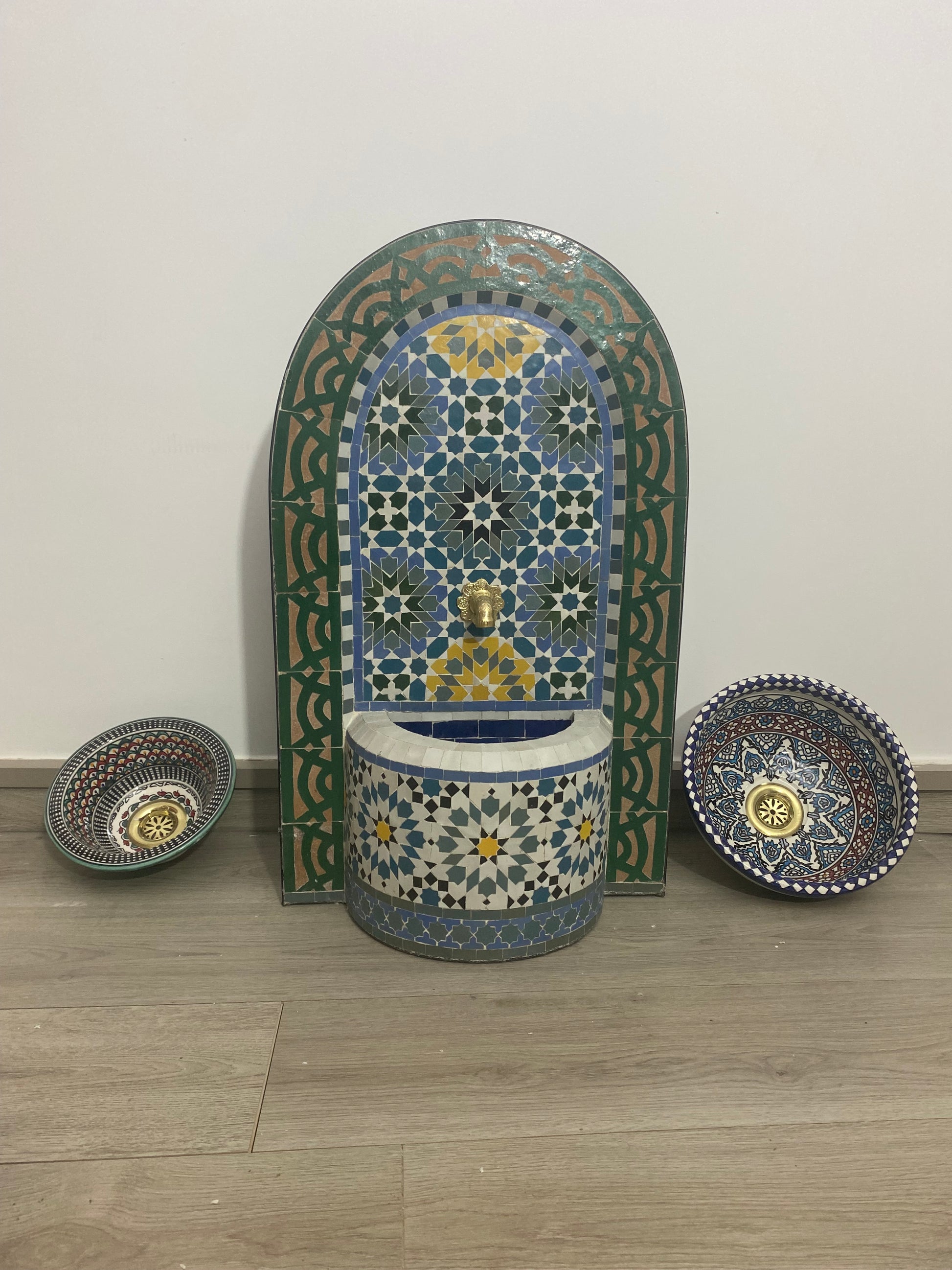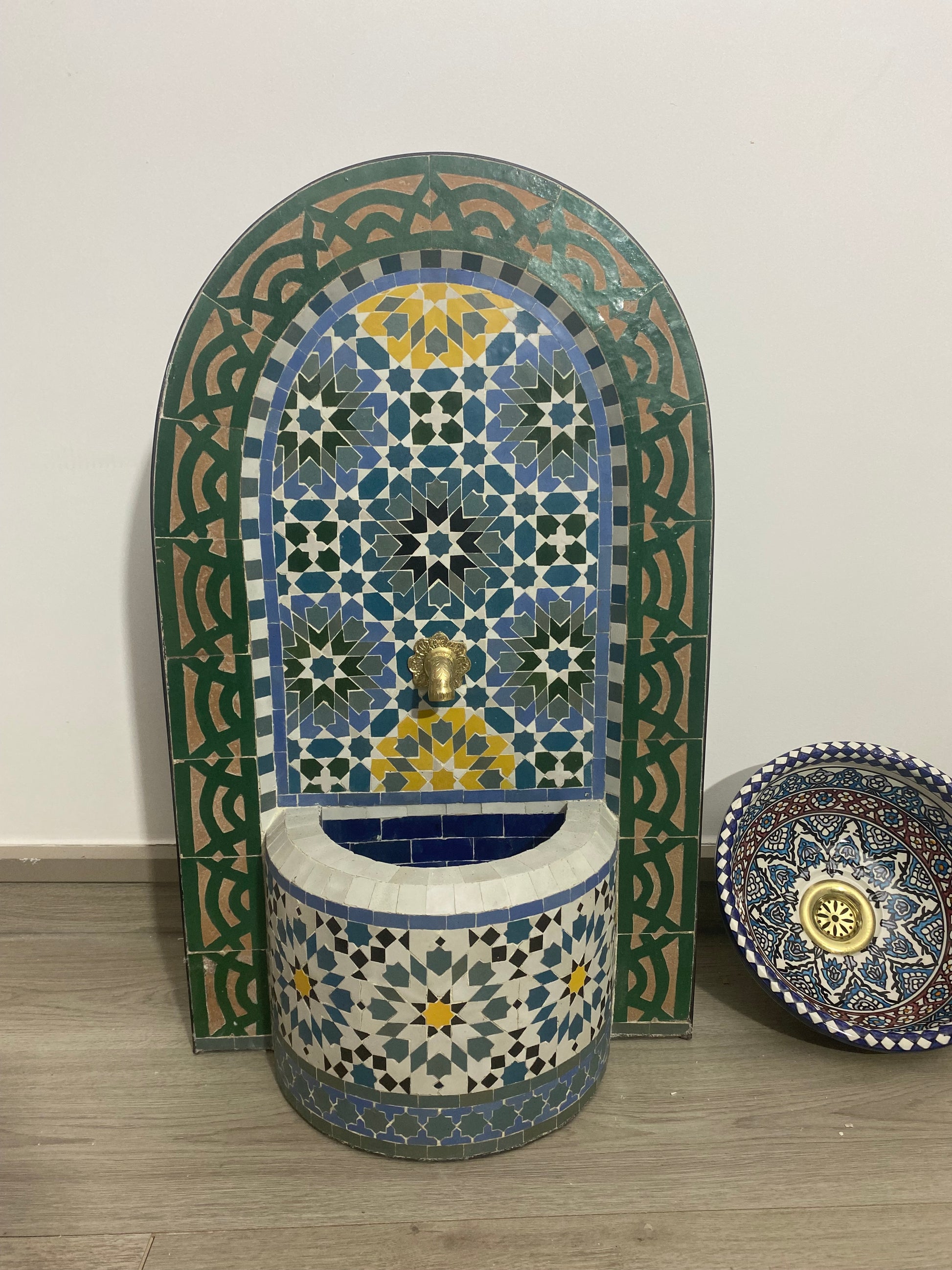 This stunning Moroccan fountain is a masterpiece of traditional craftsmanship, featuring hand-cut Zellige tiles in gold and white, a solid brass tap, and a soothing water flow. Whether placed indoors or outdoors, it adds a touch of Moroccan elegance to any space.