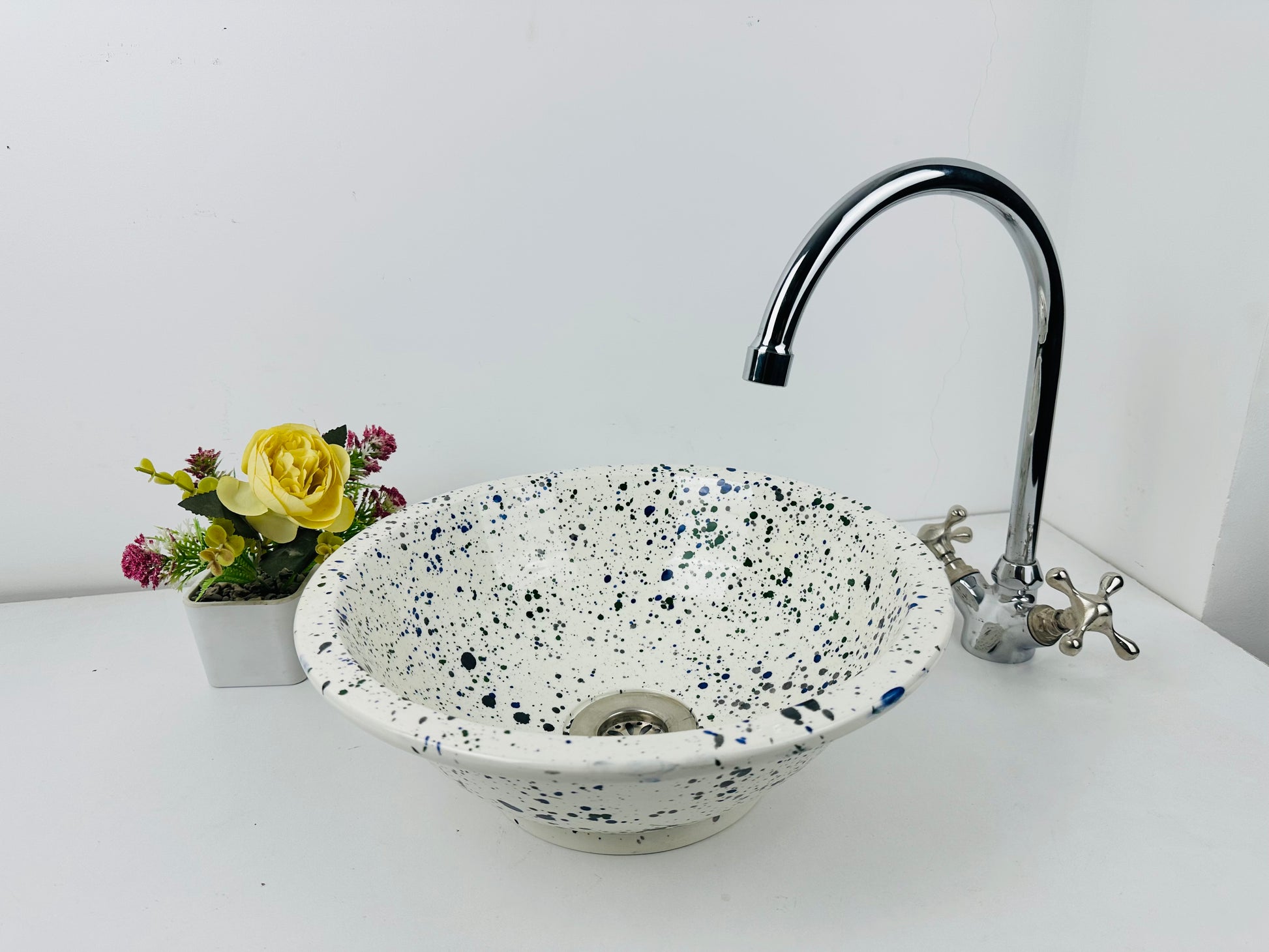 Bring a playful yet elegant touch to your bathroom with this speckled ceramic vessel sink, showcasing vibrant splashes of blue and green on a crisp white base. The abstract pattern adds a lively charm while maintaining a sophisticated appeal, perfect for modern or artistic interiors.