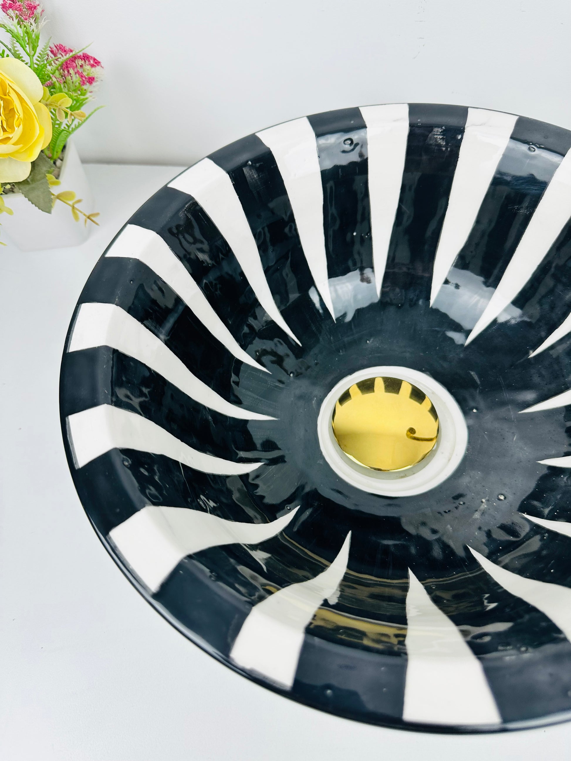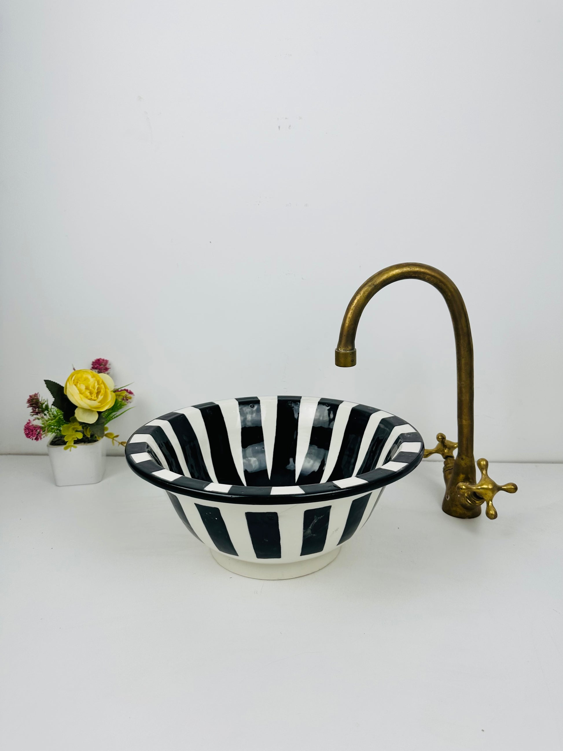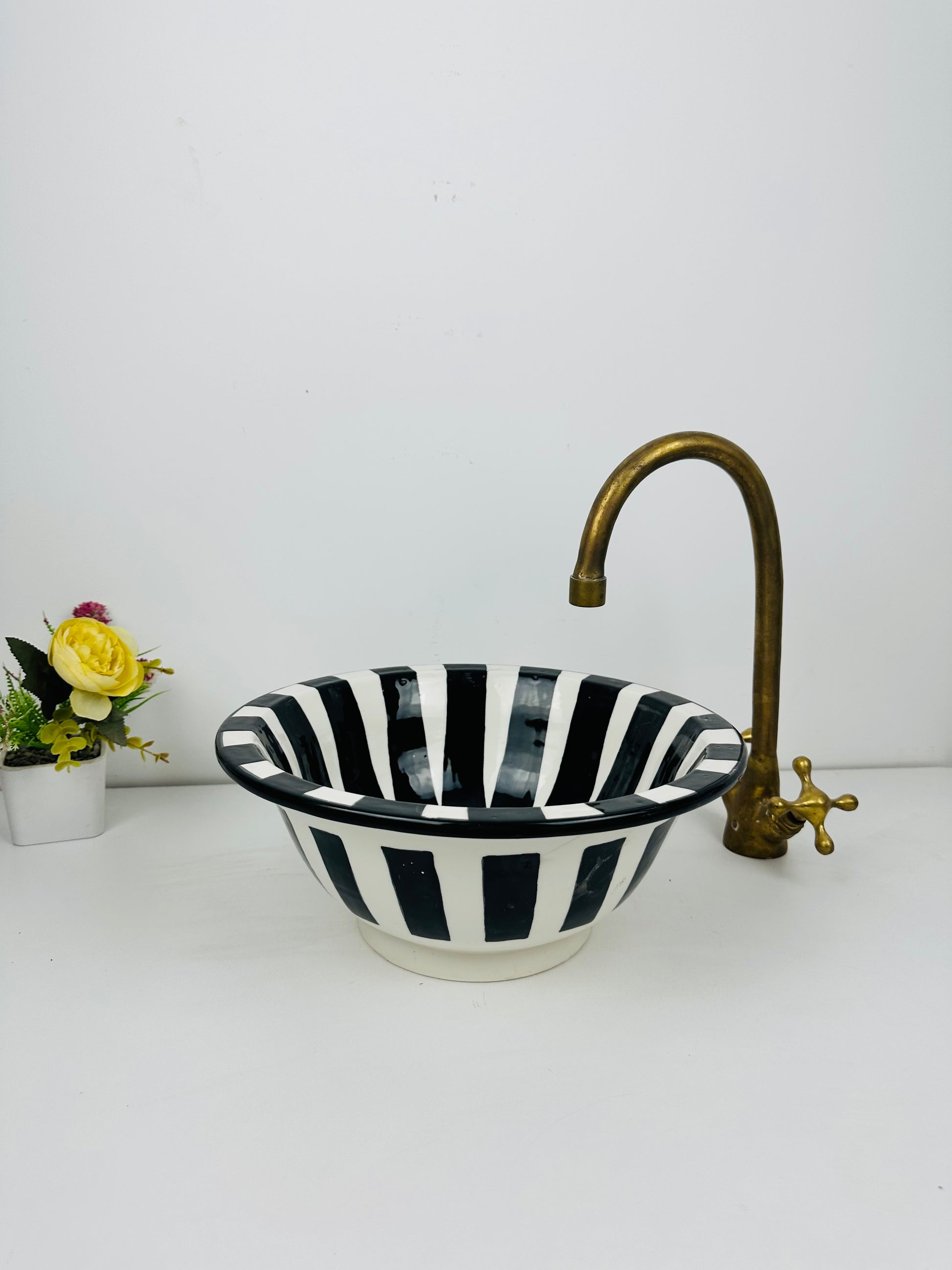 Introduce bold contrast to your bathroom with this eye-catching ceramic vessel sink, featuring hand-painted black and white stripes for a modern, monochromatic statement. Its unique flared shape enhances its artistic appeal, making it a centerpiece in any contemporary or eclectic setting.