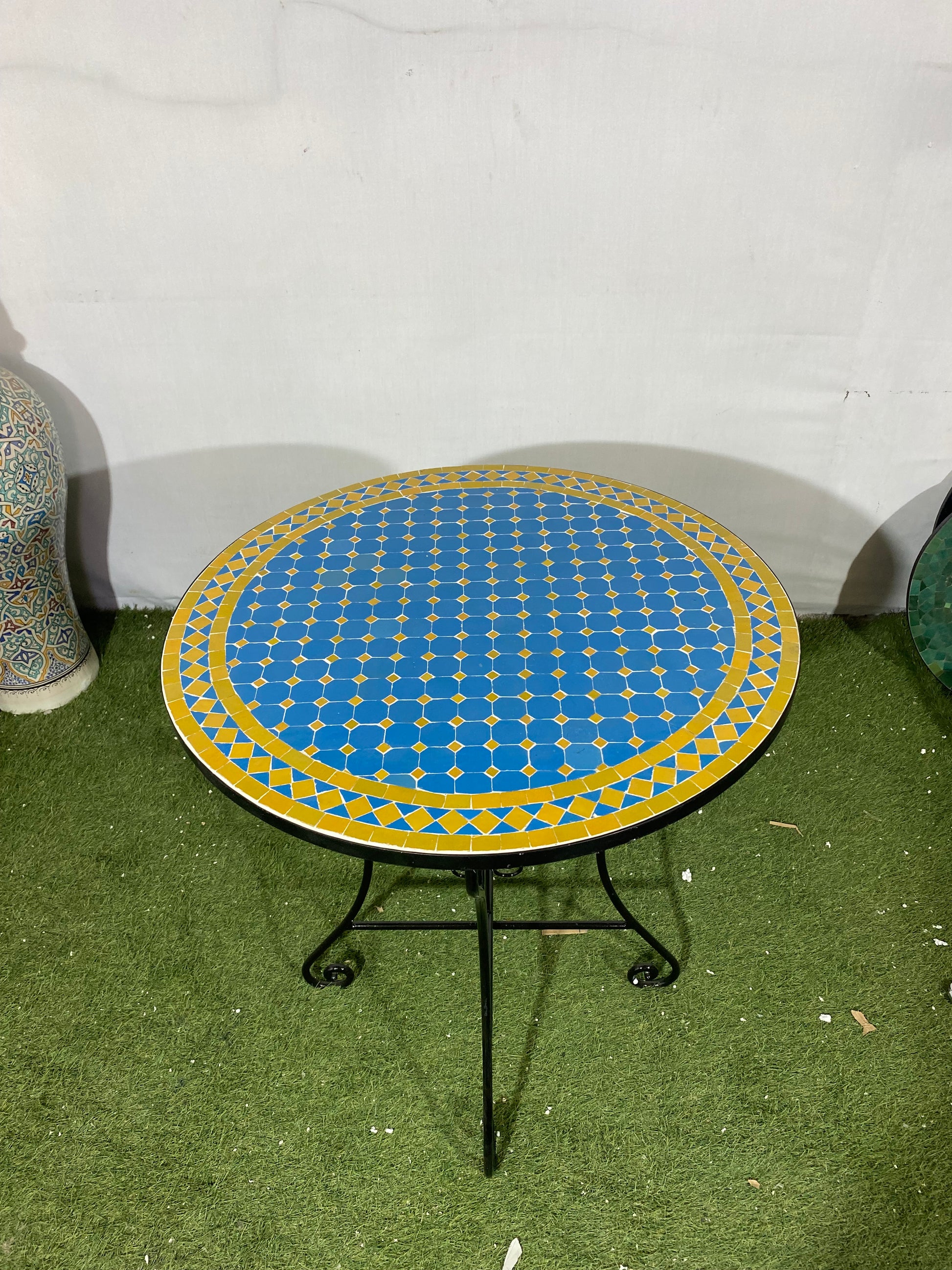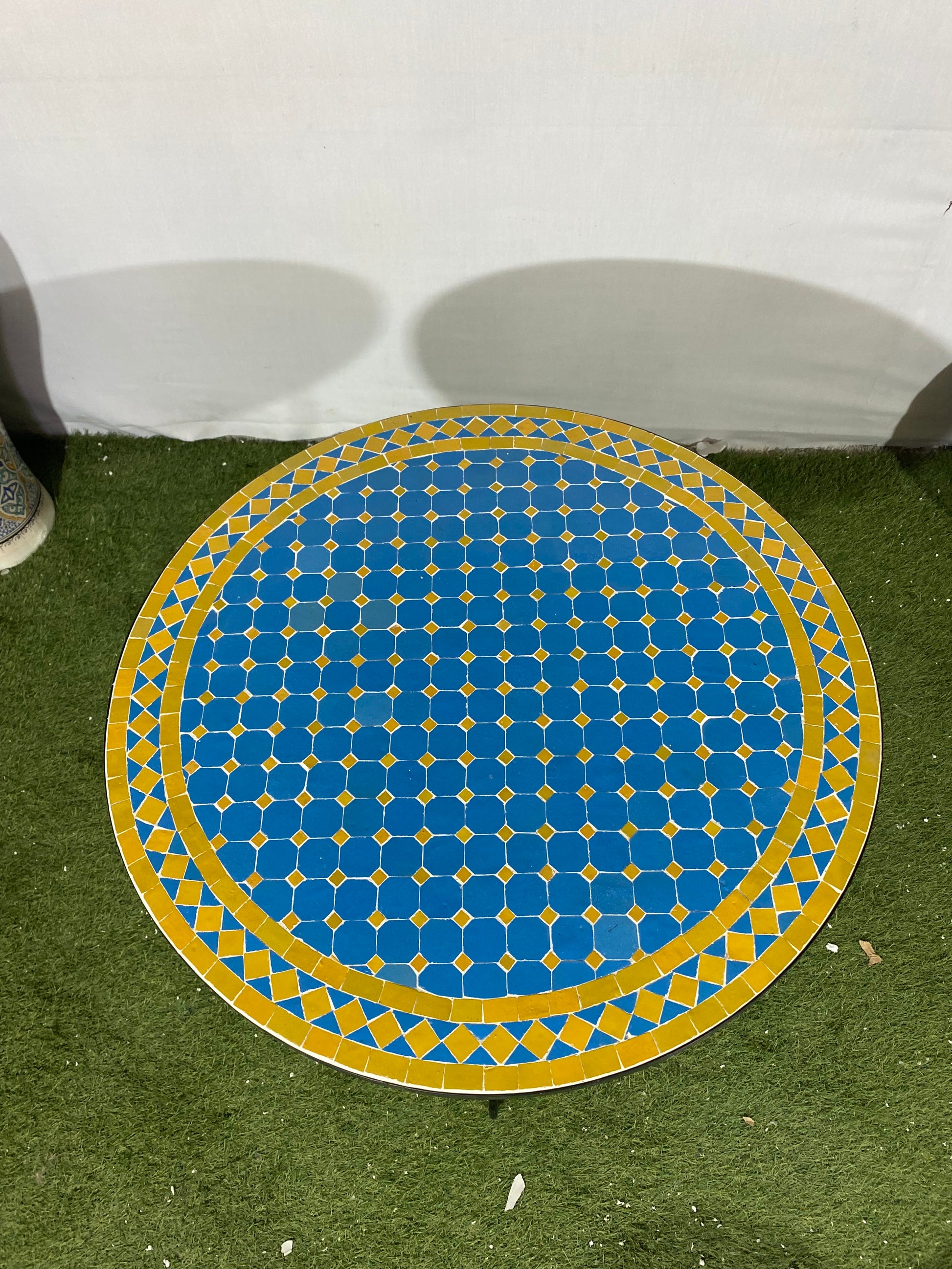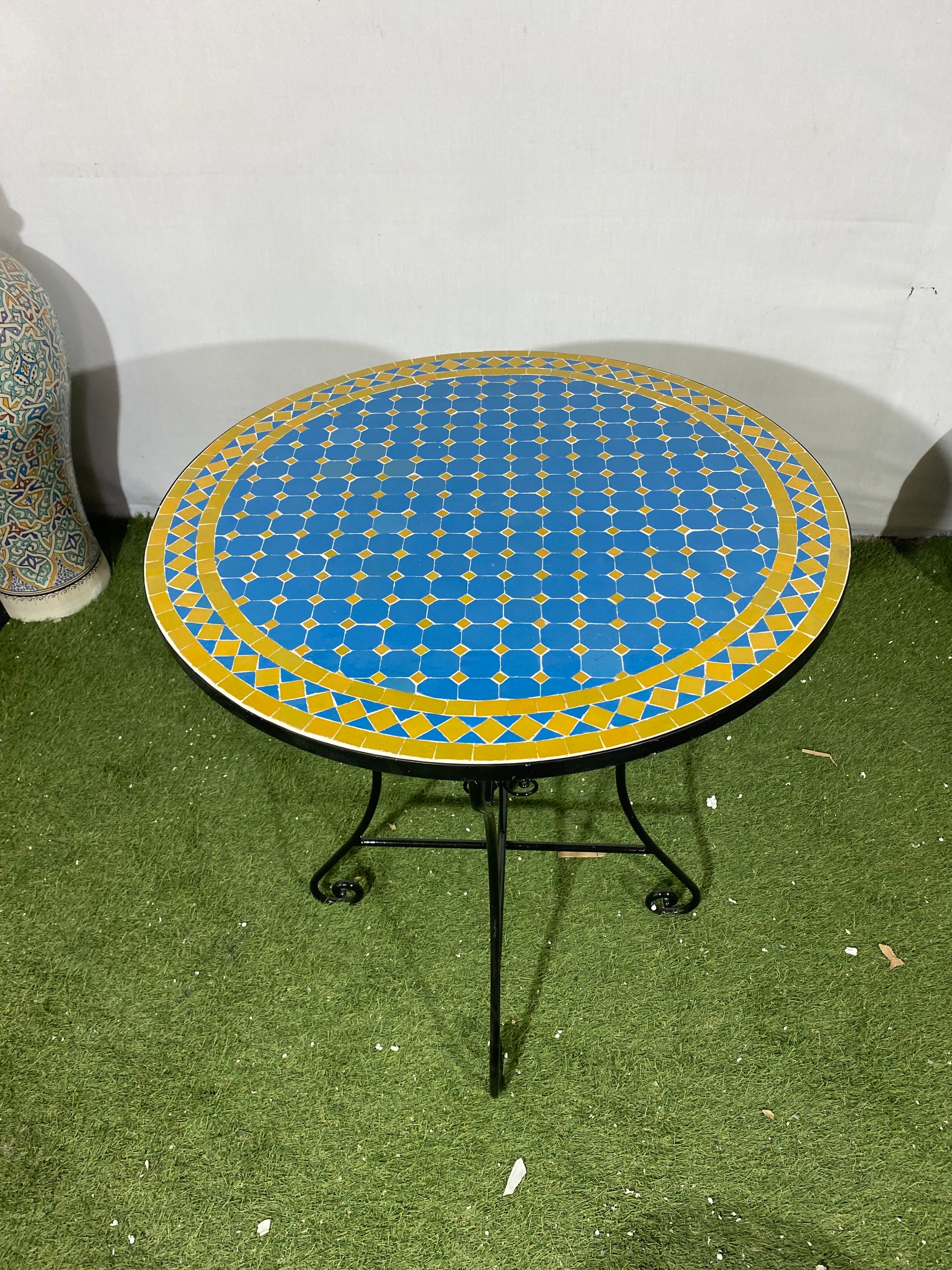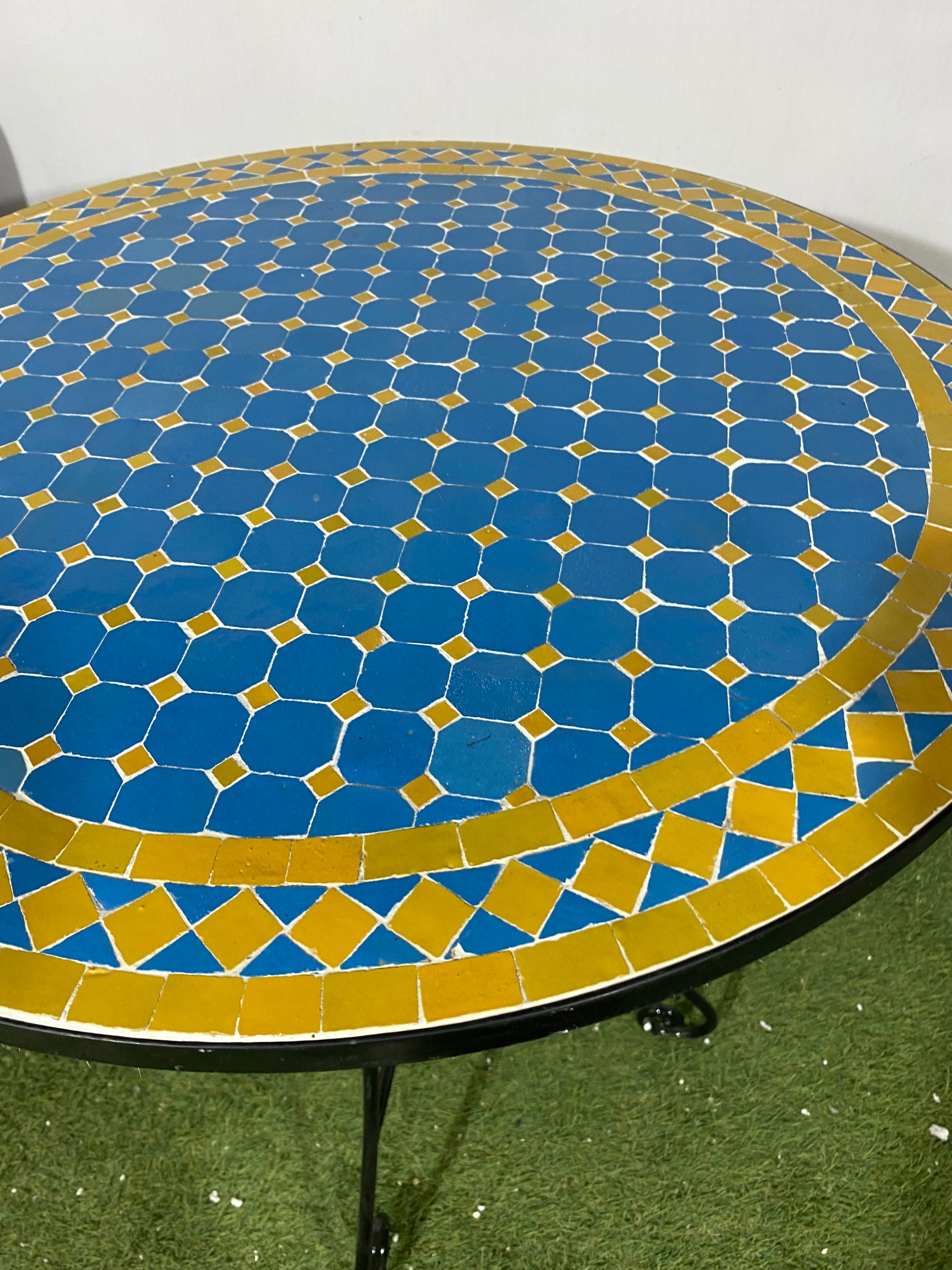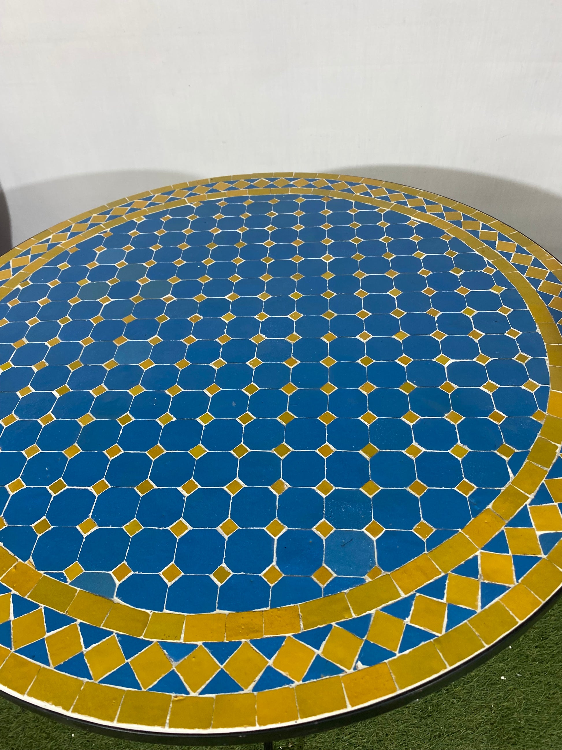 Make a statement with this stunning handcrafted mosaic table, featuring an eye-catching royal blue and golden yellow design. The intricate hexagonal pattern is accentuated by a bold geometric border, adding a touch of Mediterranean charm to any setting. Perfect for both indoor and outdoor spaces, this table is a blend of artistry and functionality.