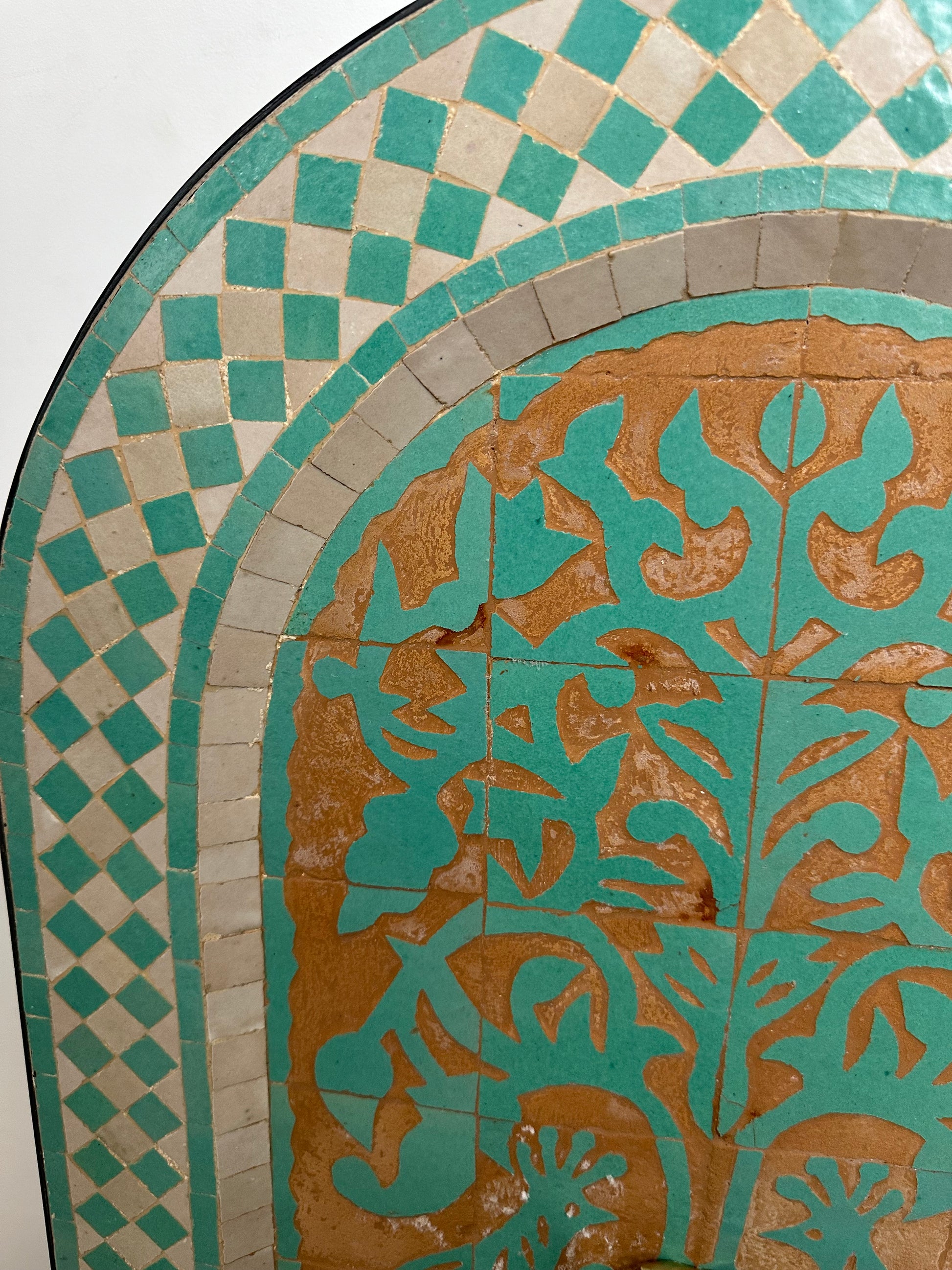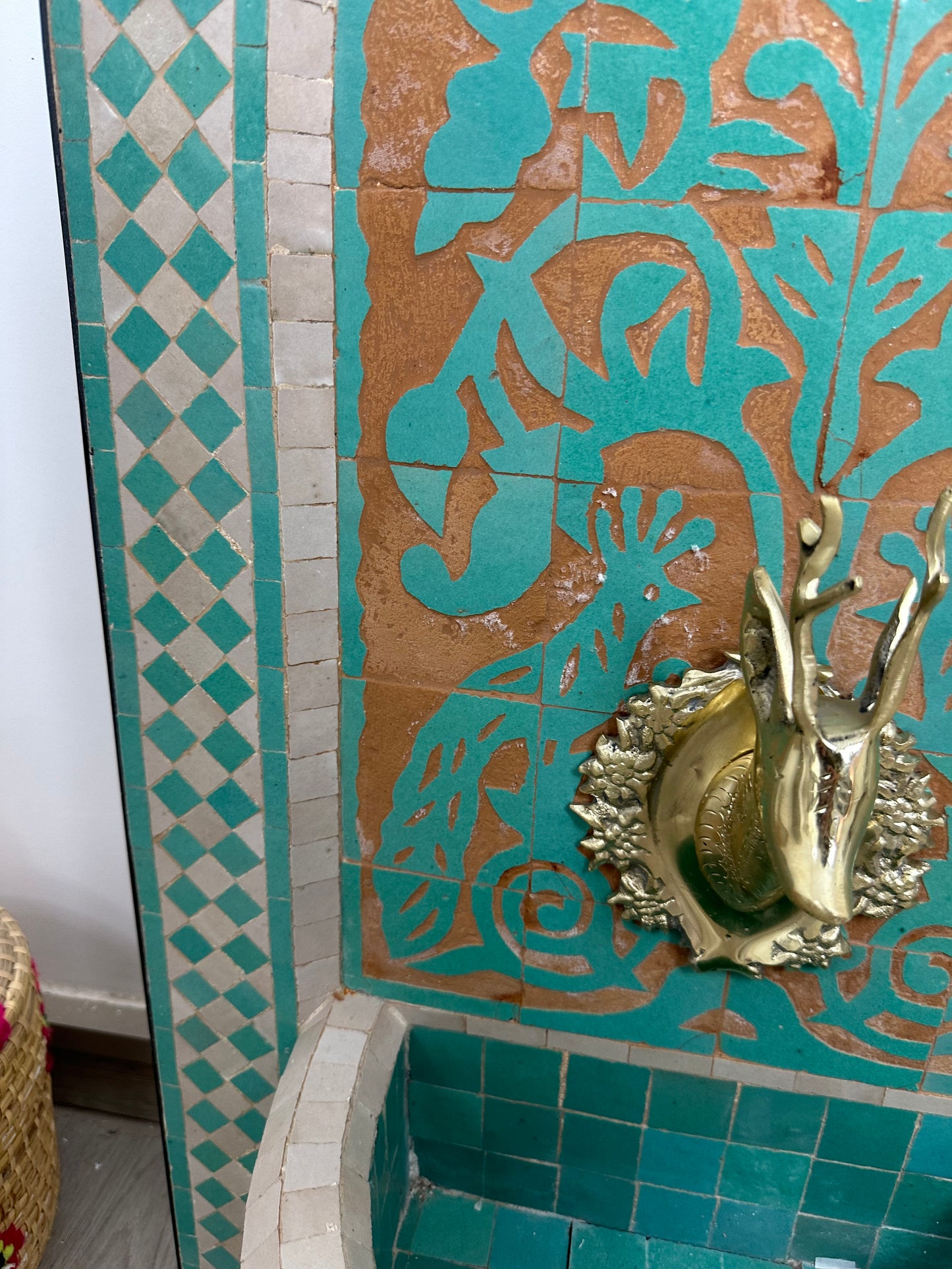 Embrace the serene beauty of Moroccan artistry with this exquisite handcrafted fountain. Featuring an earthy palette of soft beige, deep terracotta, and refreshing turquoise, this Zellige fountain evokes the harmony of nature with its stunning tree of life motif. The golden brass deer-head faucet adds a regal touch, making it a perfect statement piece for both indoor and outdoor spaces.