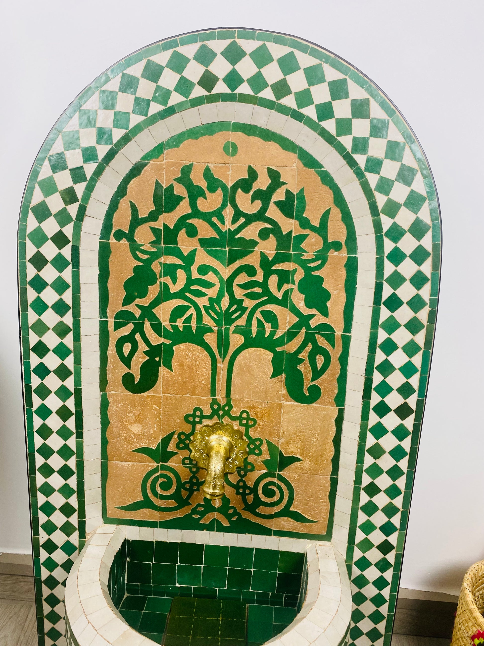 Enhance your home with this exquisite handcrafted Moroccan fountain, featuring a lush tree motif in green and gold, symbolizing prosperity and nature. Made with authentic Moroccan Zellige tiles, brass, and natural clay, this fountain is a true work of art, perfect for both indoor and outdoor settings.