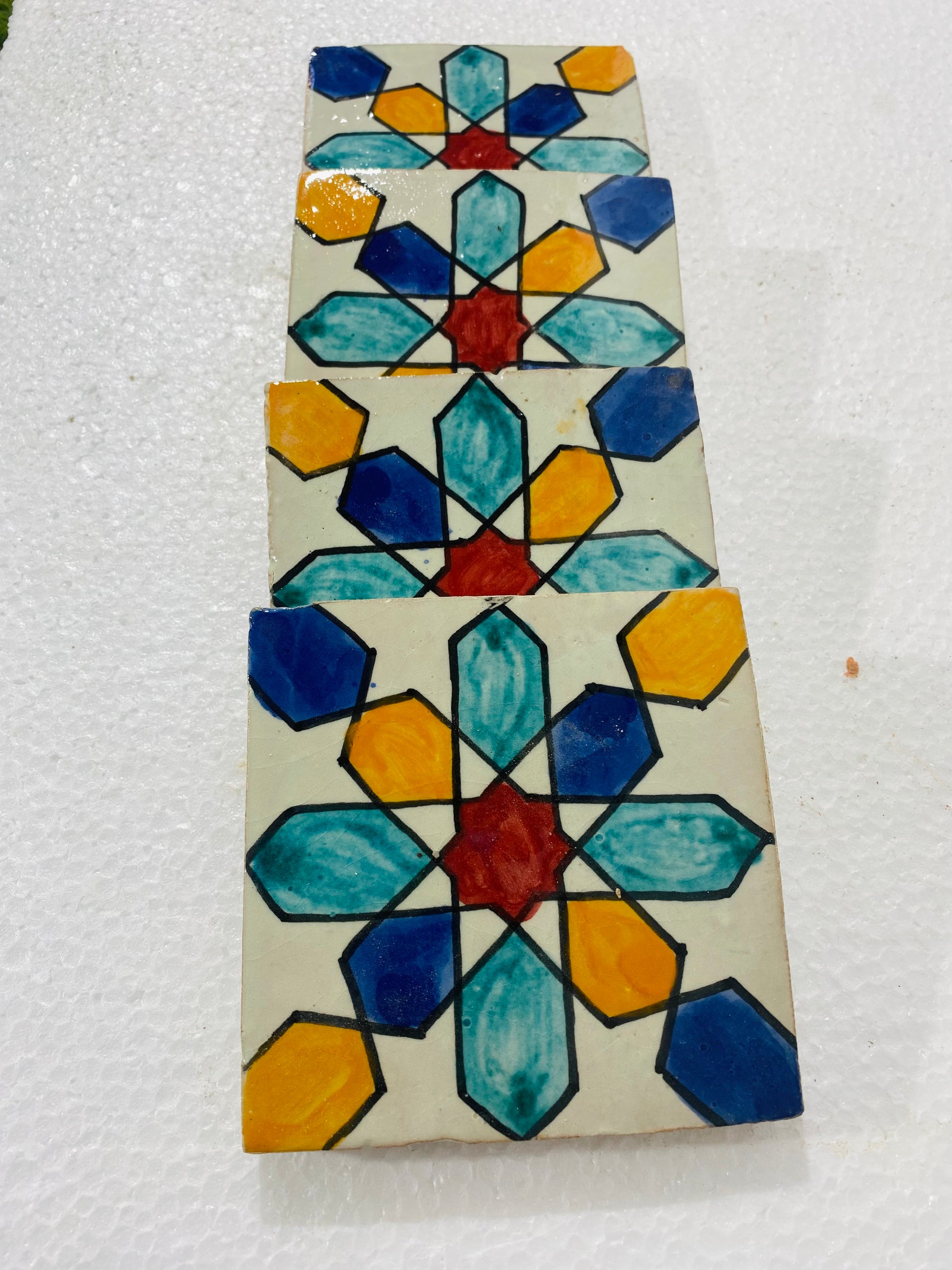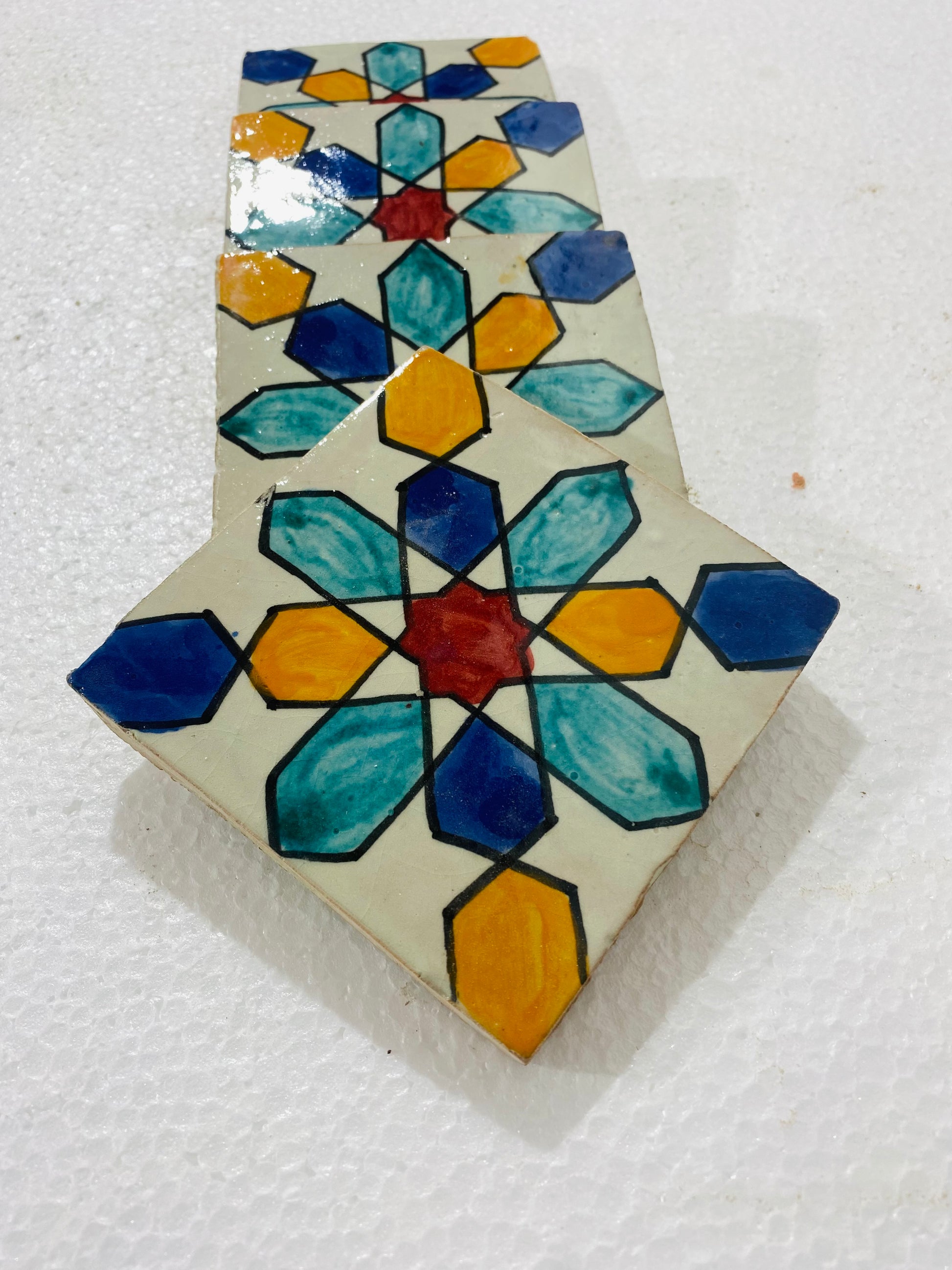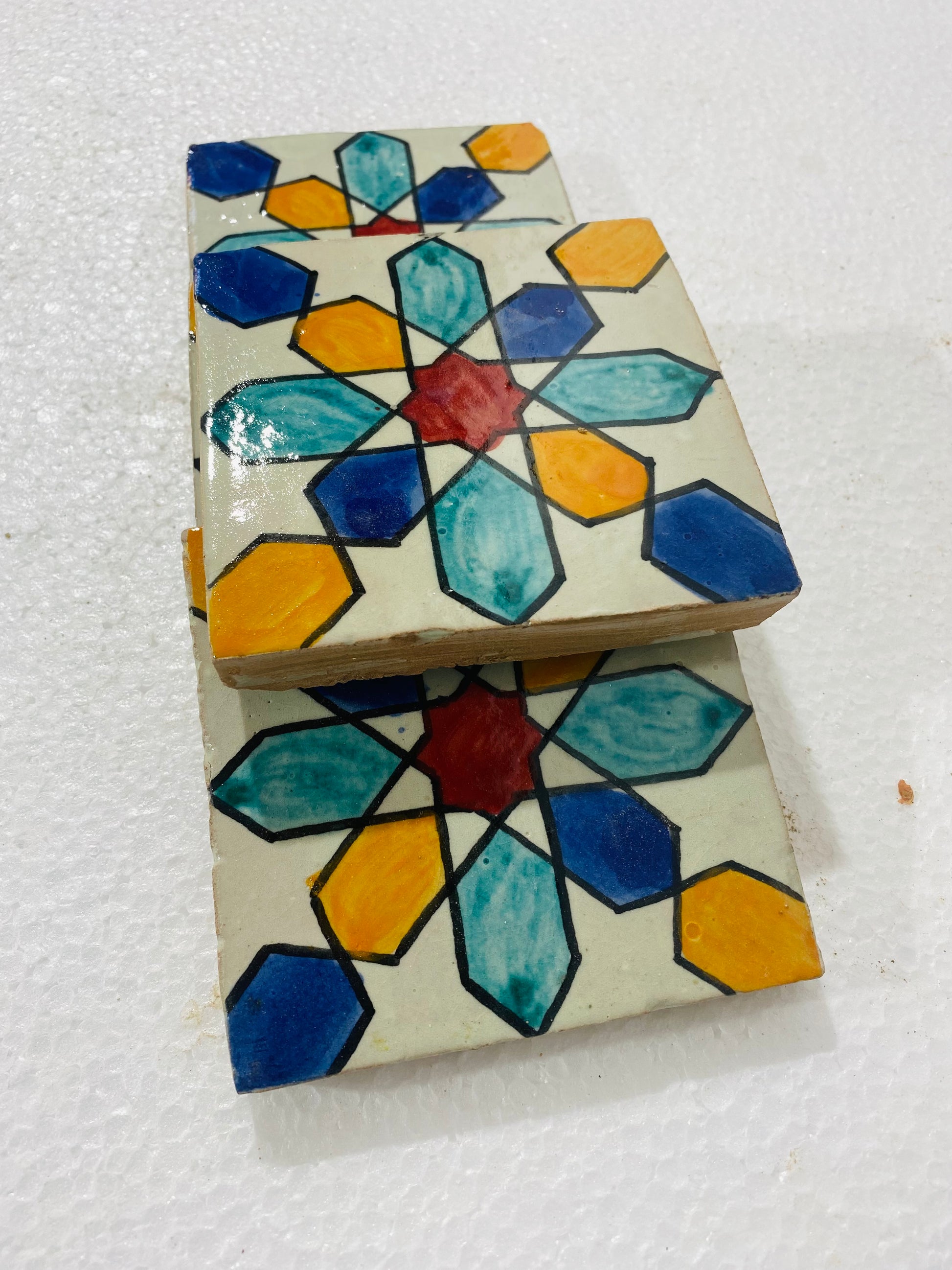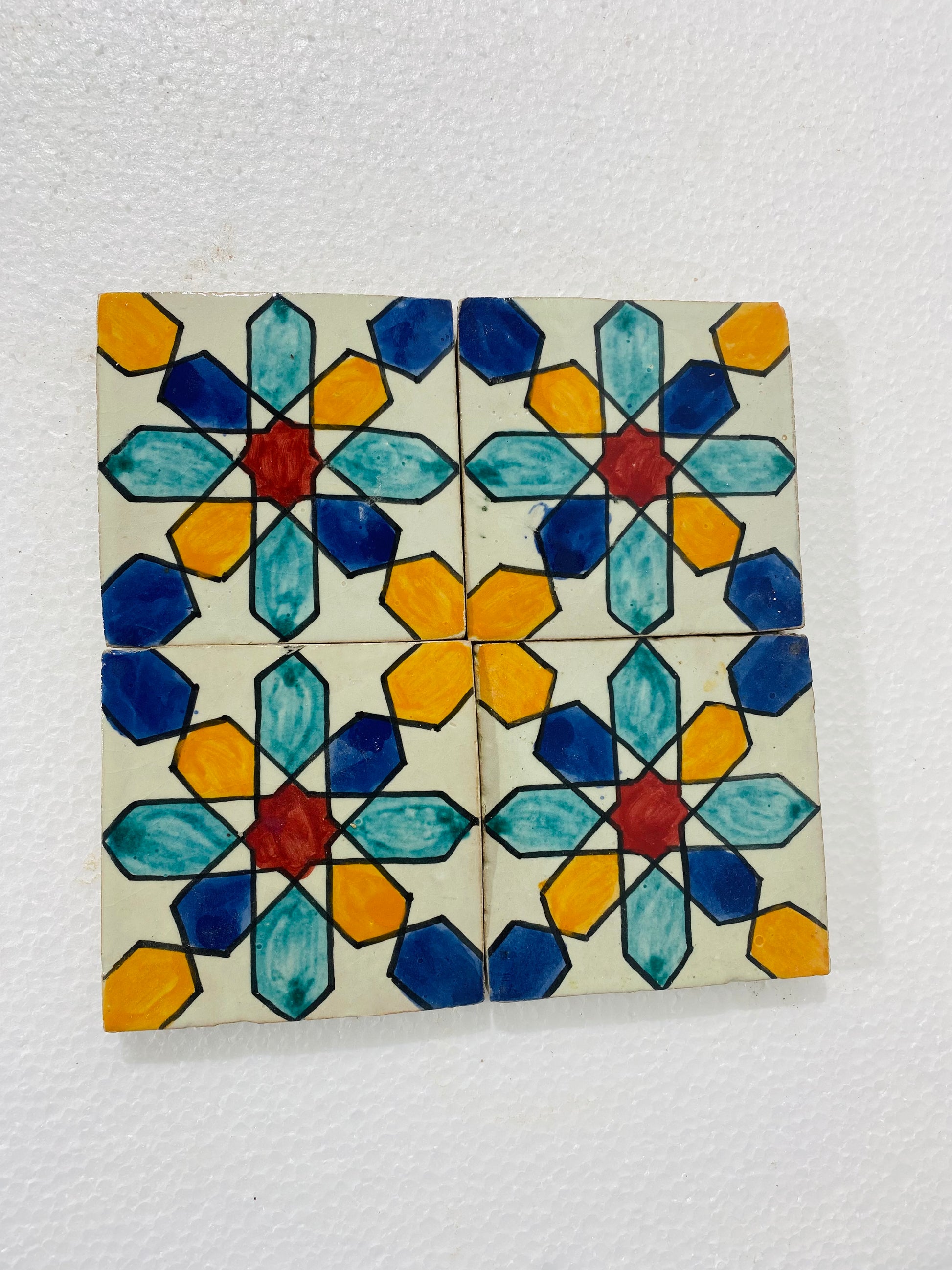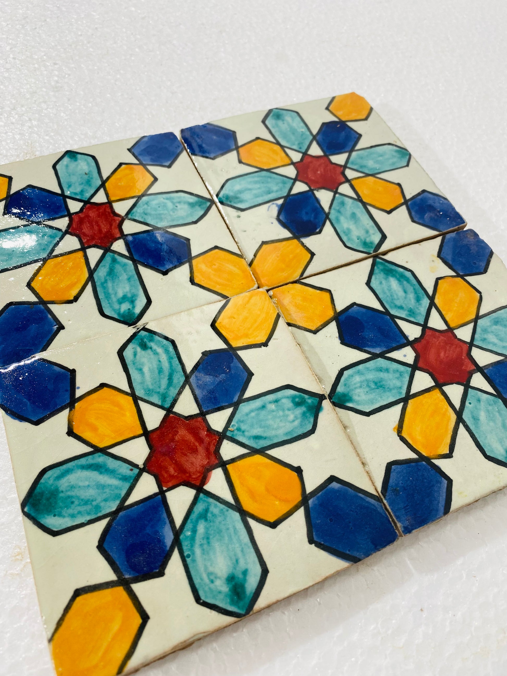 The Celestial Harmony Moroccan Zellige Tiles feature a mesmerizing hand-painted geometric starburst design, inspired by the celestial beauty of Moroccan architecture. Shades of deep blue, sky blue, golden yellow, and bold red contrast beautifully against a creamy ivory backdrop, creating a vibrant and eye-catching pattern. Each tile is handmade and hand-glazed, ensuring an authentic and timeless appeal perfect for traditional and modern spaces alike.