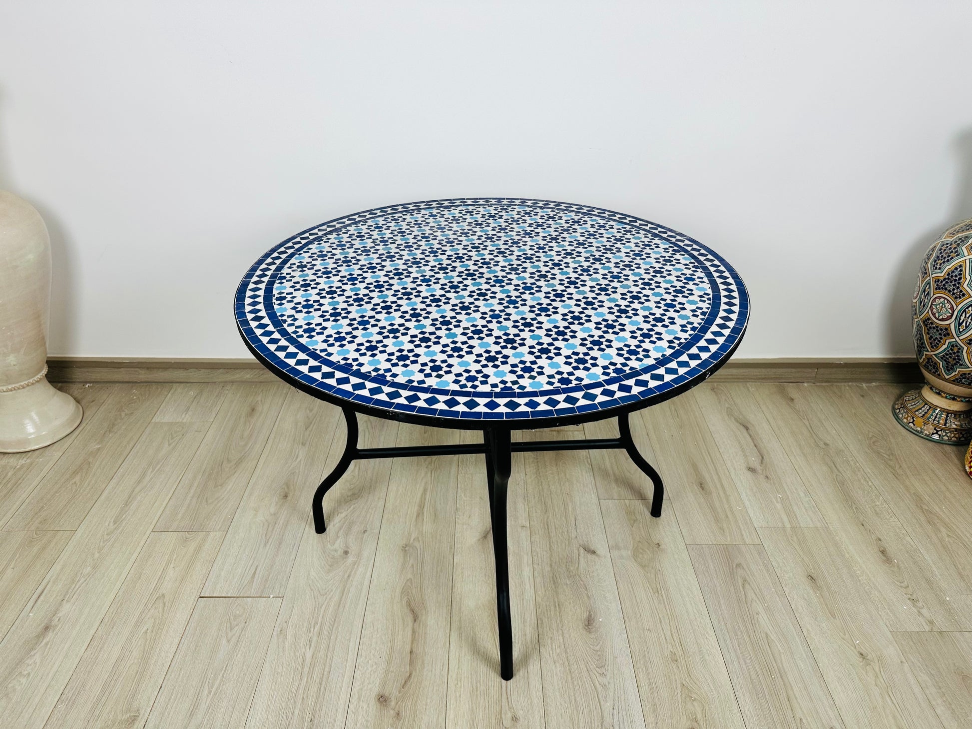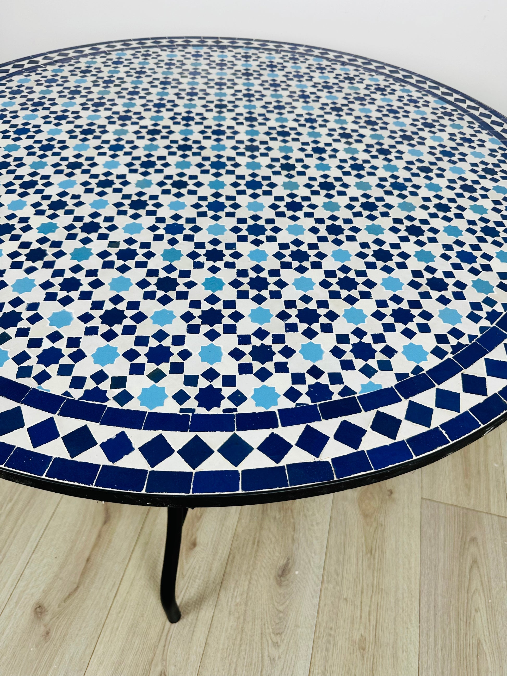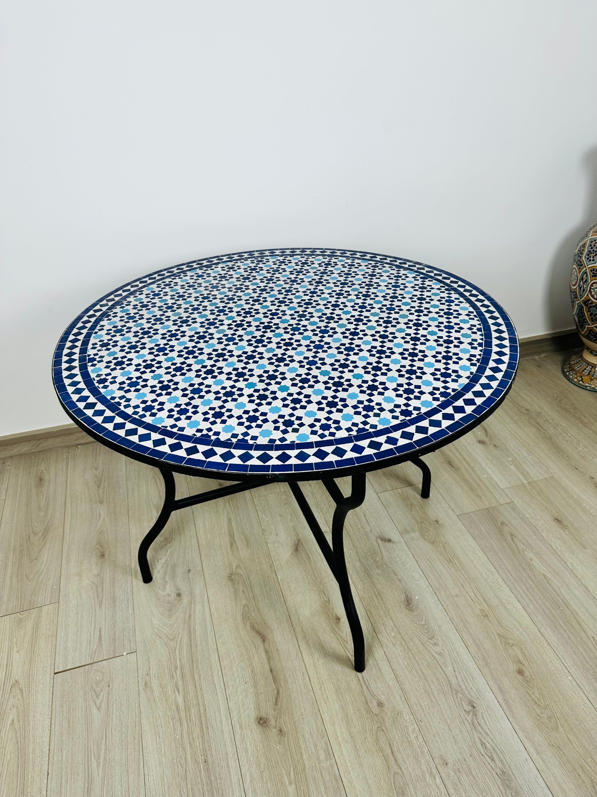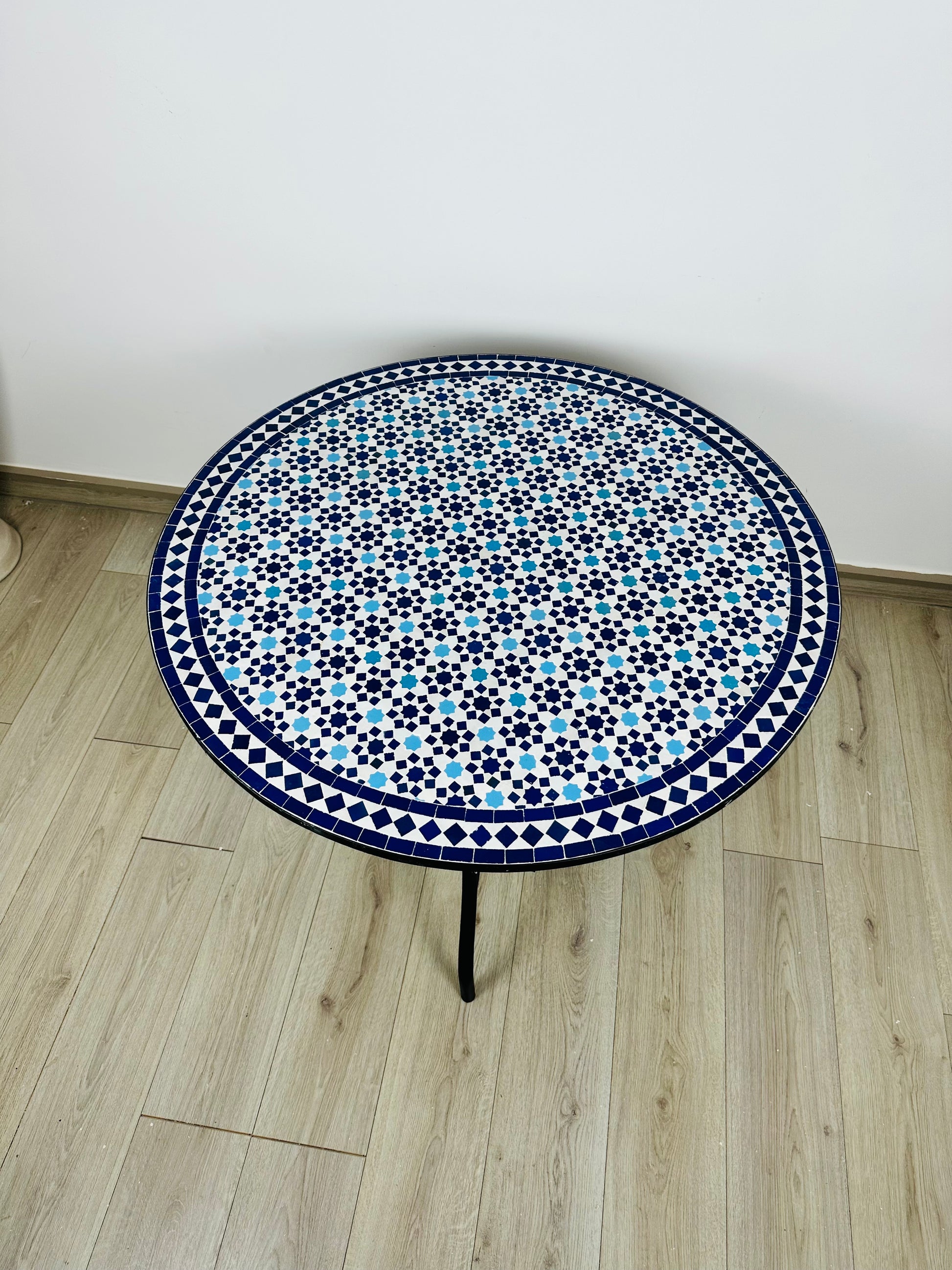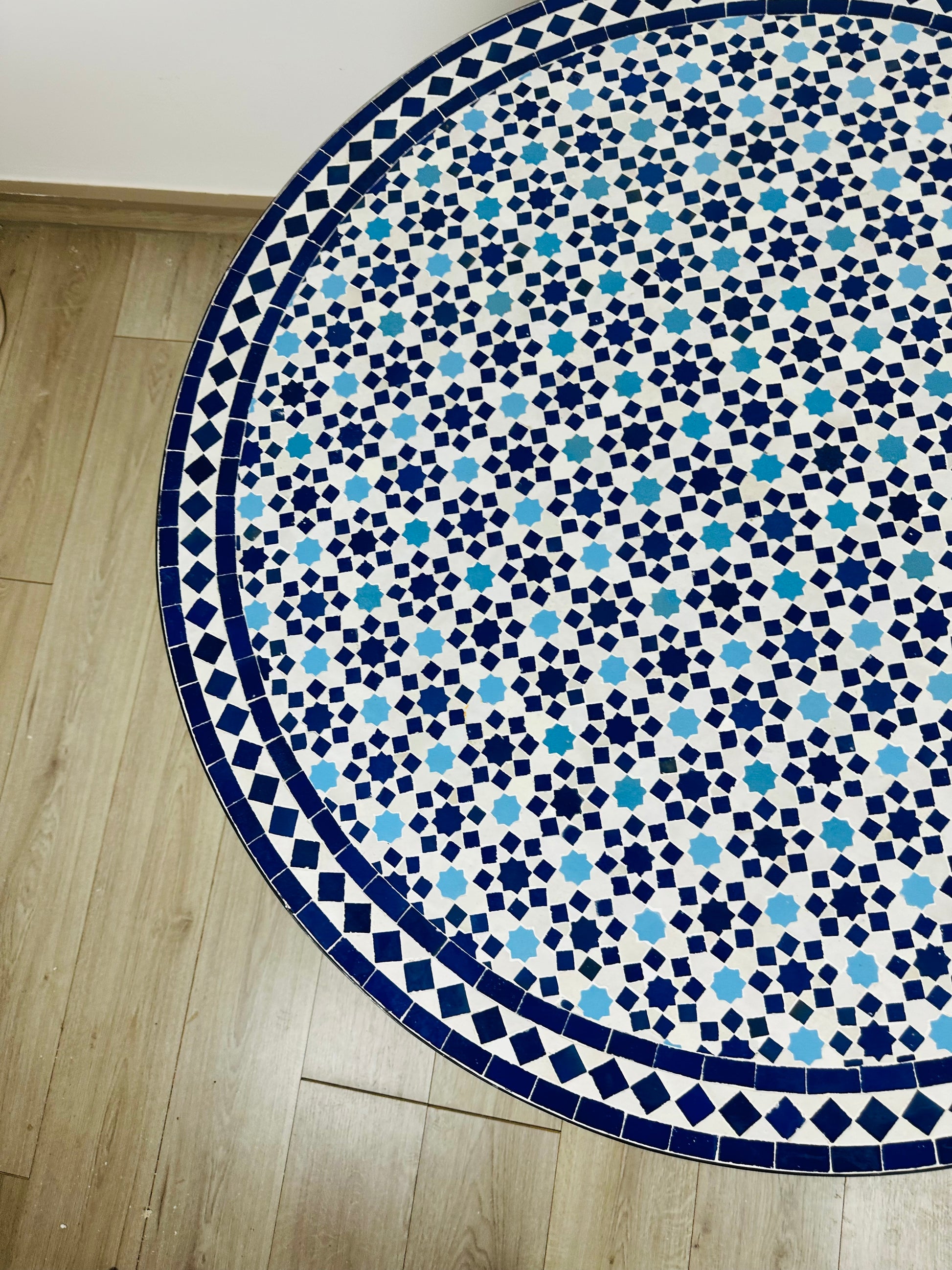 Immerse yourself in the intricate beauty of the Azure Star Mosaic Table, a handcrafted masterpiece featuring a delicate geometric starburst pattern in striking shades of deep blue and crisp white. Inspired by traditional Moroccan tilework, this table radiates elegance and symmetry, making it a timeless addition to any interior or outdoor space.