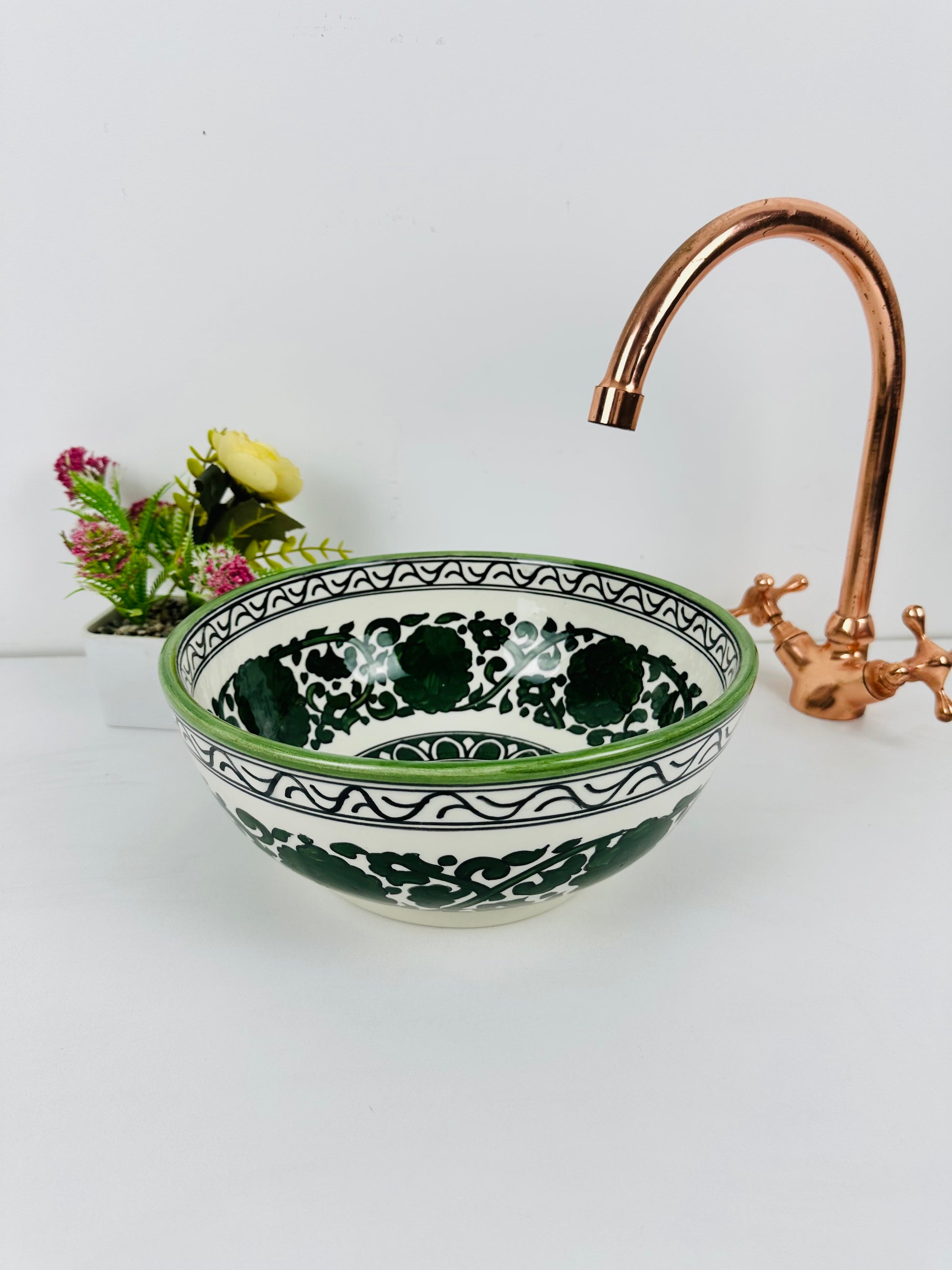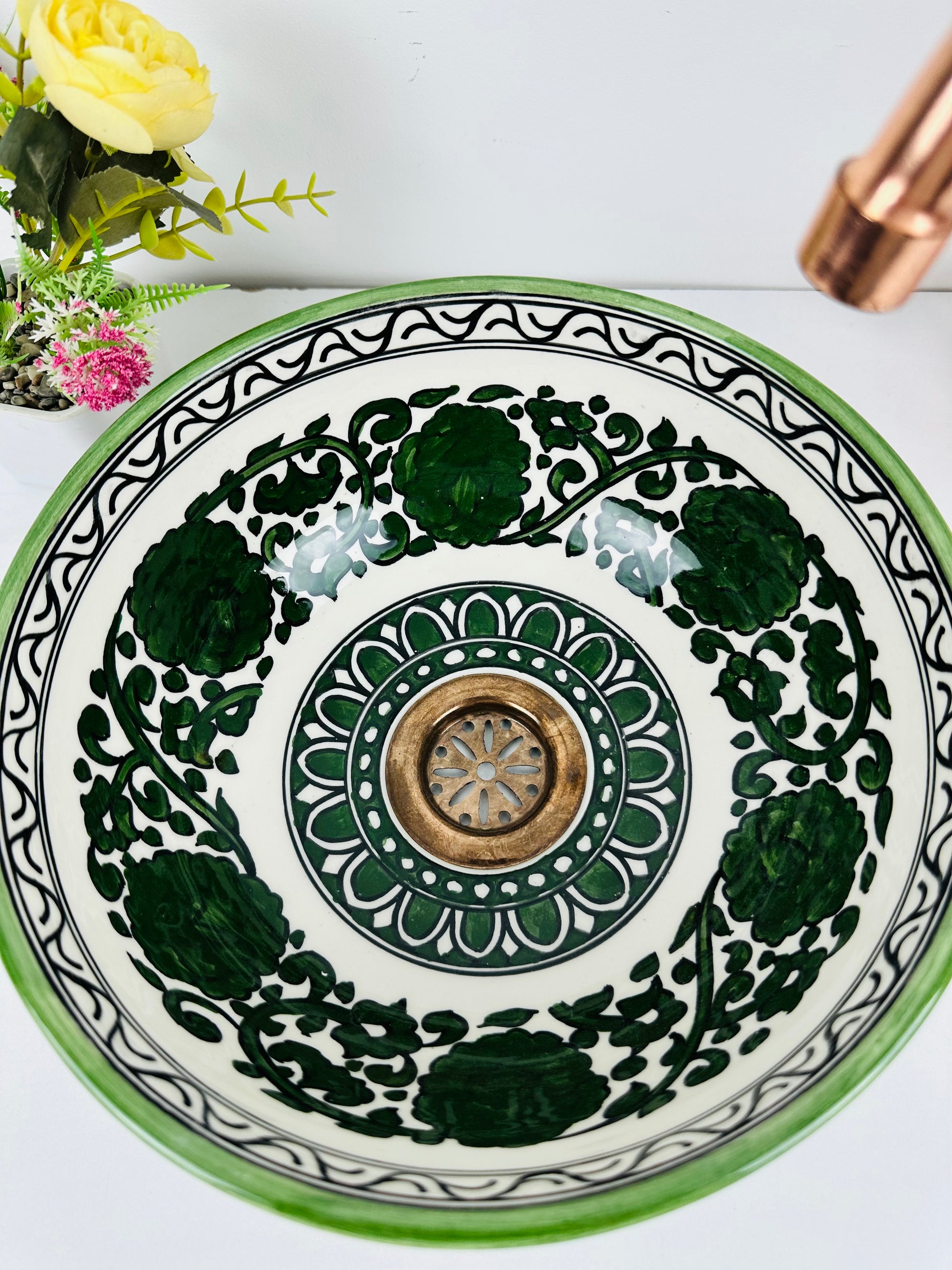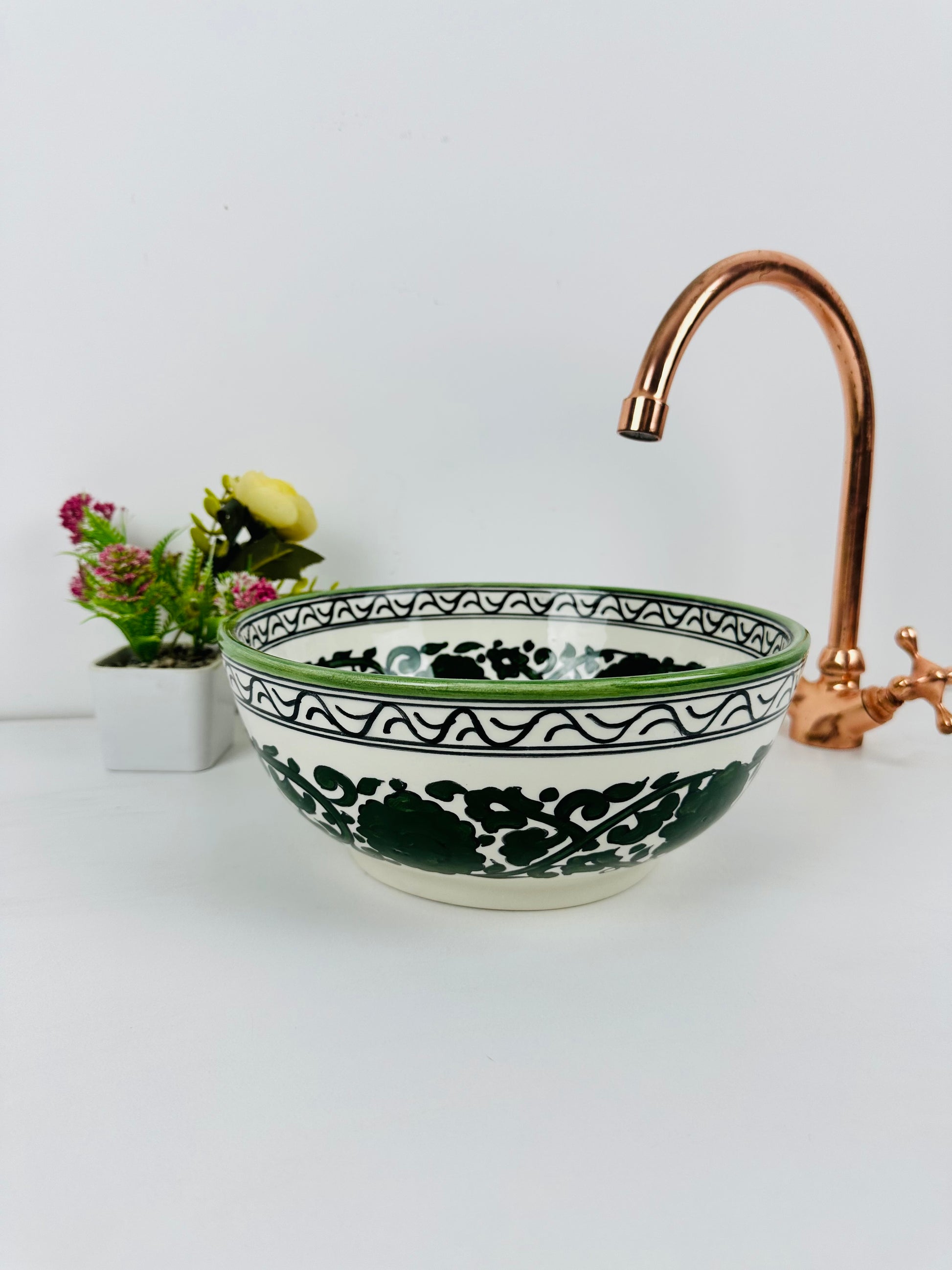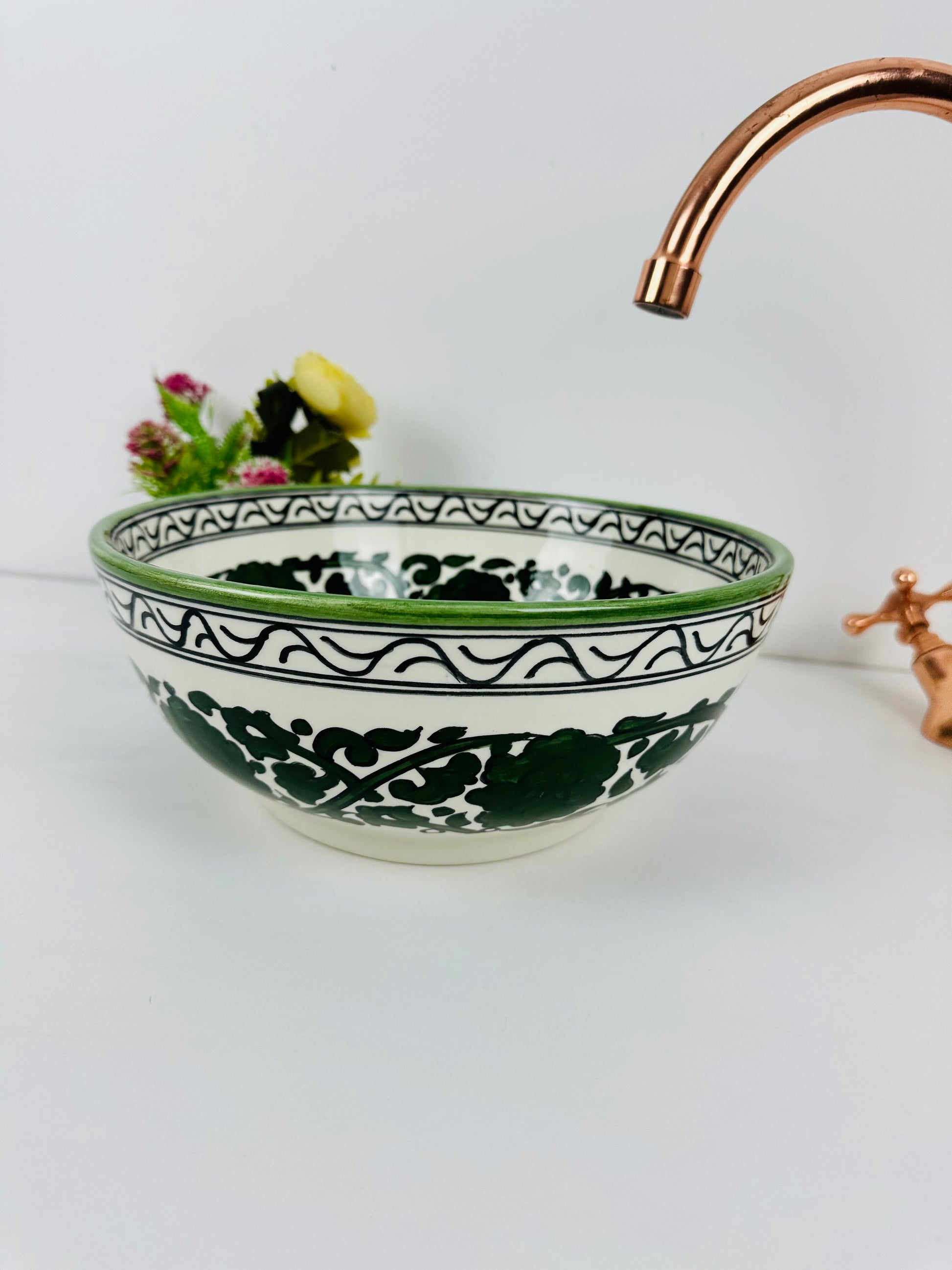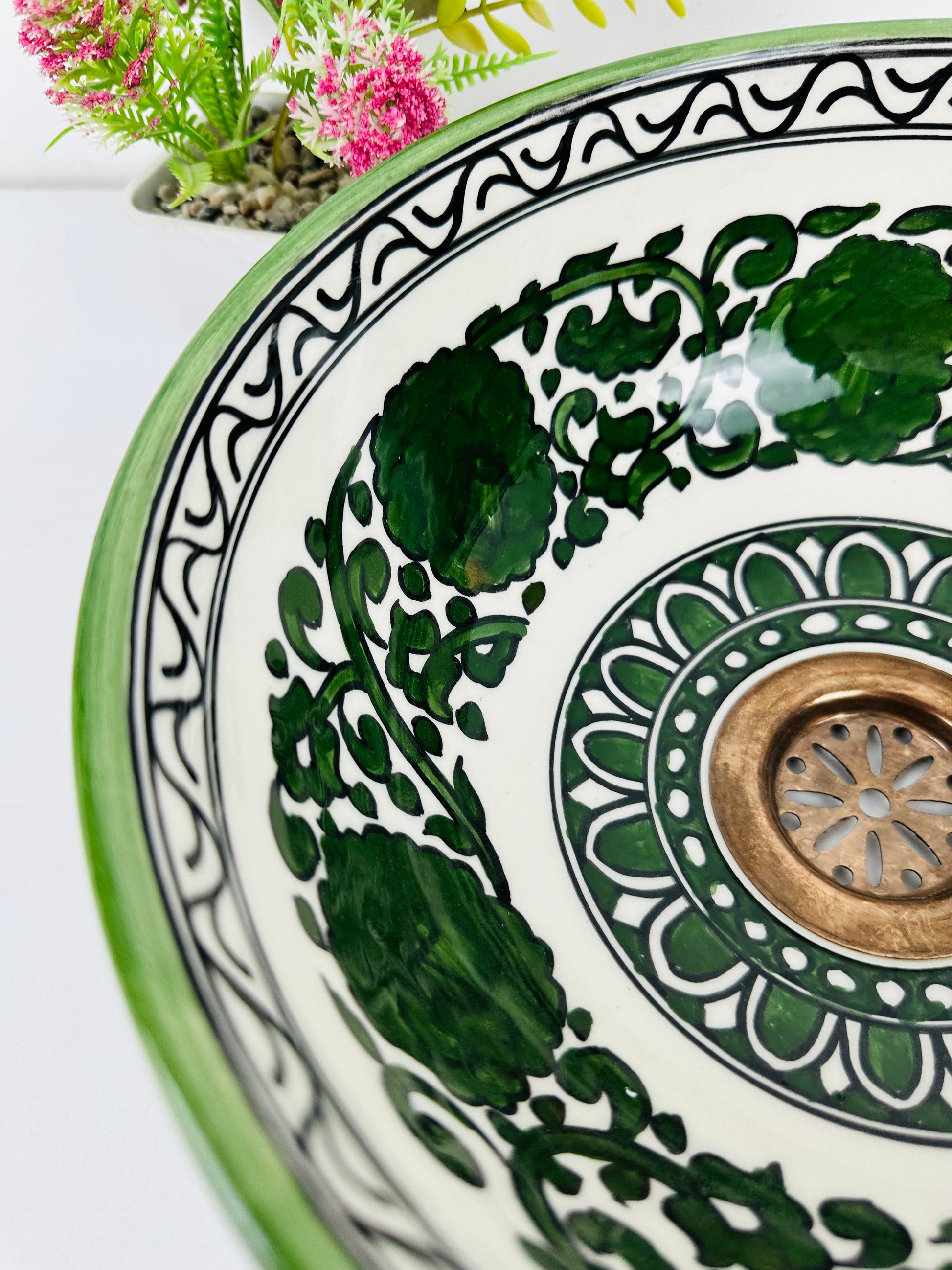 Enchanted Meadow: Handcrafted Ceramic Sink with Dark Green Flowers and Garden Motif