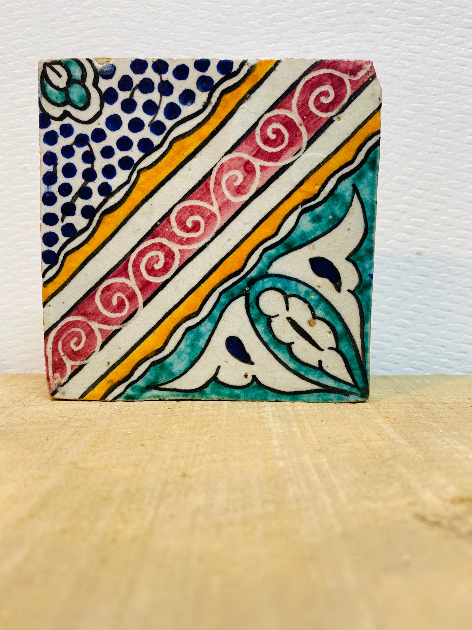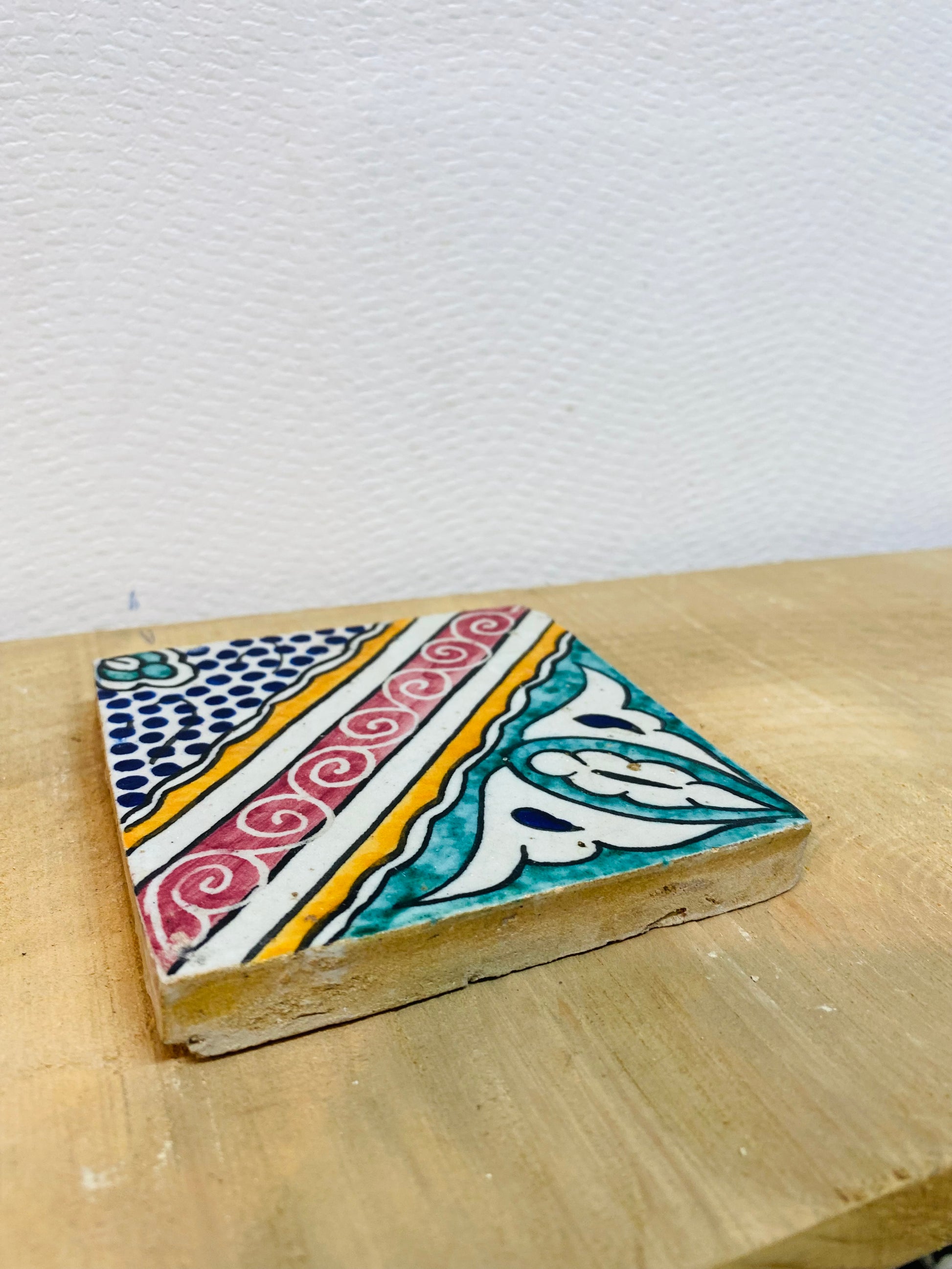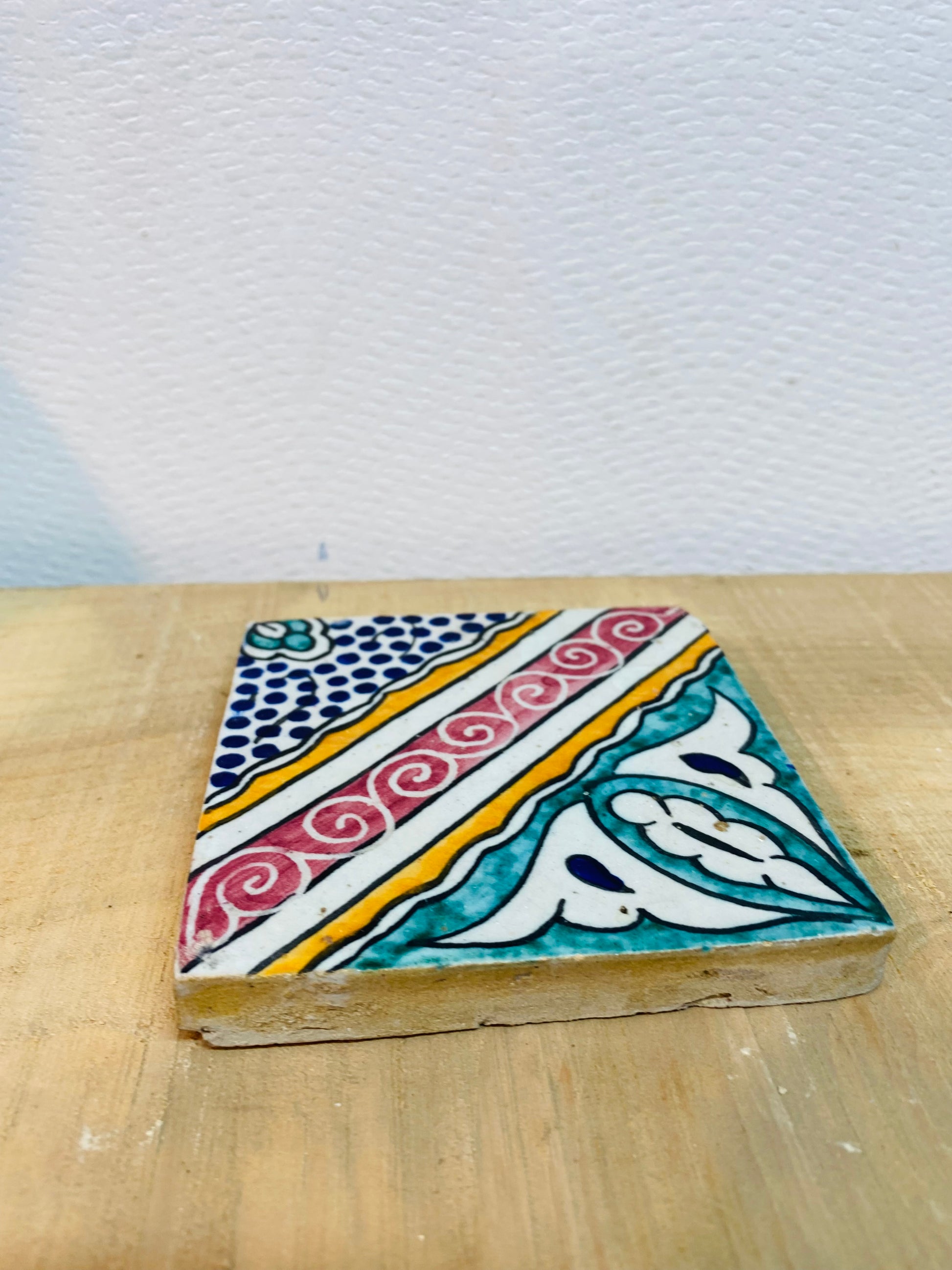 The Andalusian Charm Moroccan Zellige Tile is a mesmerizing blend of geometric elegance and floral inspiration, reflecting the influence of Andalusian and Moorish artistry. Featuring vibrant swirling burgundy bands, deep blue dotted patterns, and intricate turquoise floral motifs, this handmade and hand-painted tile evokes a sense of history and sophistication. The dynamic diagonal design adds a unique perspective and movement, making it ideal for accent walls, backsplashes, and feature installations.