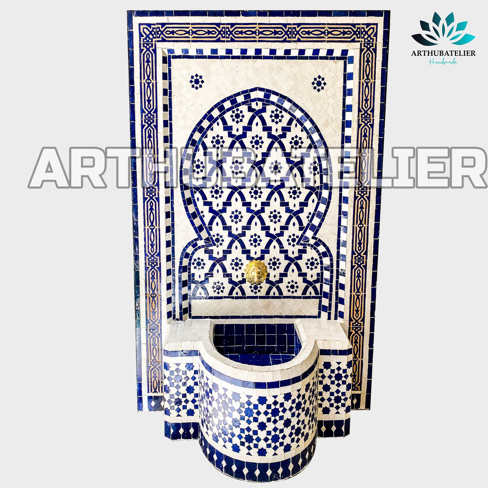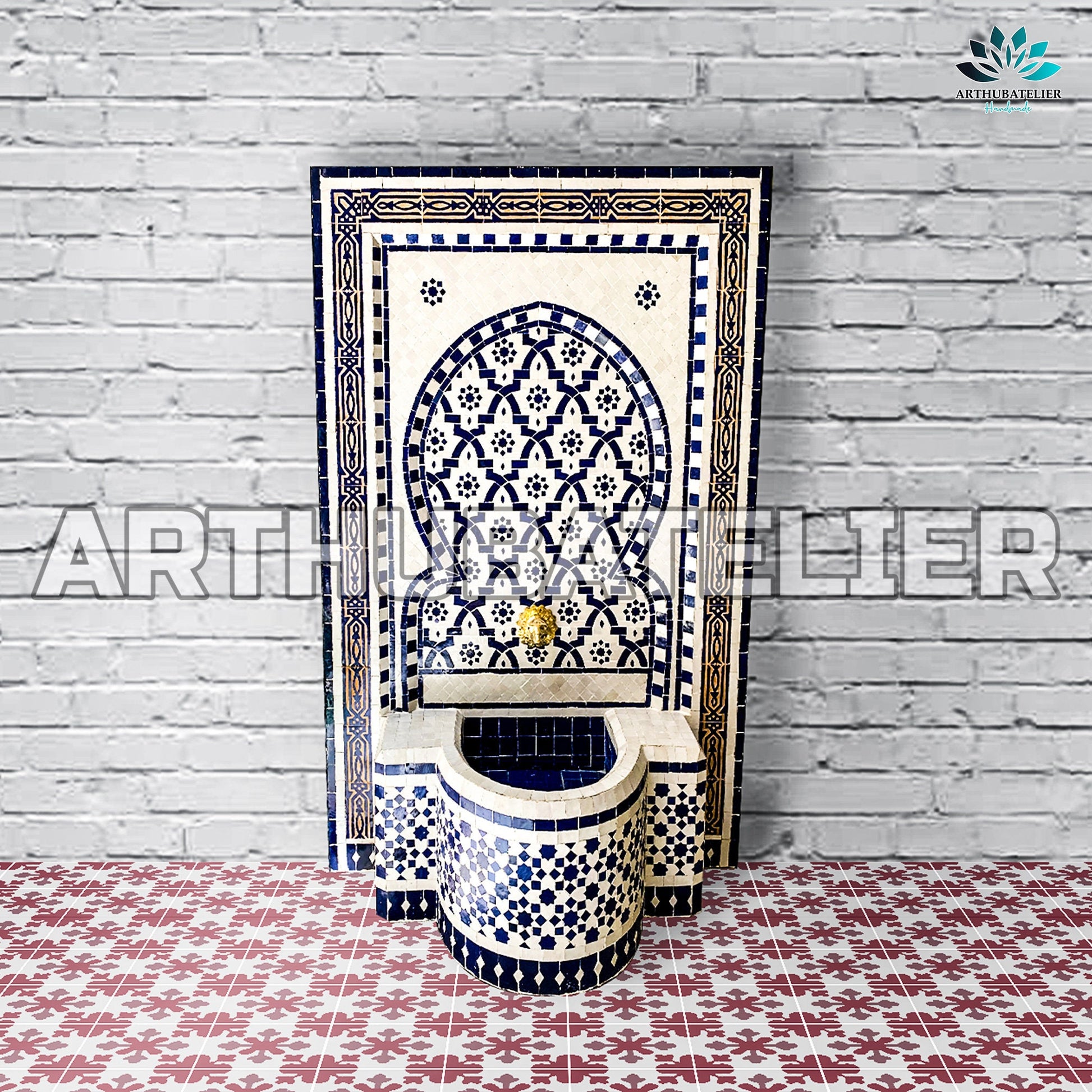 This stunning Moroccan fountain captures the essence of traditional Moorish design, featuring a mesmerizing mosaic of hand-cut Zellige tiles in deep blues, whites, and hints of black. The intricate patterns and the iconic horseshoe arch design make it a true masterpiece of Moroccan craftsmanship.