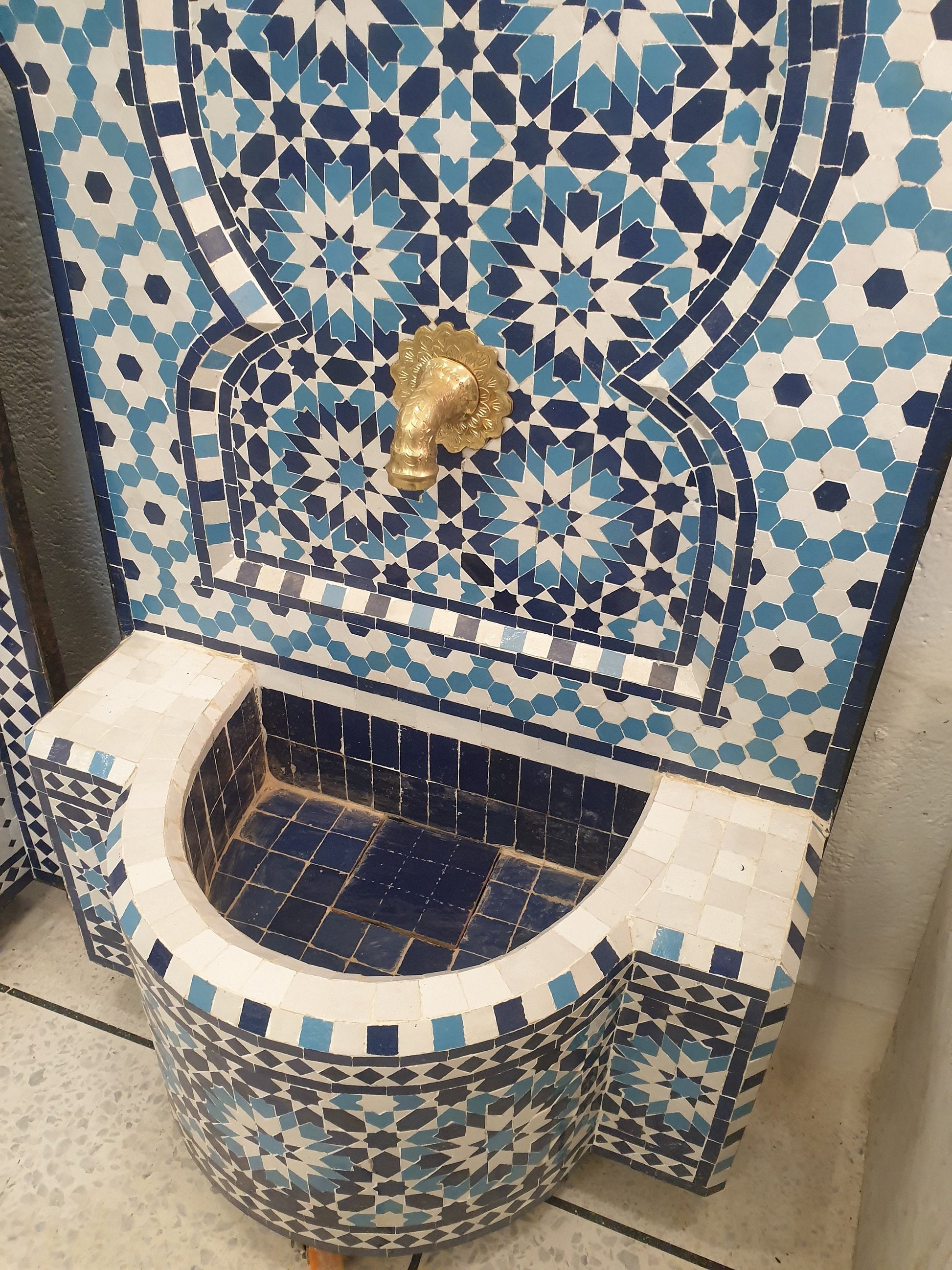 This stunning Moroccan fountain captures the essence of traditional Moorish design, featuring a mesmerizing mosaic of hand-cut Zellige tiles in deep blues, whites, and hints of black. The intricate patterns and the iconic horseshoe arch design make it a true masterpiece of Moroccan craftsmanship.
