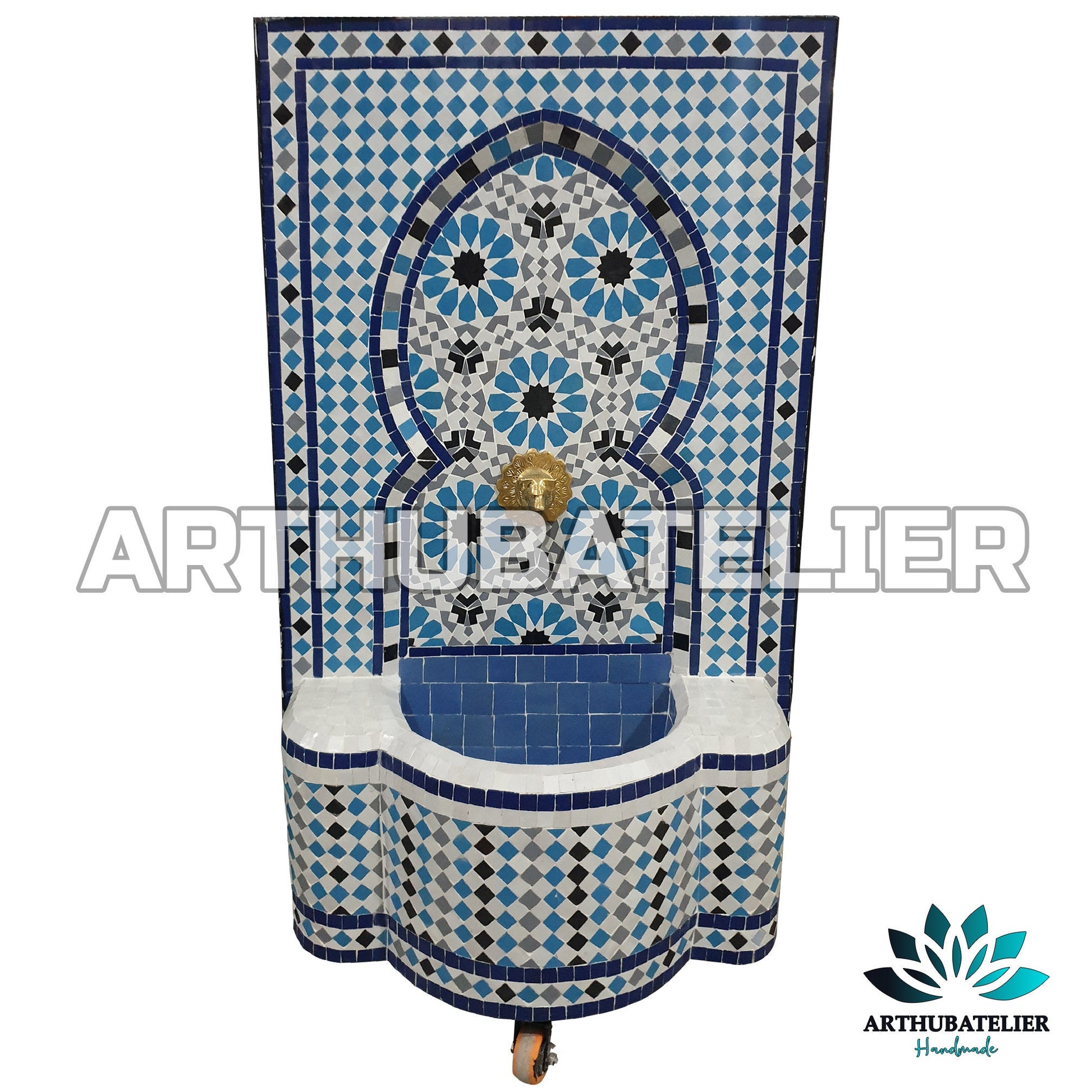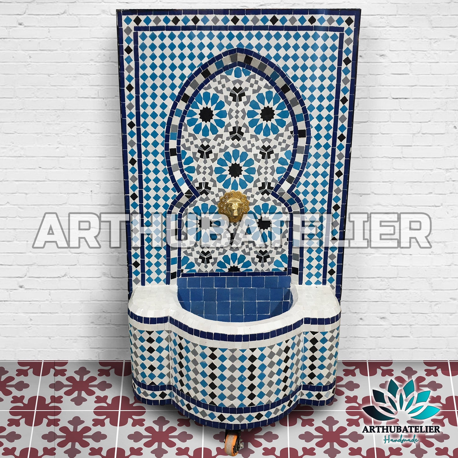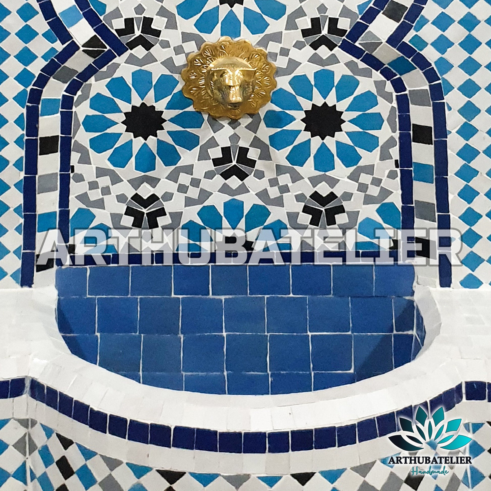 Add a touch of Moroccan elegance to your space with this stunning handcrafted Zellige fountain. Featuring a classic blue and white geometric mosaic, this piece is a true work of art, handcrafted by skilled artisans using authentic Moroccan tiles and a luxurious brass lion-head faucet. Perfect for gardens, patios, courtyards, and interiors, it offers both beauty and functionality.