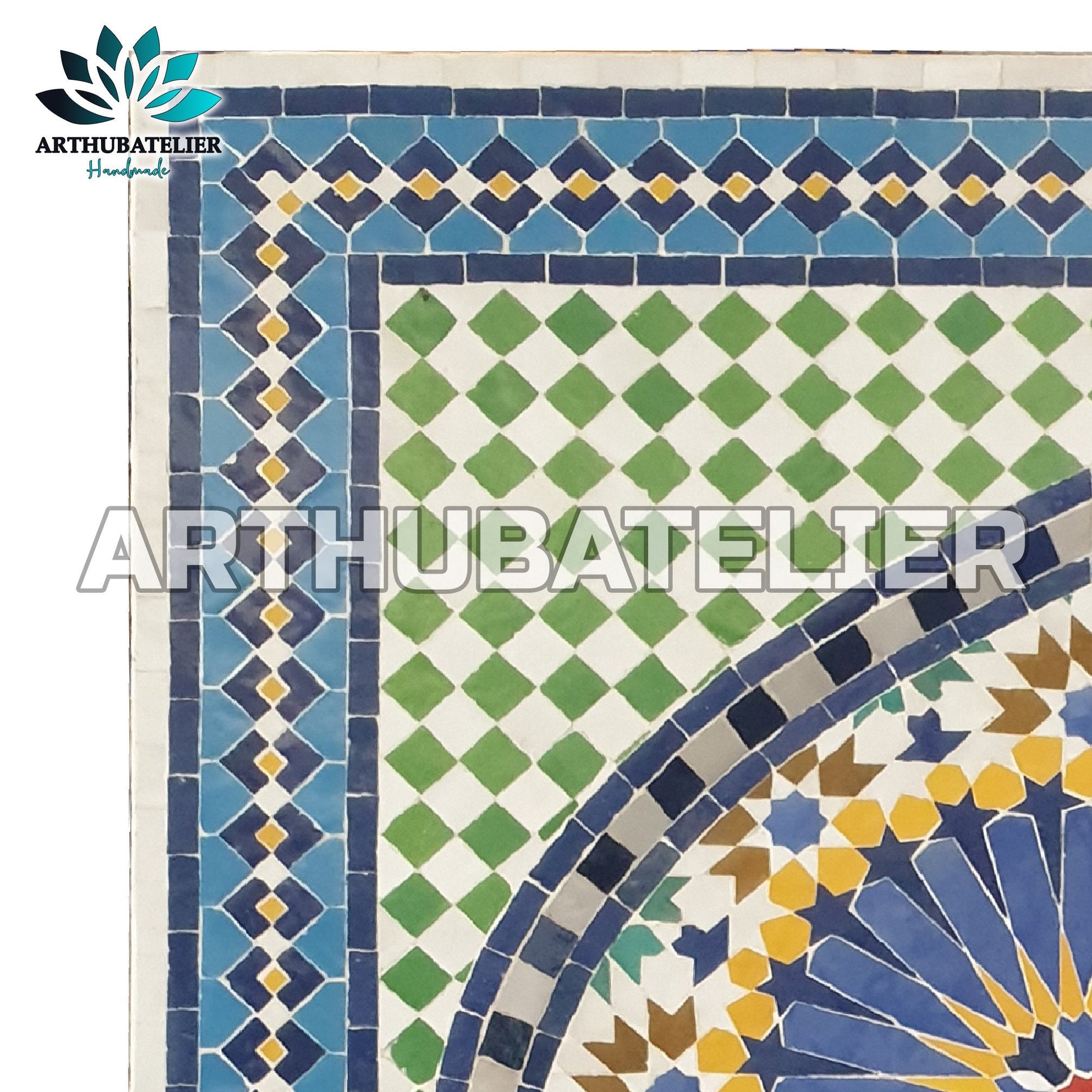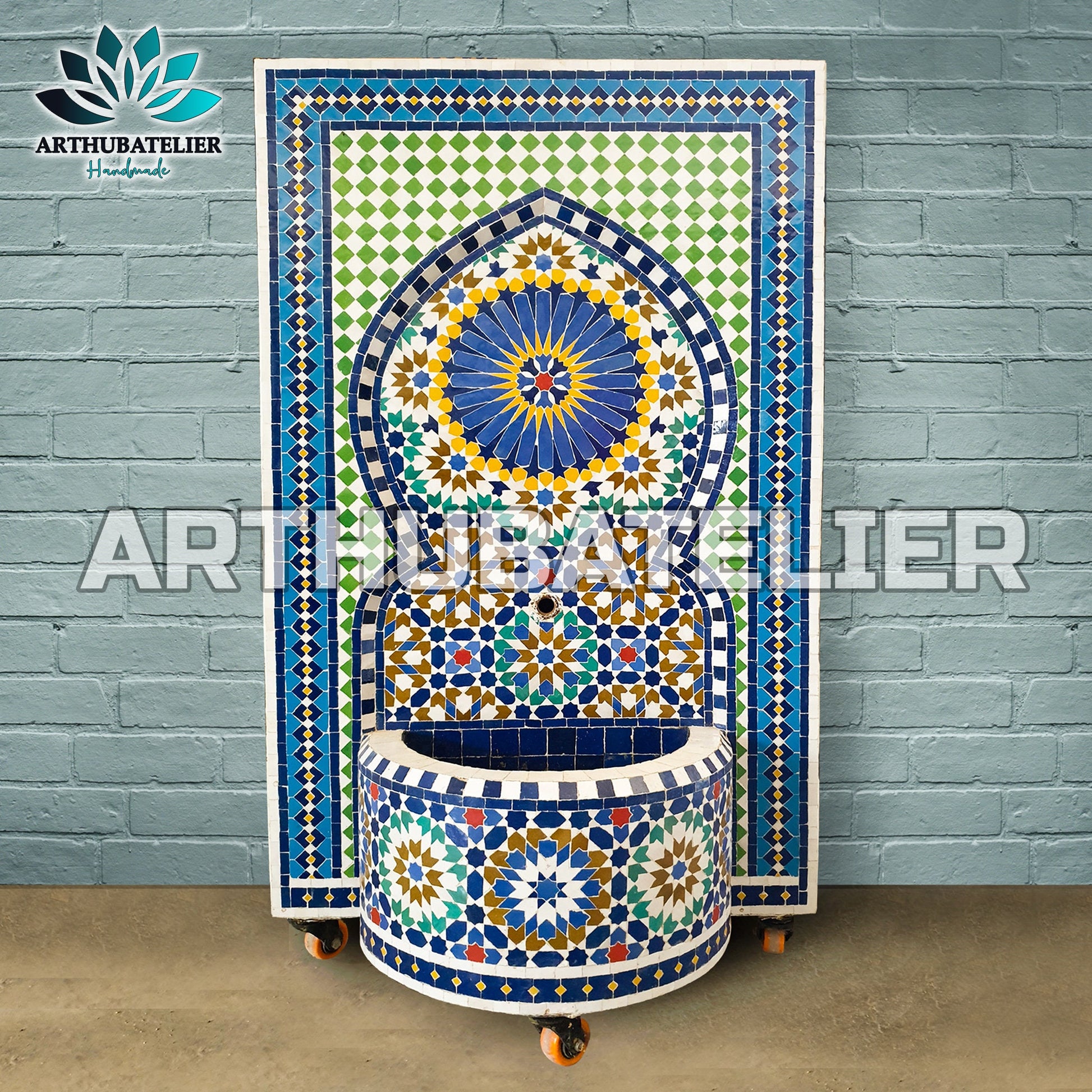 Enhance your space with this exquisite Moroccan Zellige fountain, a true masterpiece of craftsmanship. Featuring a vibrant geometric pattern in shades of blue, green, and earthy tones, this fountain is perfect for both indoor and outdoor settings.