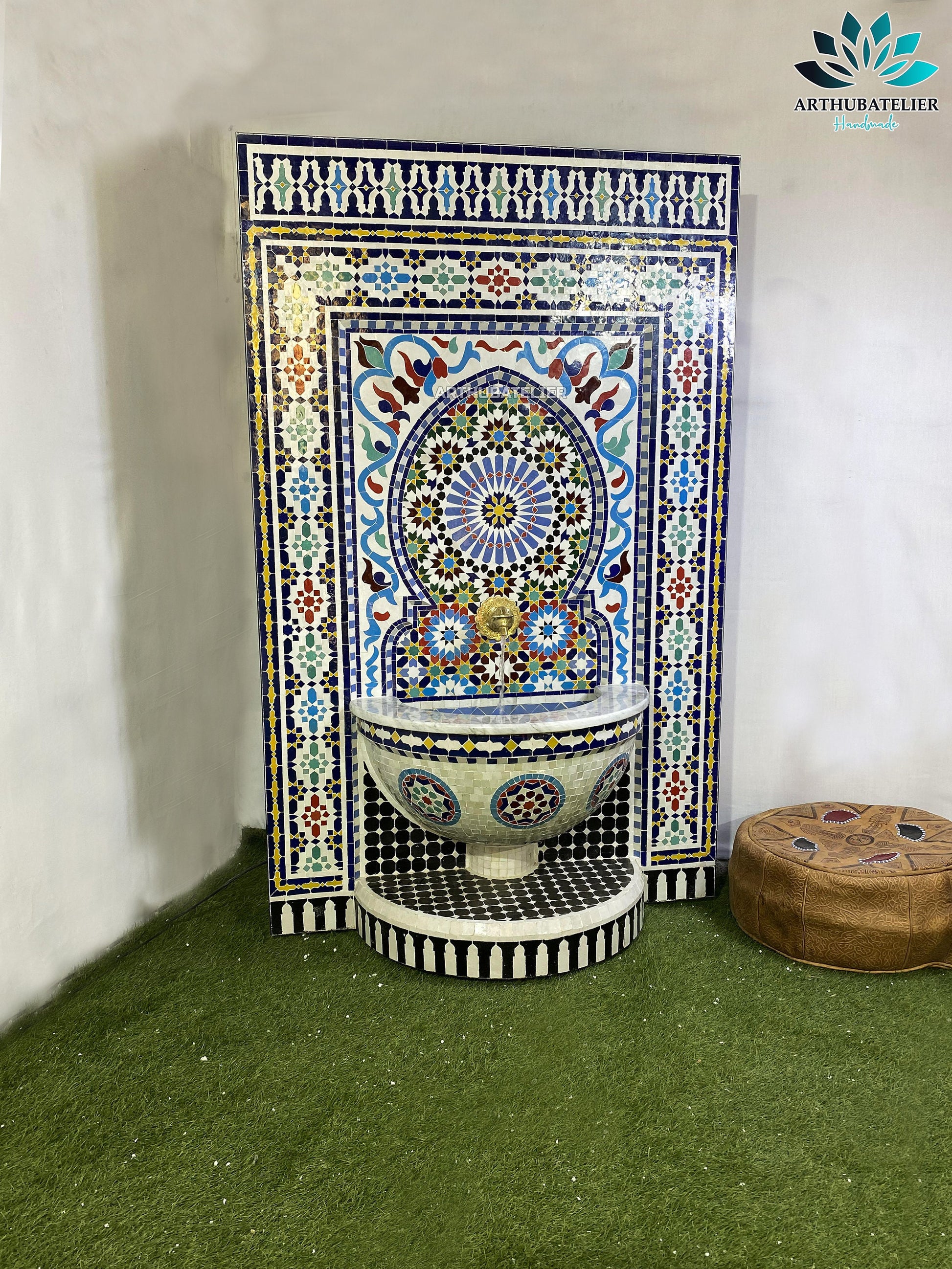 Enhance your home or garden with this stunning Moroccan mosaic fountain, handcrafted with traditional Zellige tiles and a luxurious brass spout. This exquisite piece showcases a vibrant Moorish design, with geometric patterns in blue, yellow, and earthy tones, making it a perfect statement of Moroccan elegance.