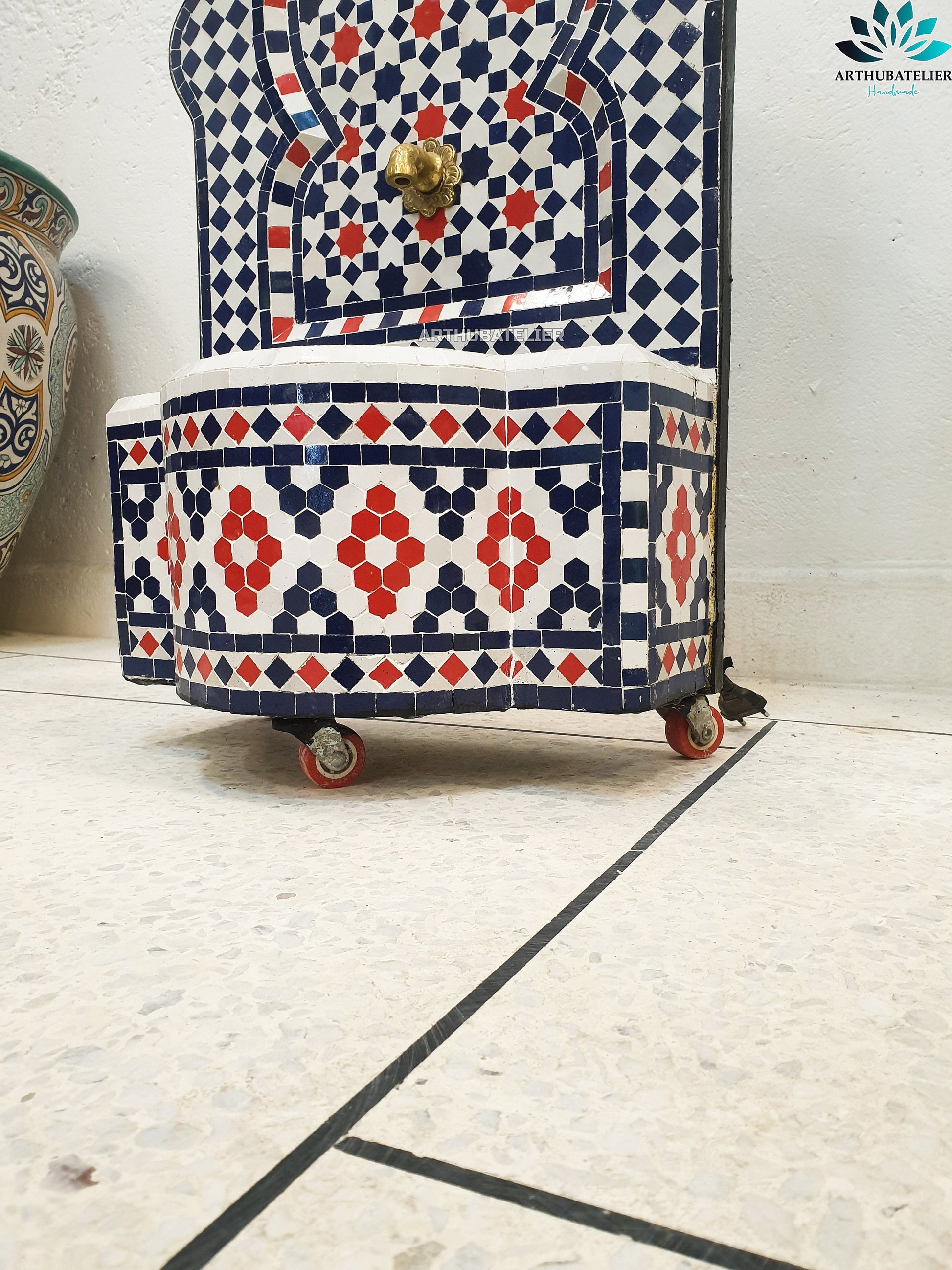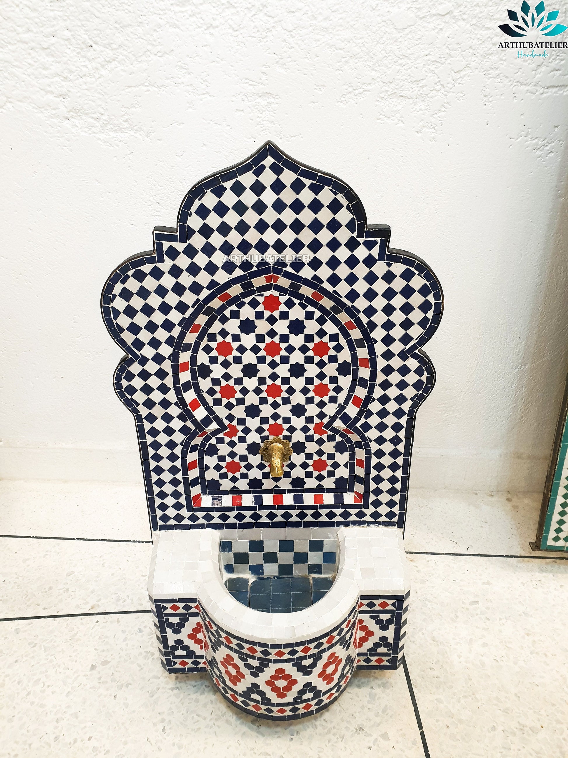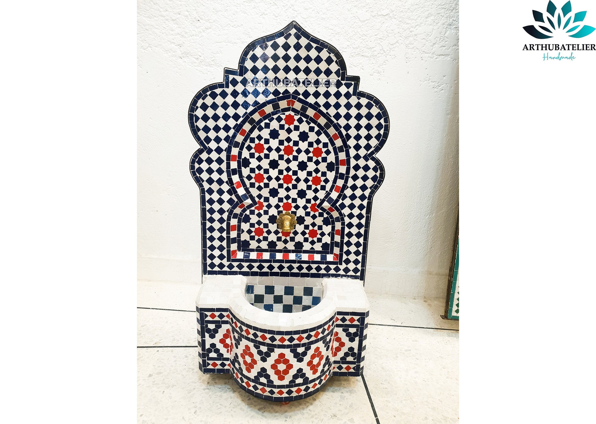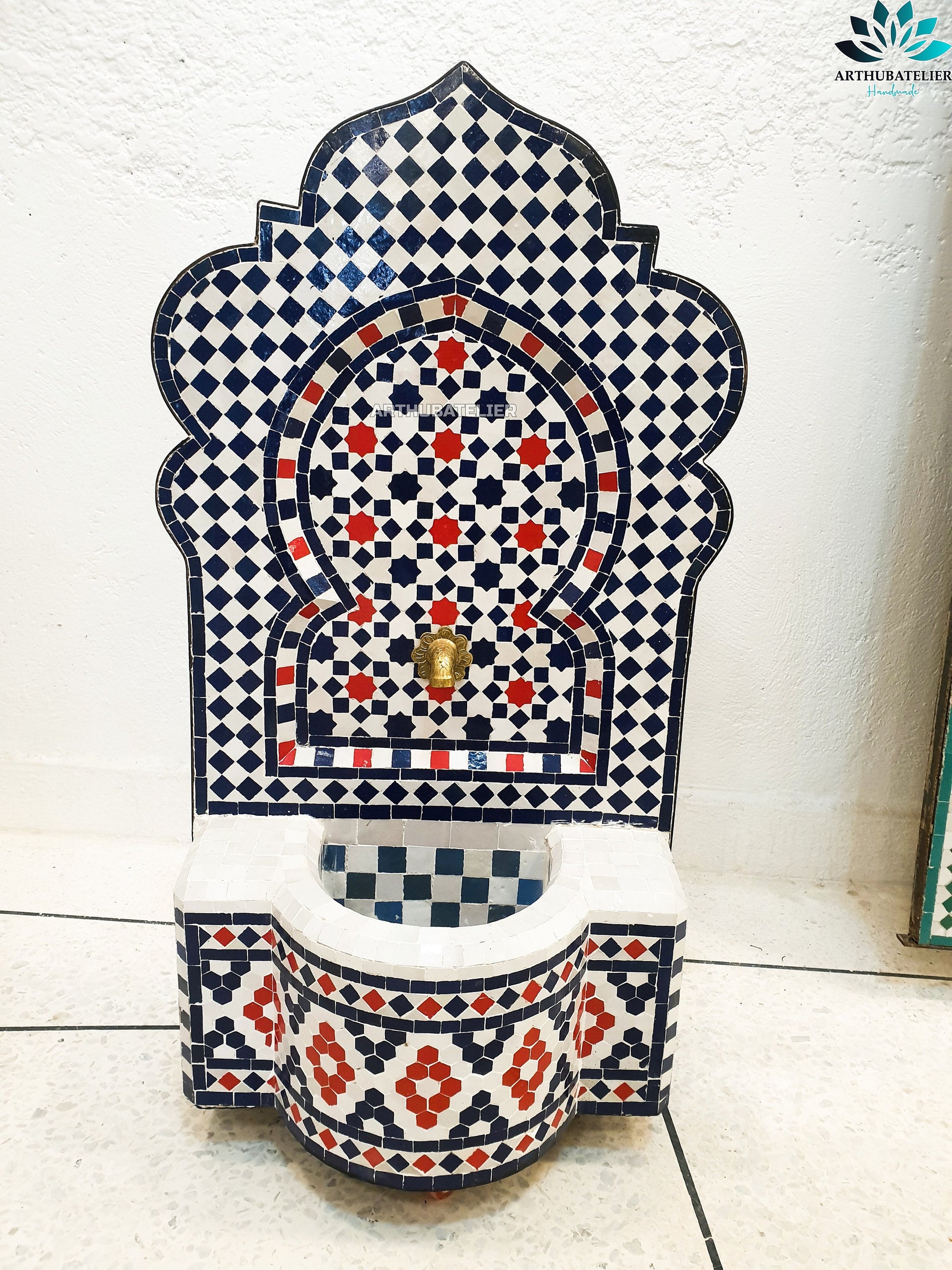 Moroccan Zellige Mosaic Fountain – Red, Blue & White Pattern