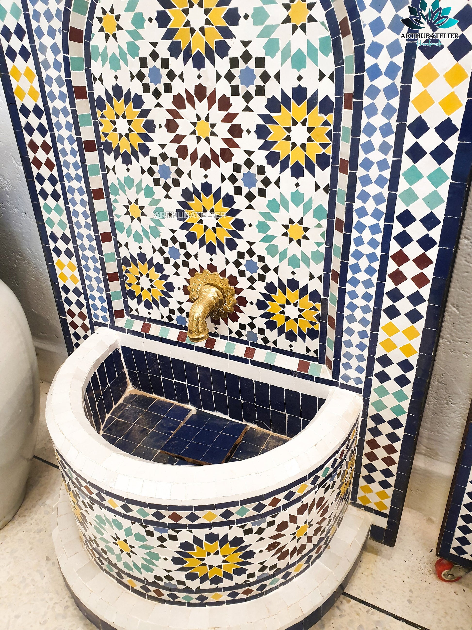 Infuse your space with the timeless elegance of Moroccan craftsmanship with this stunning handcrafted Zellige fountain. A true statement piece, this fountain features intricate geometric tilework, blending bold blues, yellows, greens, and earthy tones for a rich, traditional aesthetic.