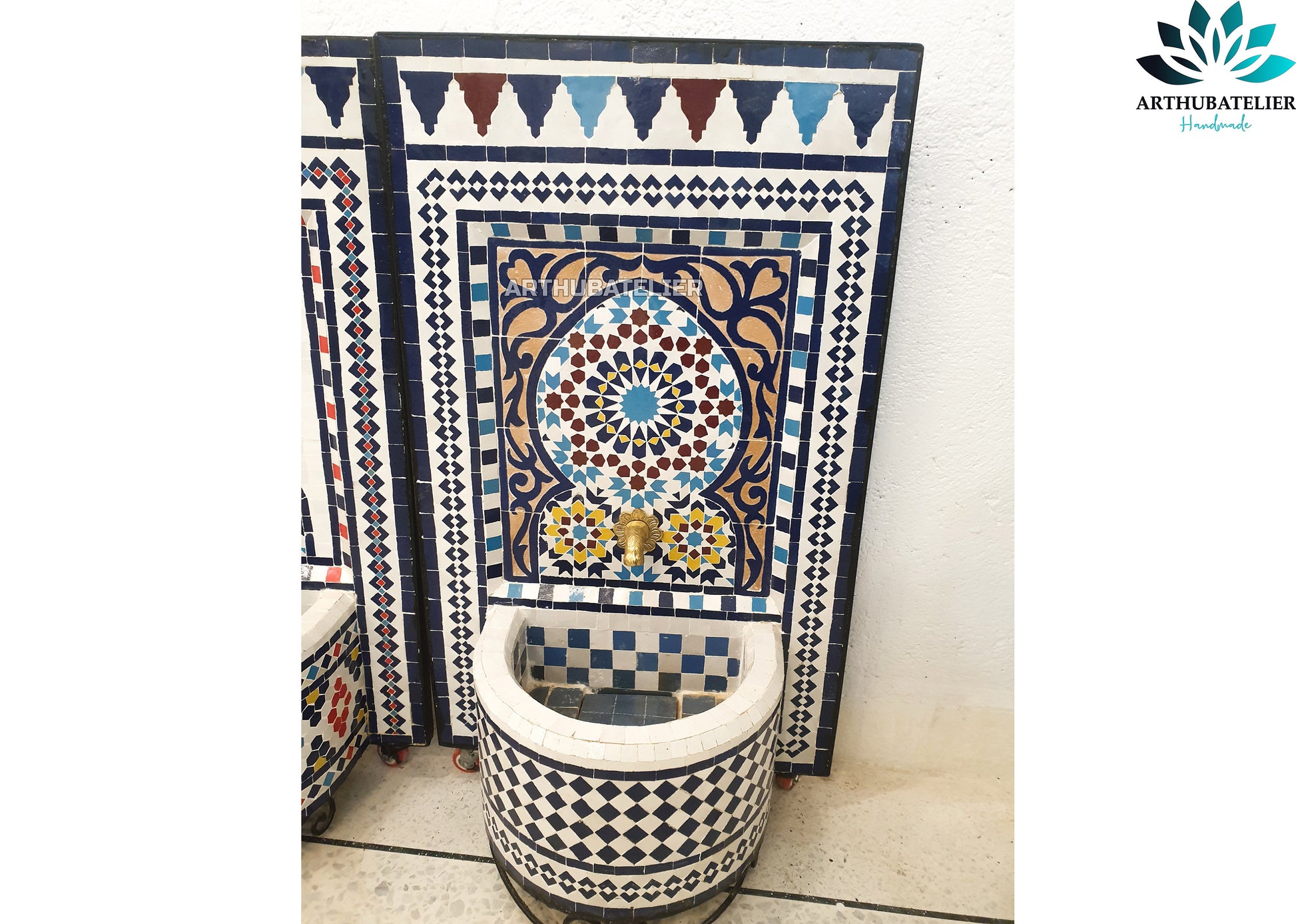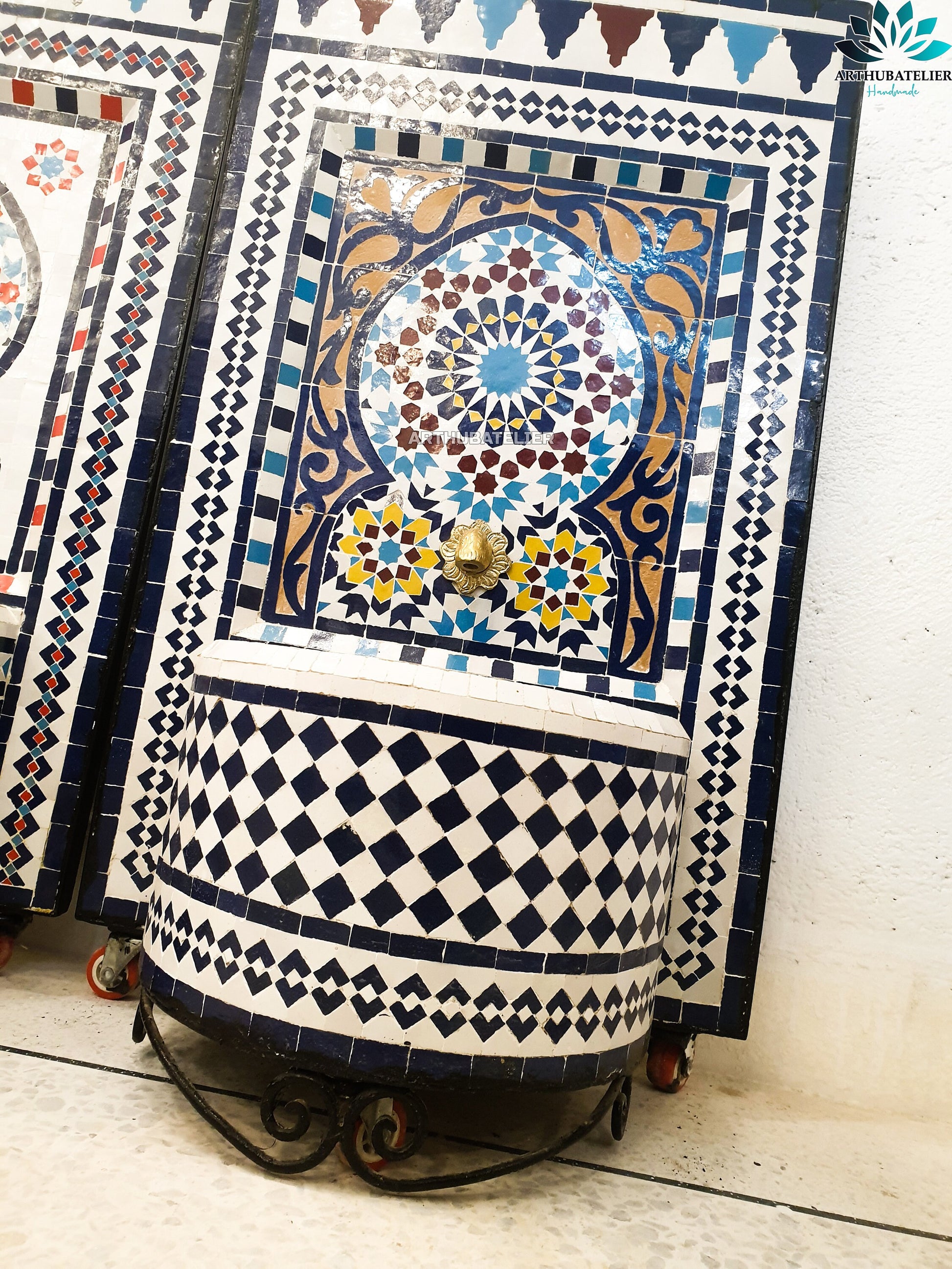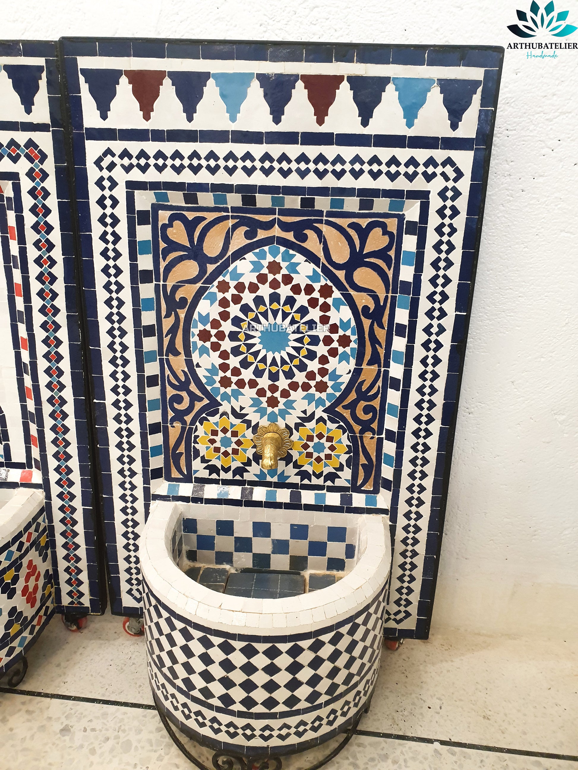 ✔ Authentic Moroccan Materials: Made with hand-cut Zellige tiles, natural clay, brass faucet, resin, and recycled iron