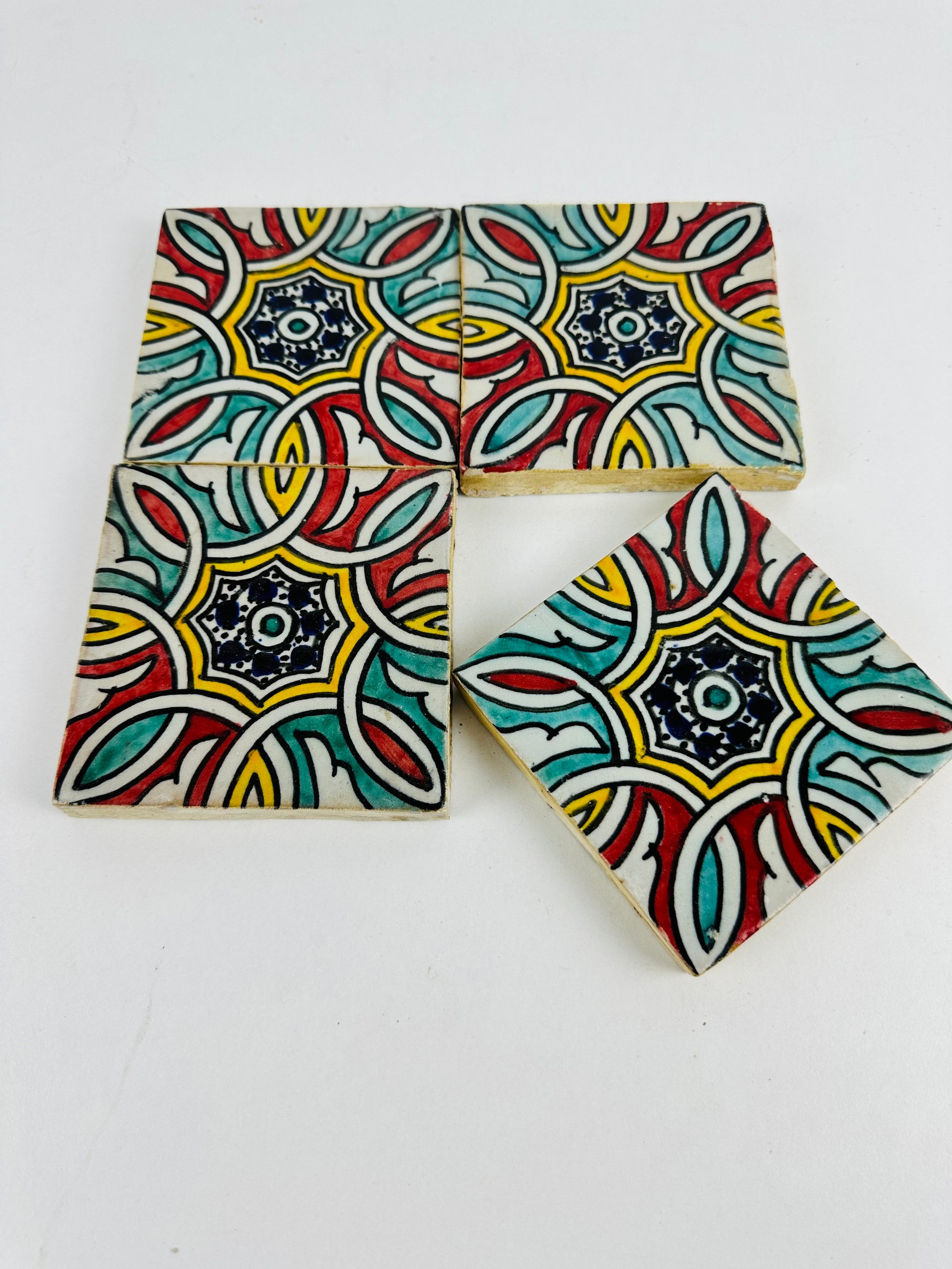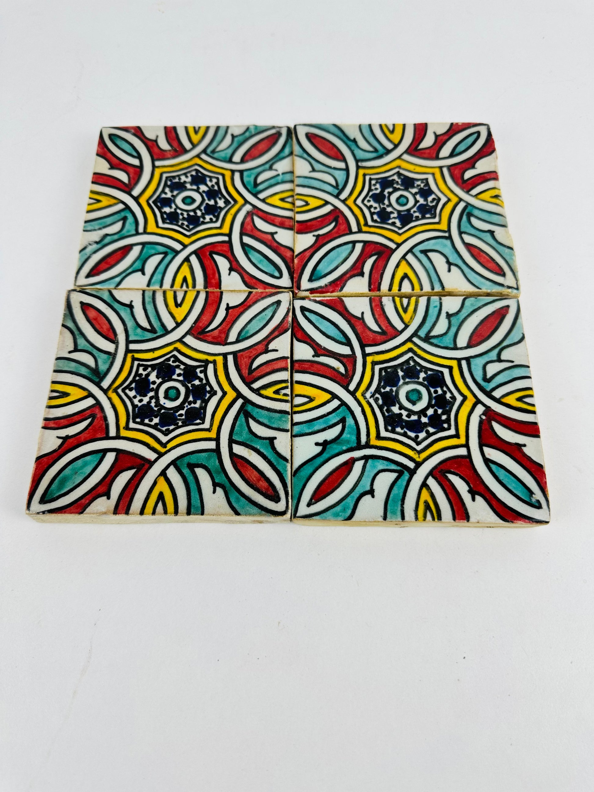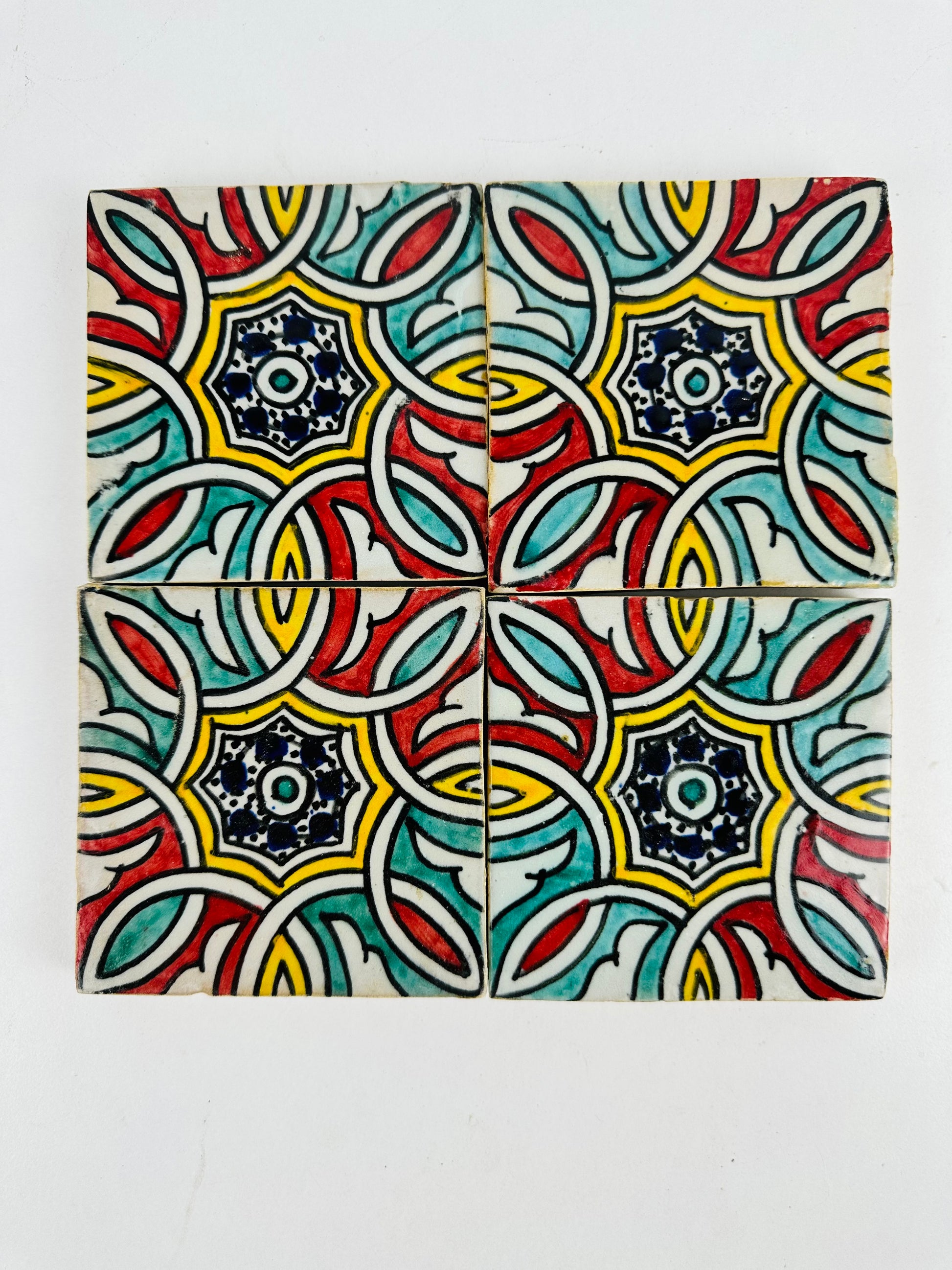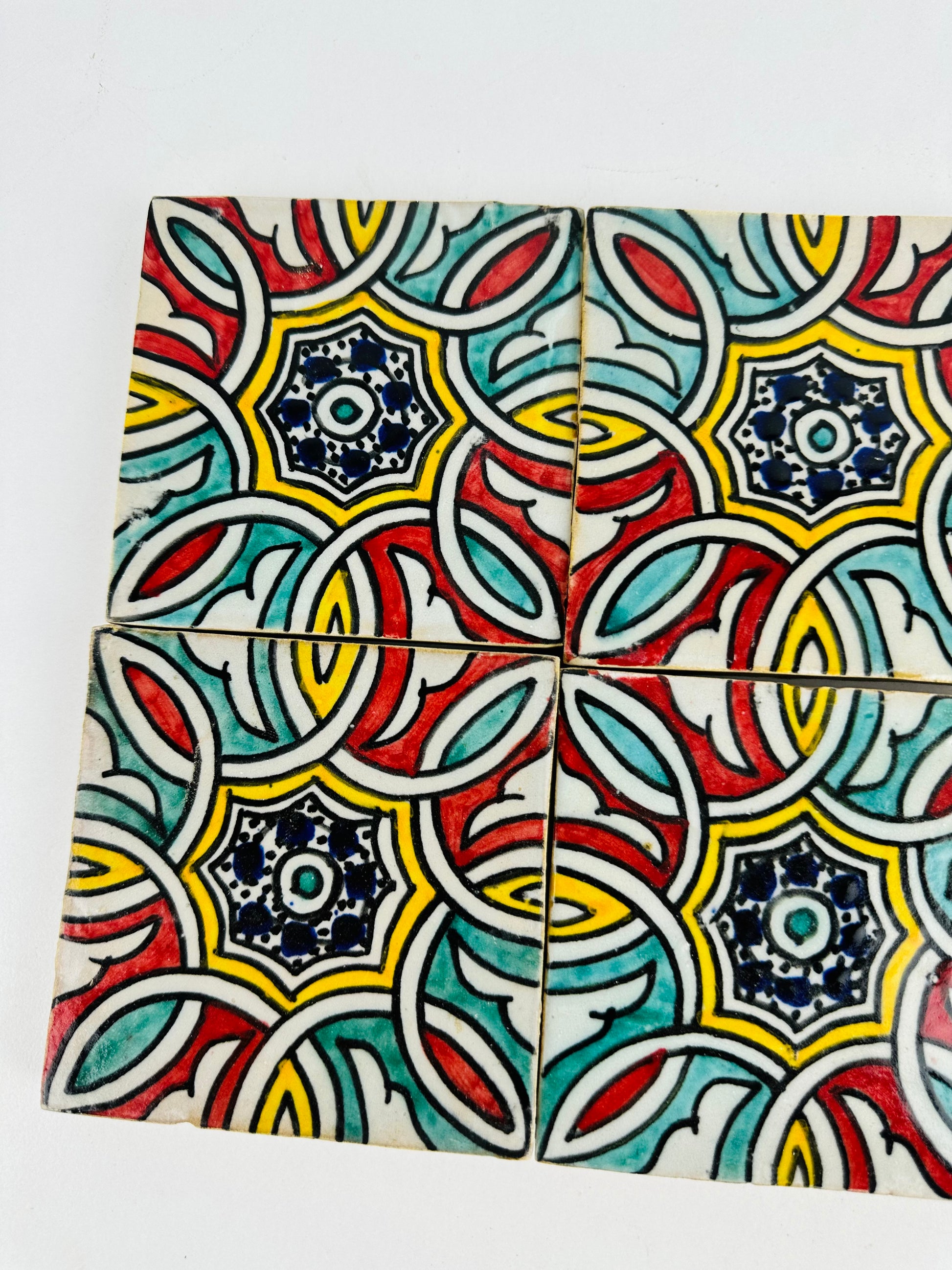 Inspired by the timeless elegance of Moroccan artistry, the Hand-Painted Moroccan Starburst Tile features an intricate interwoven floral motif that radiates from a central eight-pointed star. The vibrant red, teal, yellow, and deep navy blue hues create a striking contrast, making this tile a perfect choice for bold and dynamic interiors. The interlocking patterns evoke traditional Moroccan zellij craftsmanship, adding a touch of heritage and refinement to any space.