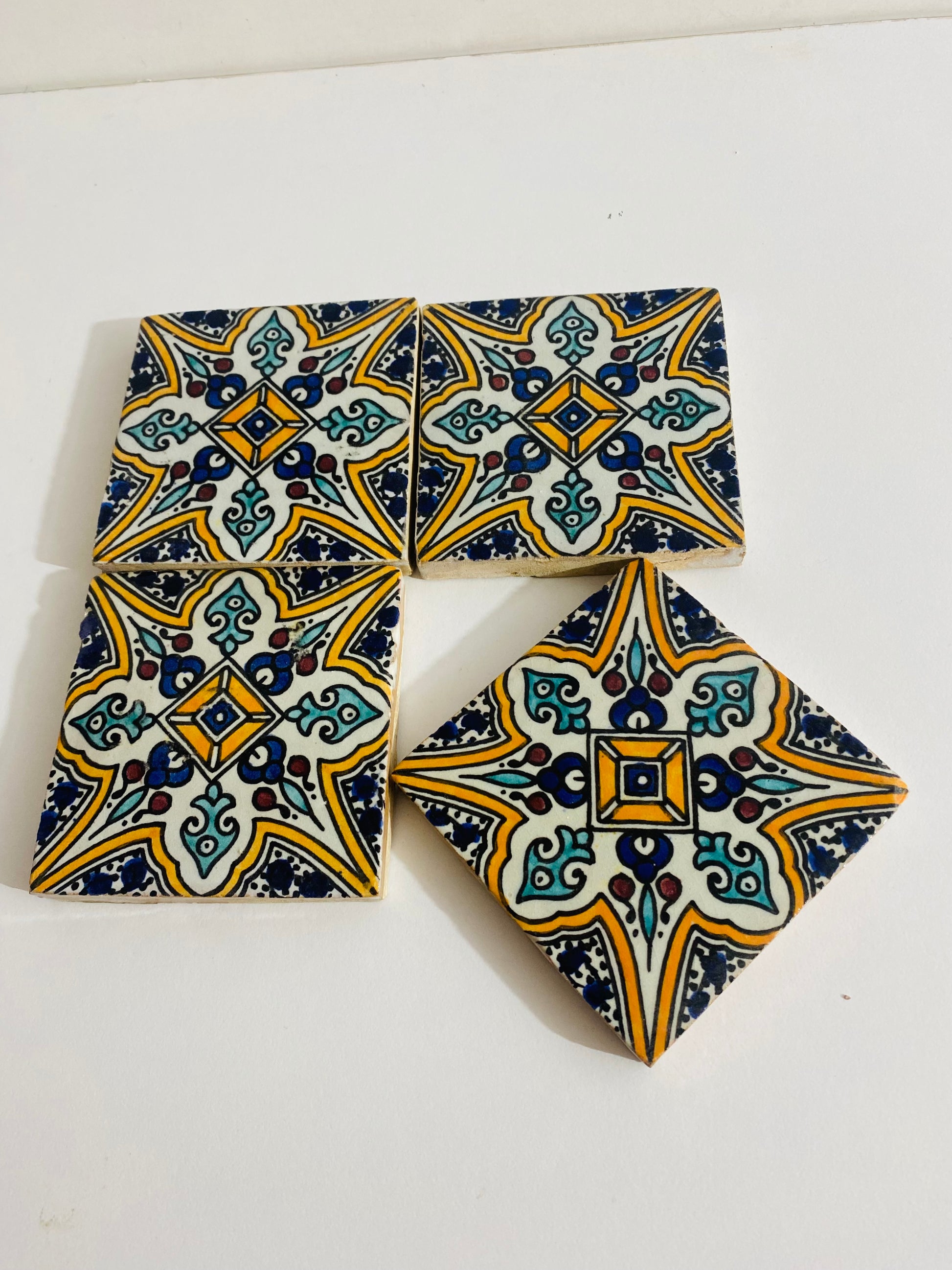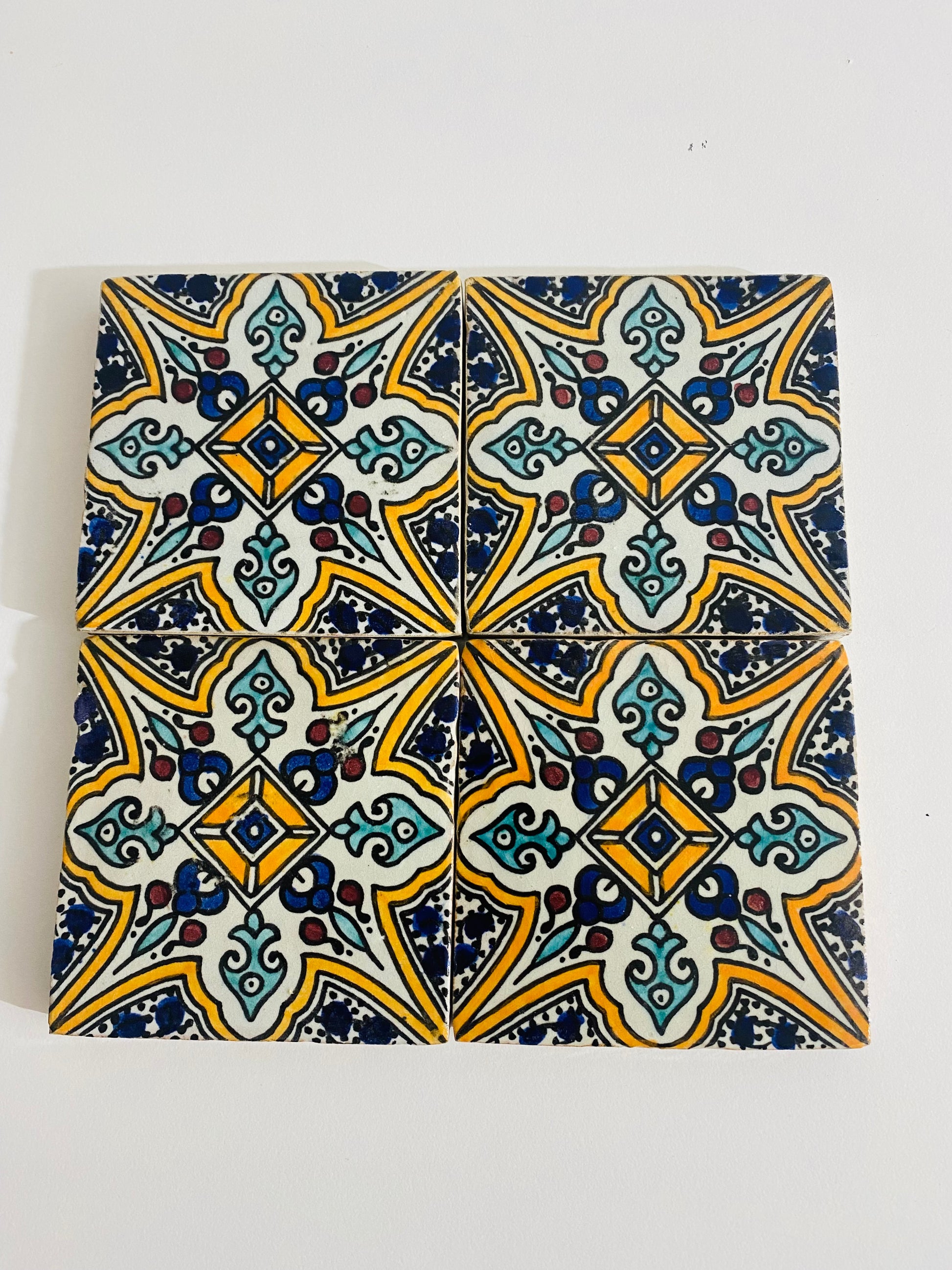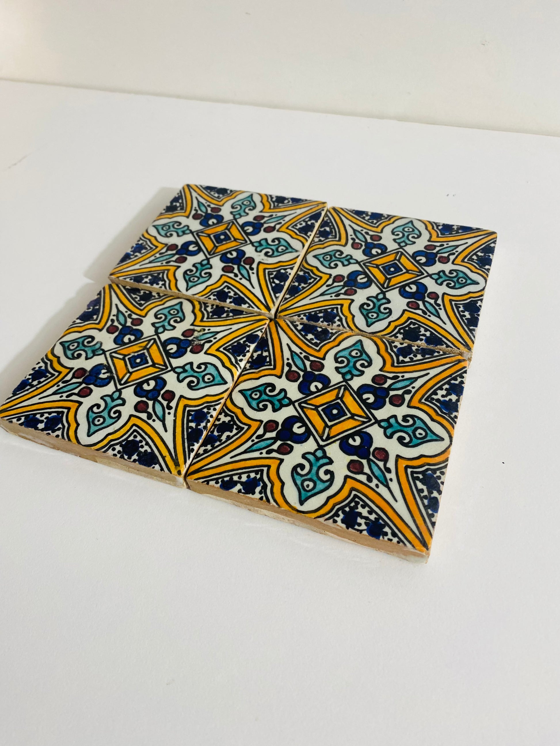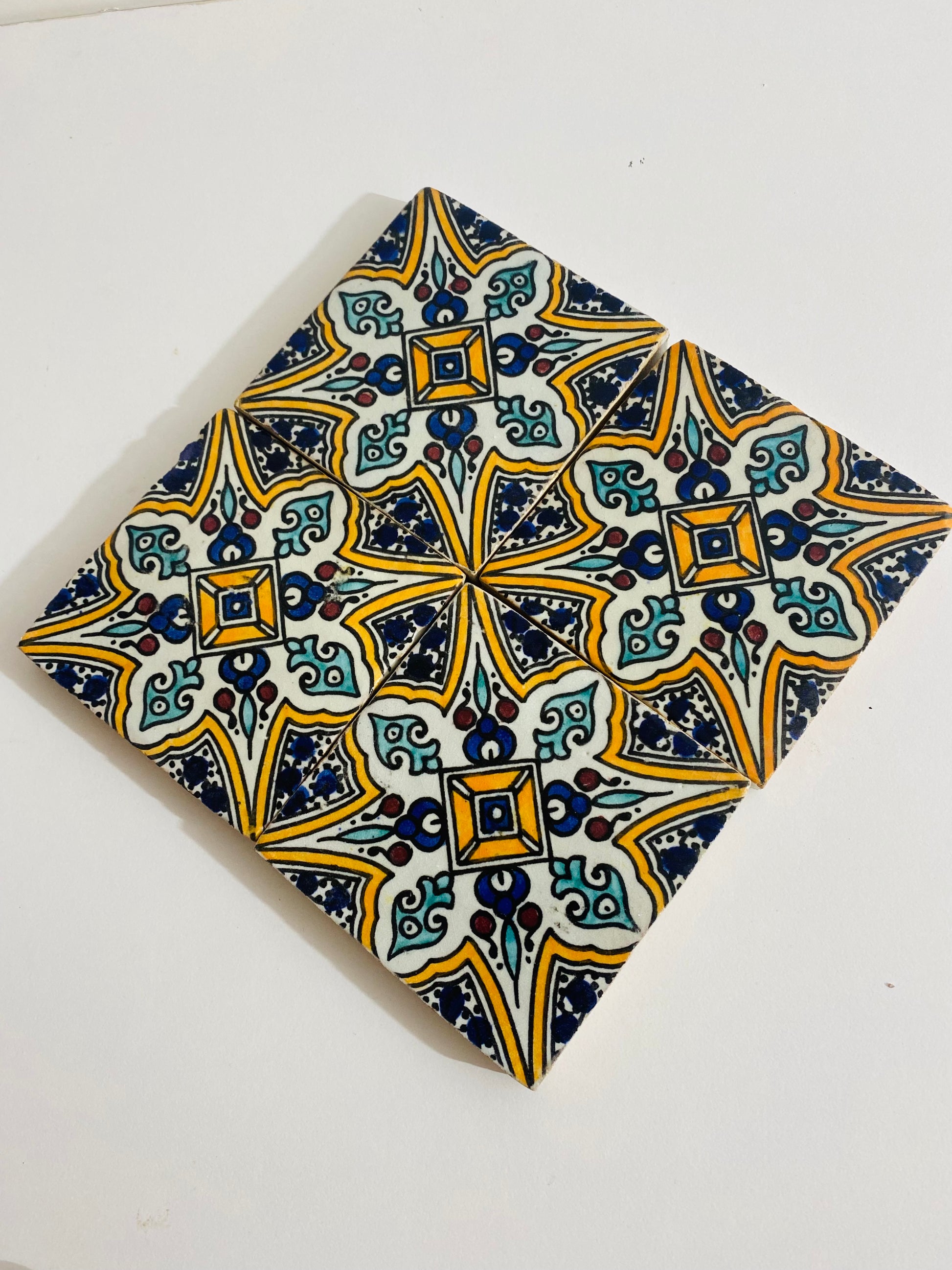 This Hand-Painted Moroccan Starburst Tile Set features an intricate blend of golden yellow, deep blue, and turquoise hues with geometric floral accents. The symmetrical pattern creates a harmonious, regal aesthetic, making it a stunning addition to any interior.