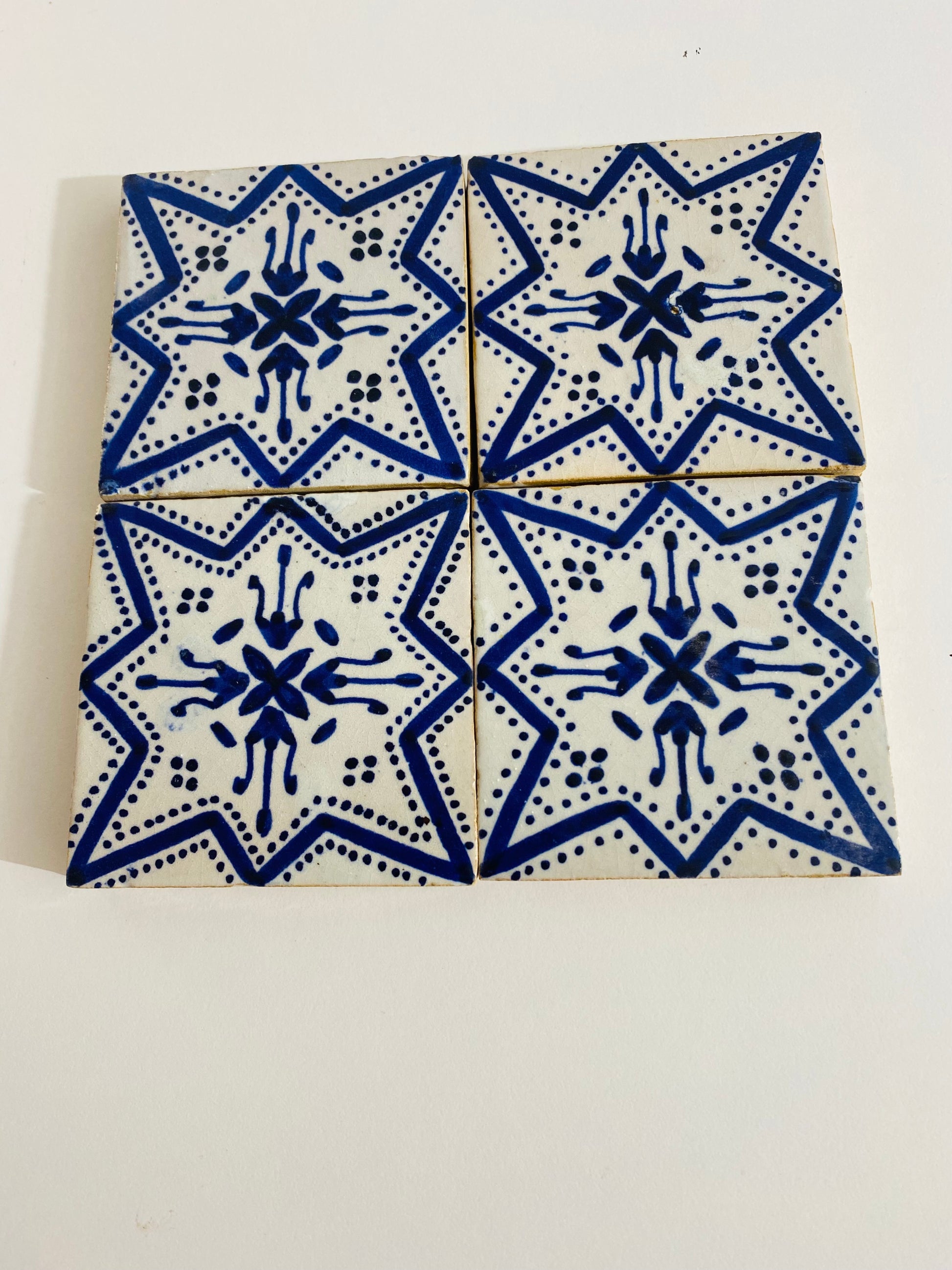 Inspired by traditional Moroccan geometric patterns, this hand-painted Blue Starburst Moroccan Tile showcases intricate eight-pointed star motifs in a deep, rich blue with fine dot detailing. The symmetry and precision of the design create an eye-catching focal point for any space.