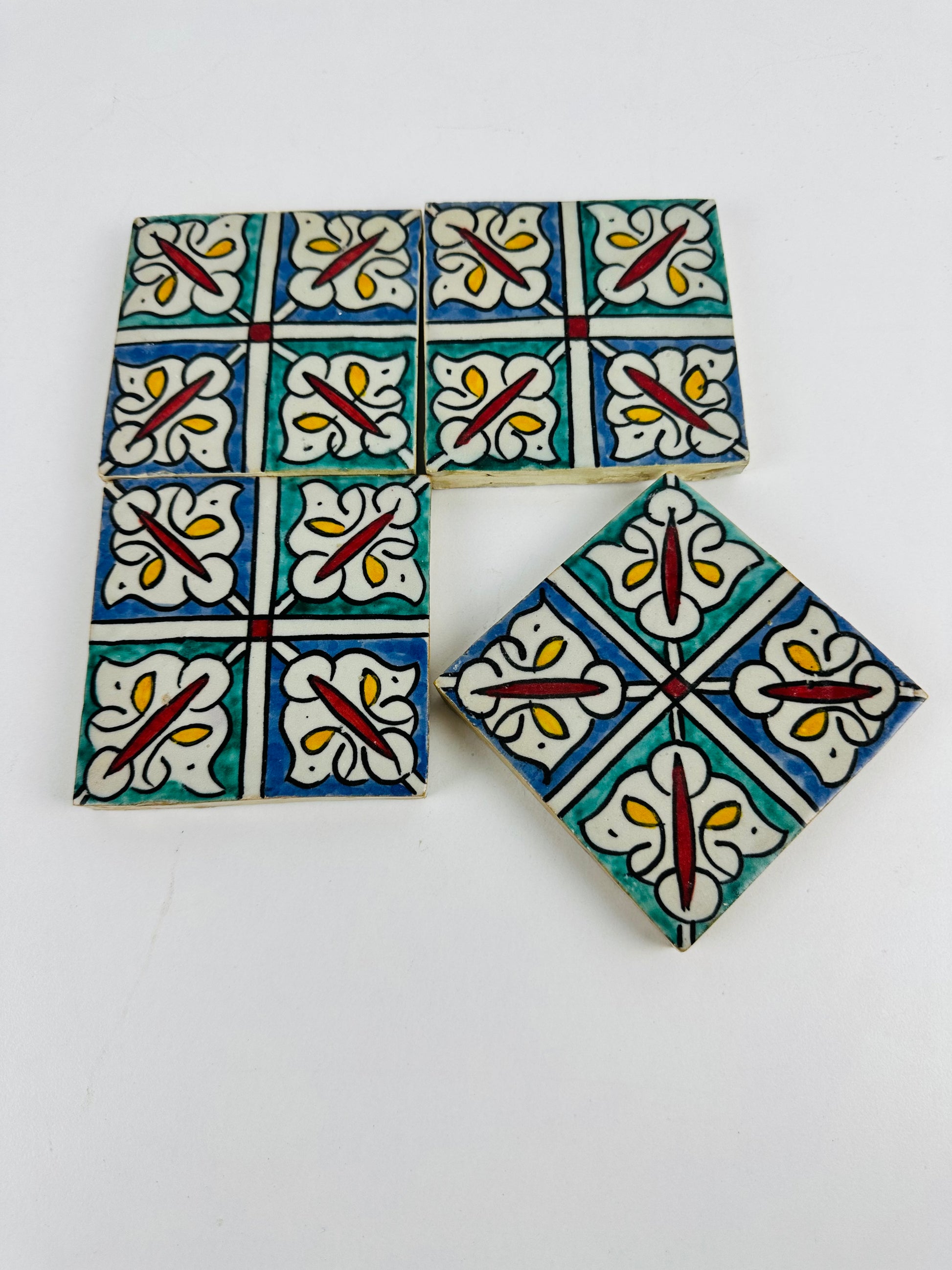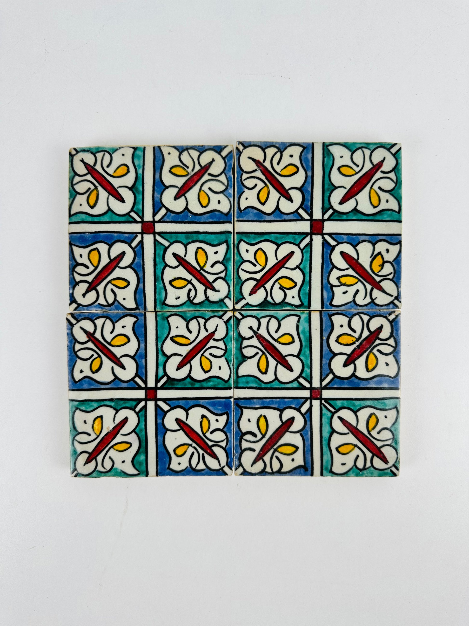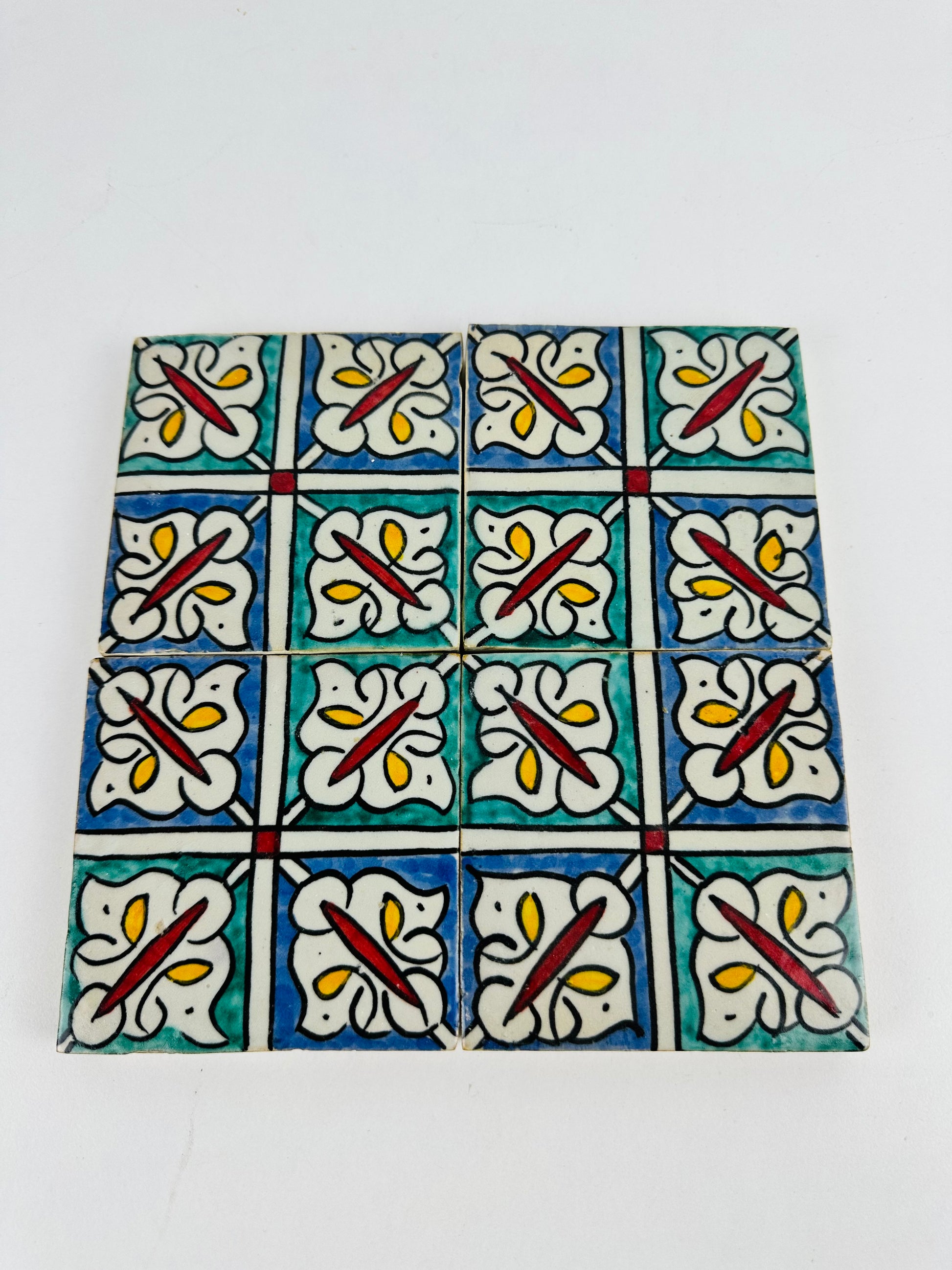 The Hand-Painted Moroccan Geometric Tile embodies the perfect blend of symmetry and vibrant color, featuring floral-inspired motifs enclosed in an intricate cross pattern. The rich teal and deep blue background contrast beautifully with the delicate red, white, and yellow floral accents, making this tile a stunning addition to any space. Whether used for backsplashes, decorative walls, or tabletops, this piece will bring a sense of Moroccan artistry and heritage into your home.