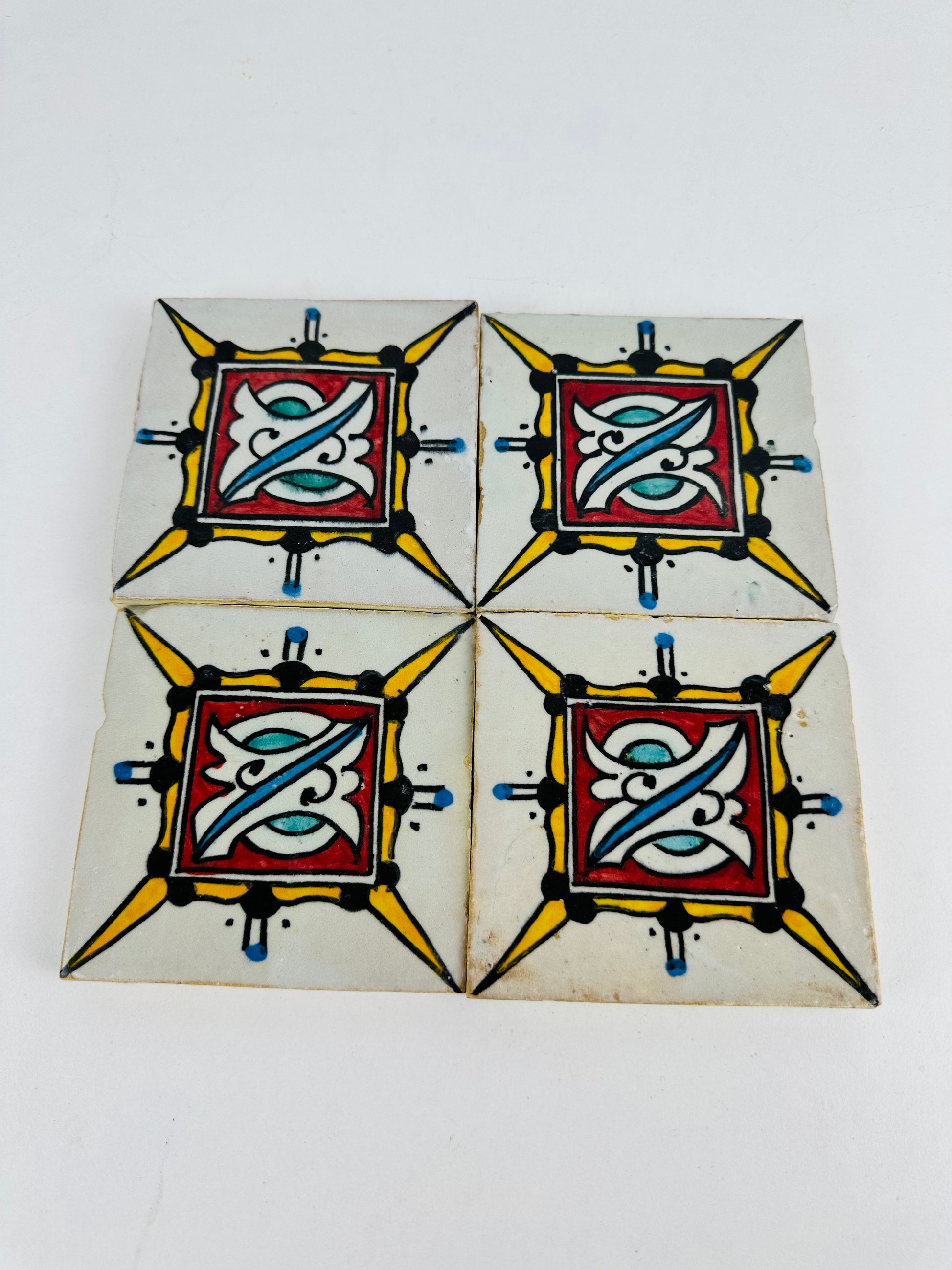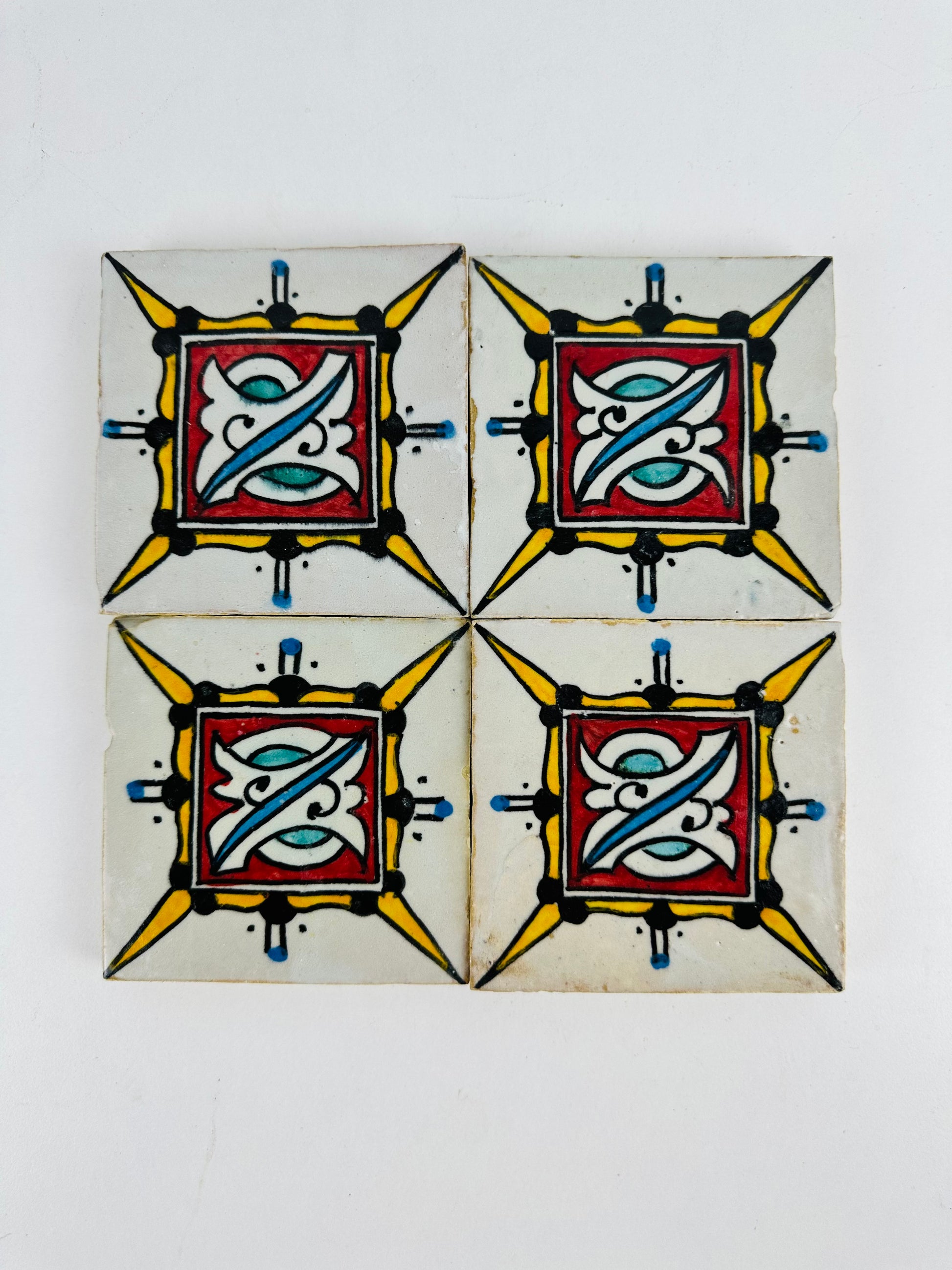 The Hand-Painted Moroccan Royal Emblem Tile is a stunning blend of heritage and luxury, featuring intricate symmetrical detailing inspired by Moroccan palatial designs. The central red square is adorned with delicate white floral accents, framed by elegant golden and black outlines that extend outward, mimicking the ornate architecture of Moroccan craftsmanship. A subtle touch of sky blue adds depth and contrast to this regal piece.