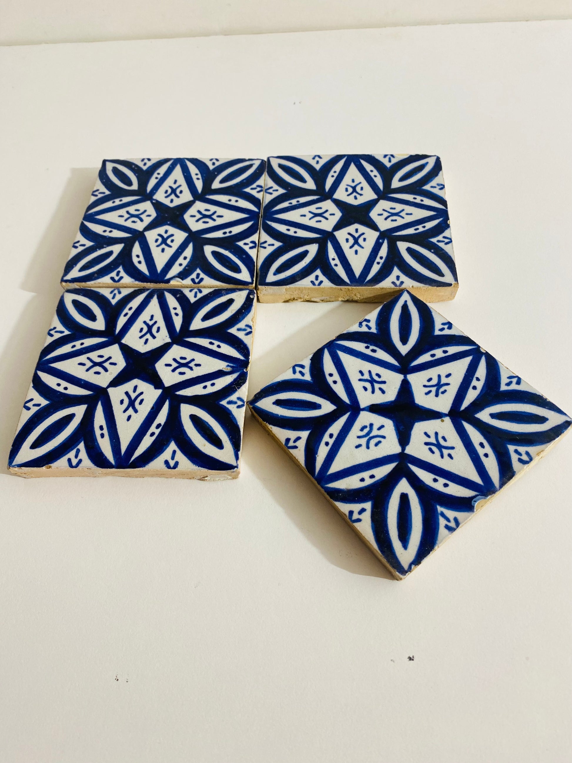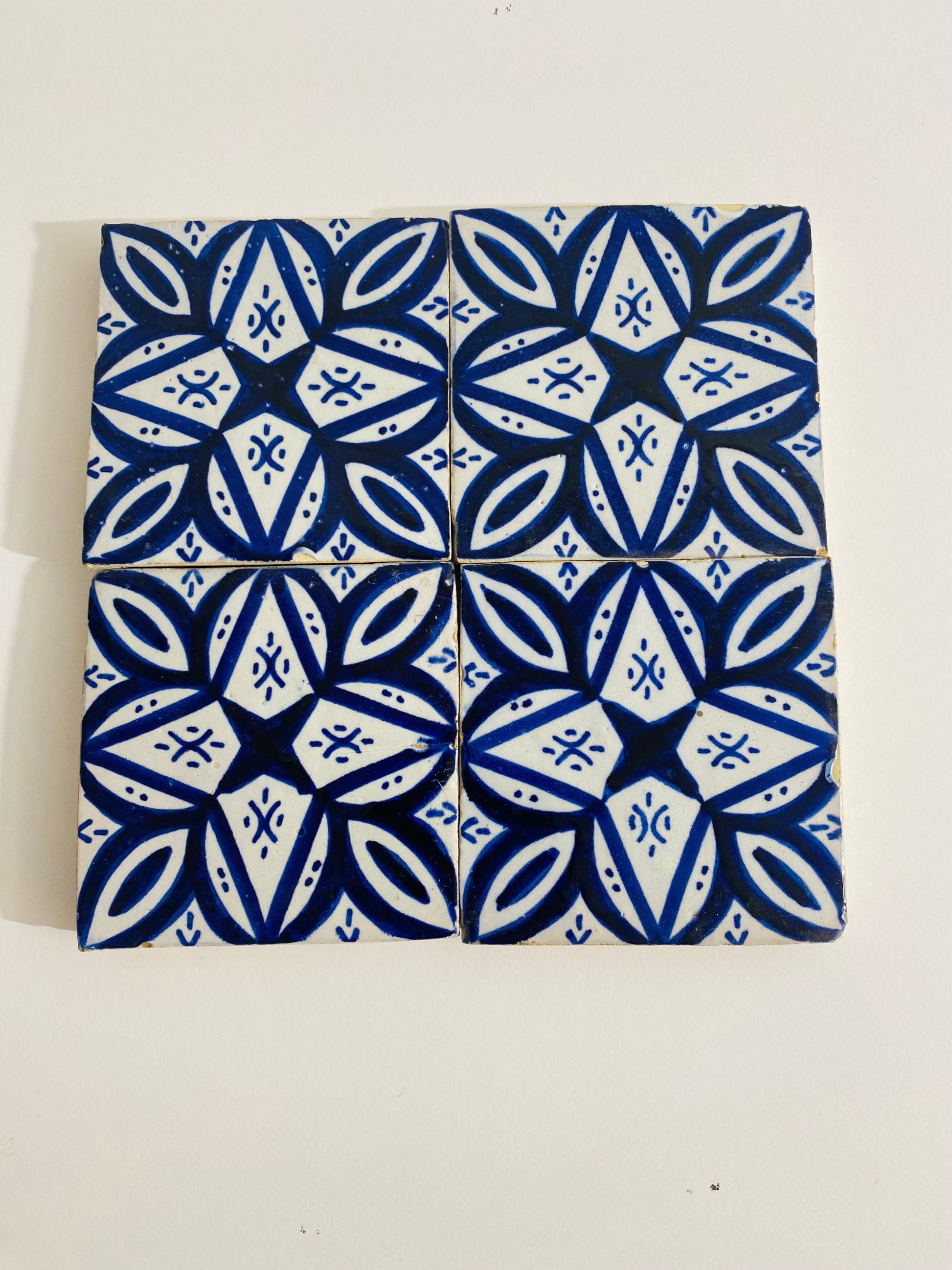 This Hand-Painted Moroccan Tile Set features a stunning deep blue and white floral starburst pattern, crafted using traditional Moroccan ceramic techniques. The bold geometric symmetry and intricate details make it a timeless addition to any space.