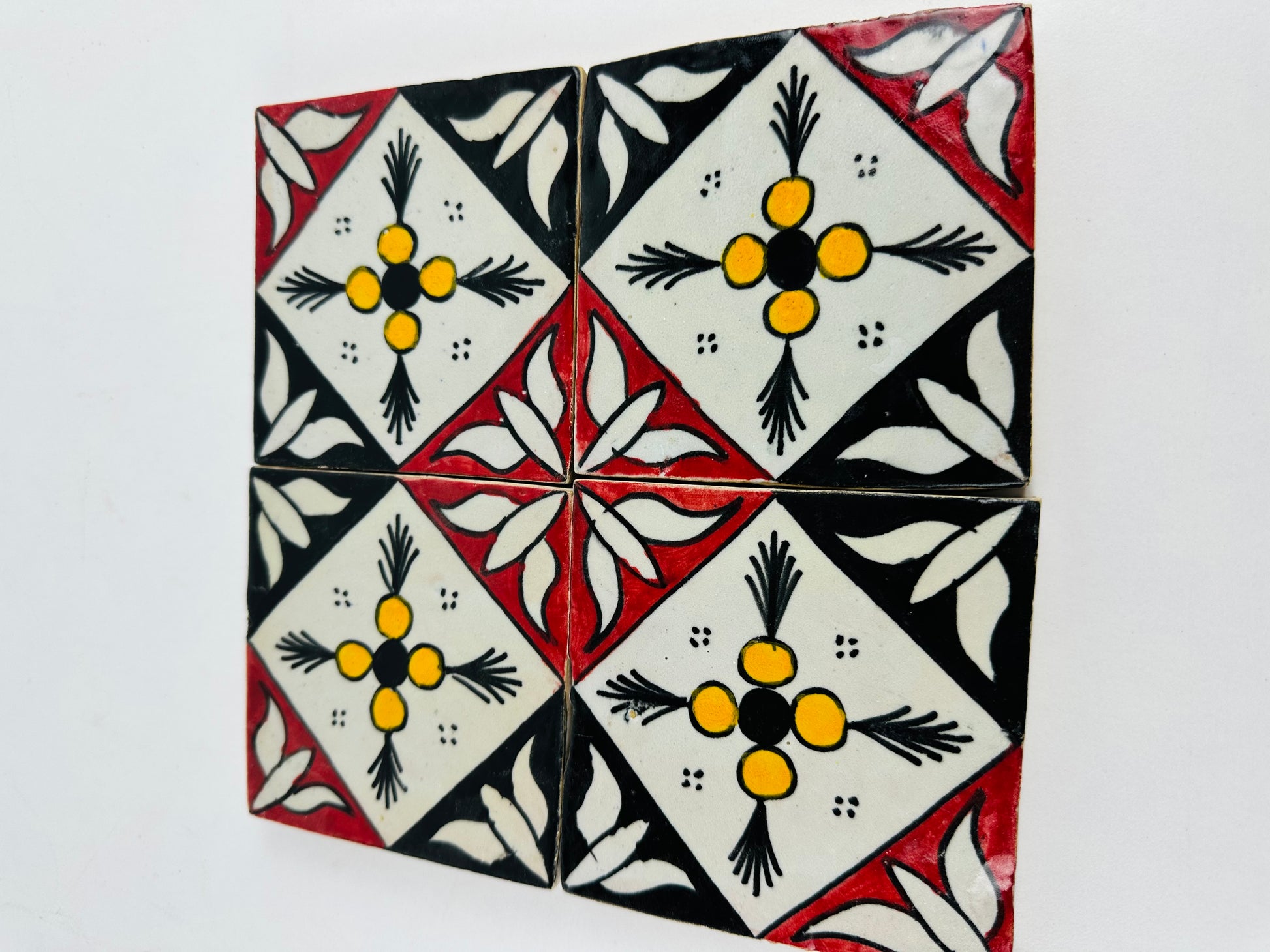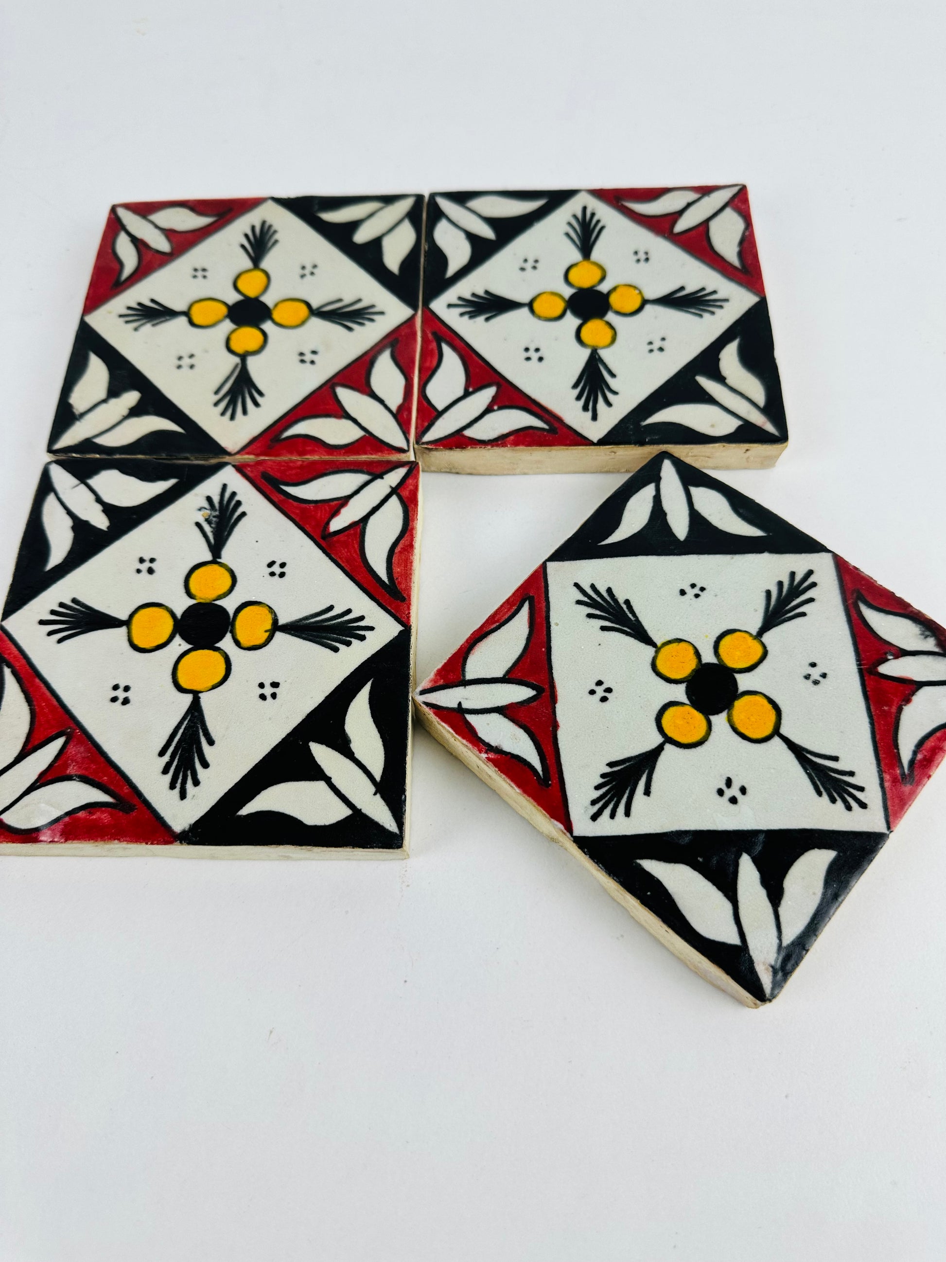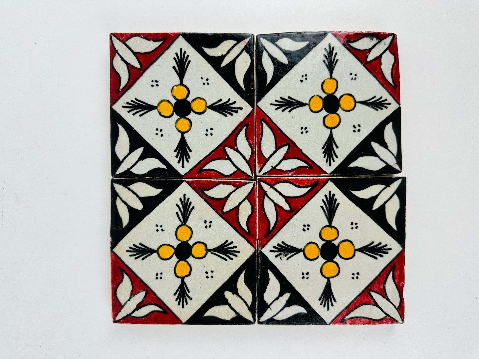 The Hand-Painted Moroccan Bold Contrast Tile is a statement piece, showcasing a striking geometric floral design with a vivid palette of red, black, white, and yellow. The bold symmetry of the diamond motif and the delicate floral accents create a timeless pattern reminiscent of traditional Moroccan artistry. Perfect for accent walls, kitchen backsplashes, or statement furniture pieces, this tile will add a unique touch of heritage and sophistication to your space.