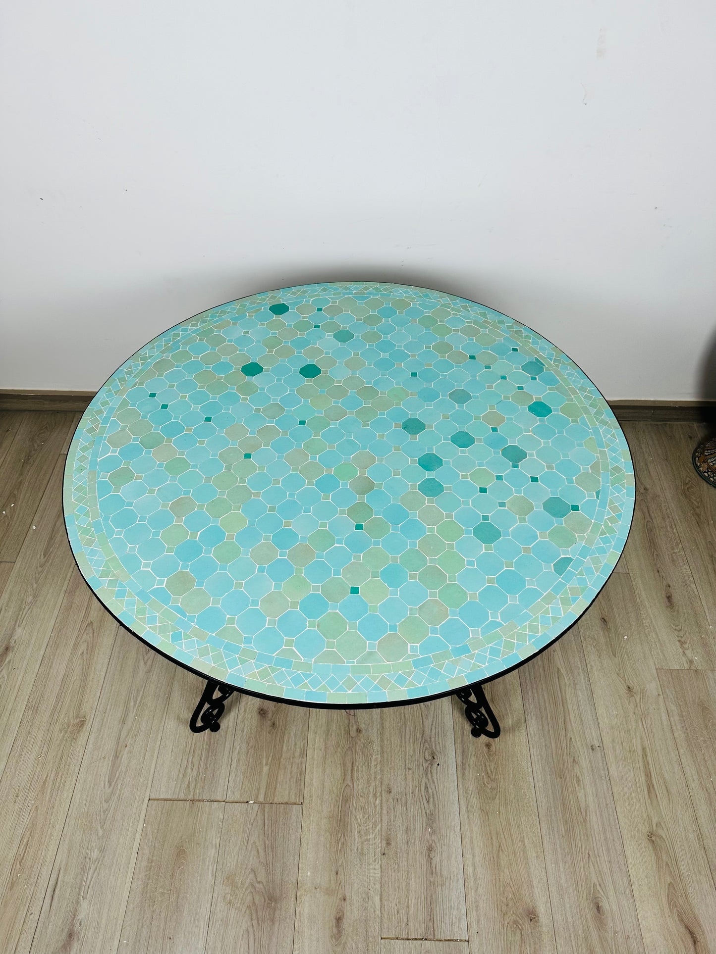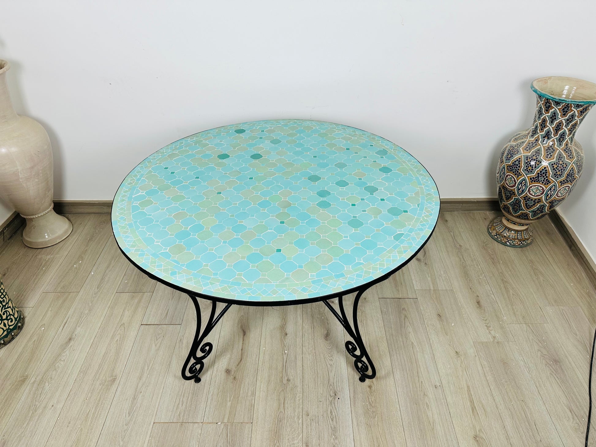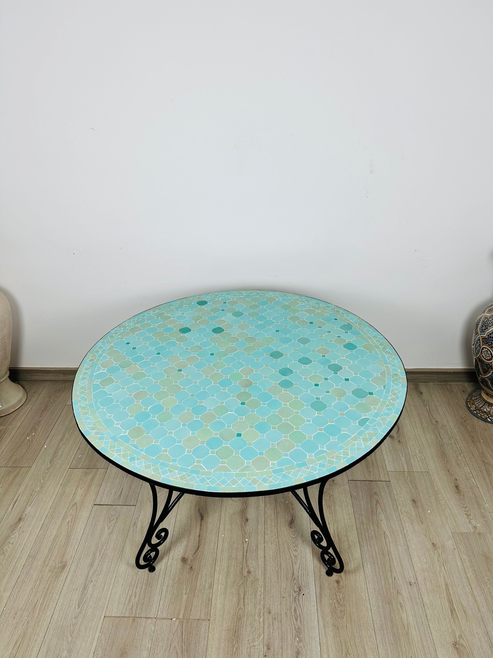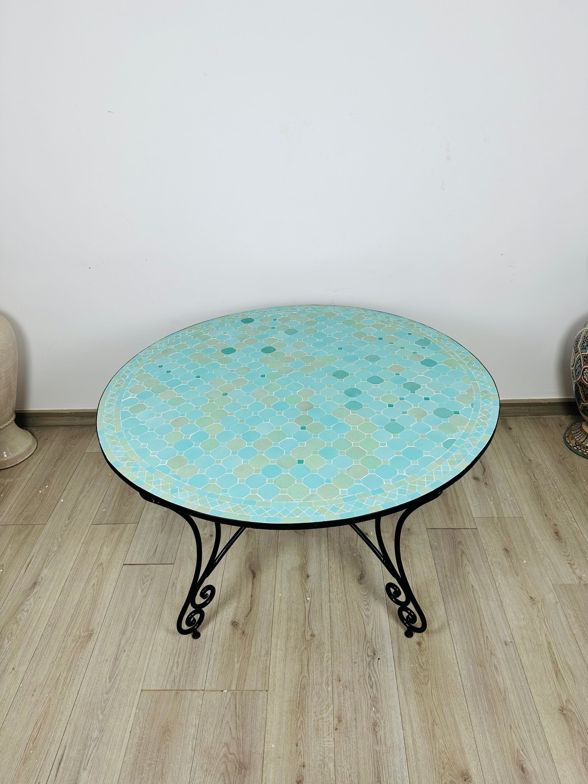 Immerse yourself in the tranquil beauty of this handcrafted Moroccan mosaic table, inspired by the calming hues of the sea. Featuring a stunning blend of light blue, turquoise, and soft beige, this table brings a refreshing, coastal charm to any space. The intricate mosaic design is complemented by a sturdy wrought iron base, making it a perfect centerpiece for patios, gardens, or indoor settings.