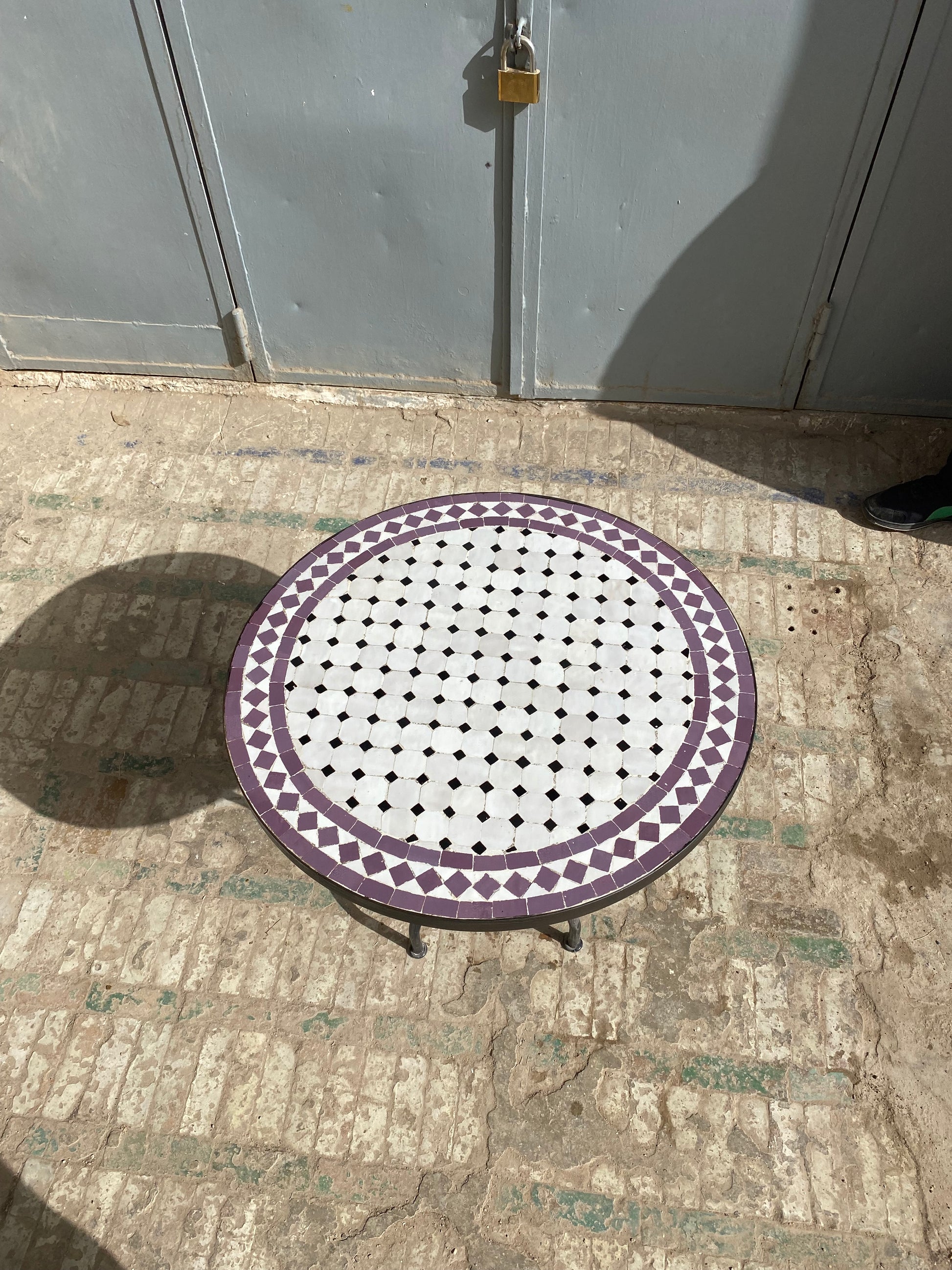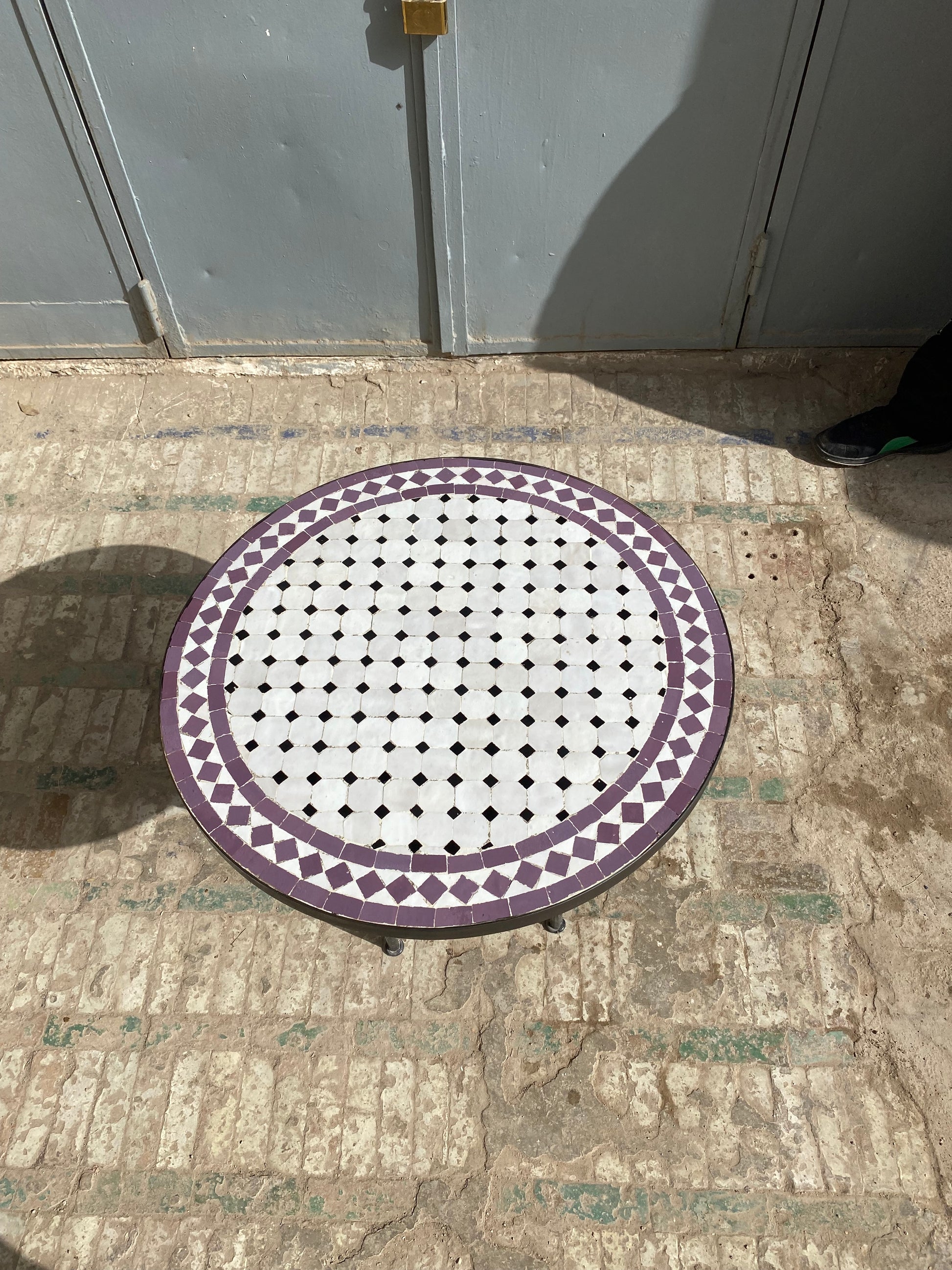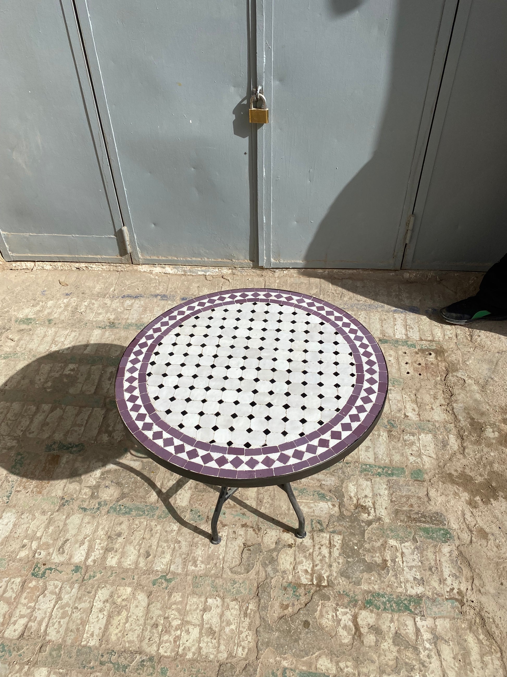 Add a touch of sophistication and charm to your space with this exquisite handcrafted mosaic table. Featuring a striking combination of crisp white tiles accented with deep amethyst purple, this design exudes elegance and timeless appeal. The intricate geometric border enhances its artistic allure, while the sturdy black wrought iron base ensures both durability and style.