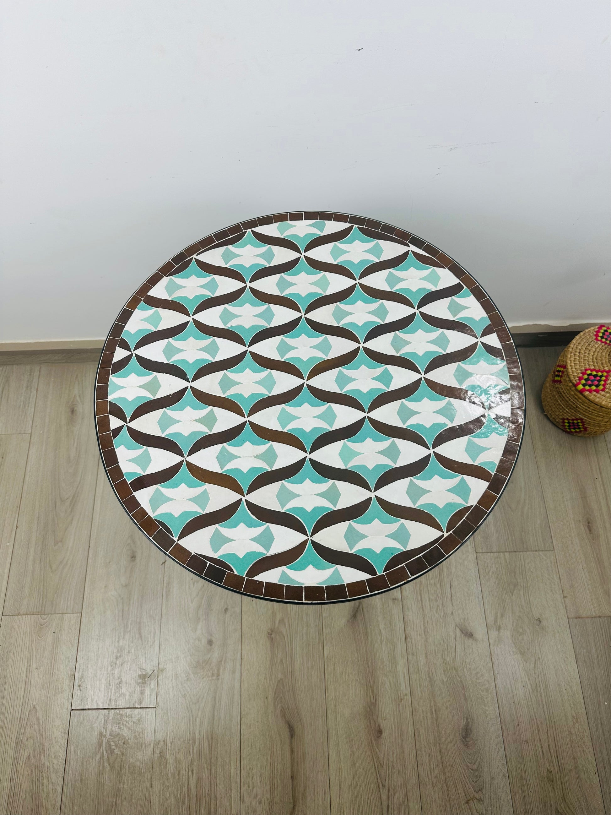 A blend of elegance and artistry, the Aqua Star Mosaic Table features a delicate geometric pattern in soft turquoise, white, and warm brown hues. The symmetrical star motifs create a harmonious and refined aesthetic, making this table an inviting addition to any space. Supported by an ornate wrought iron base, it balances timeless craftsmanship with modern charm.