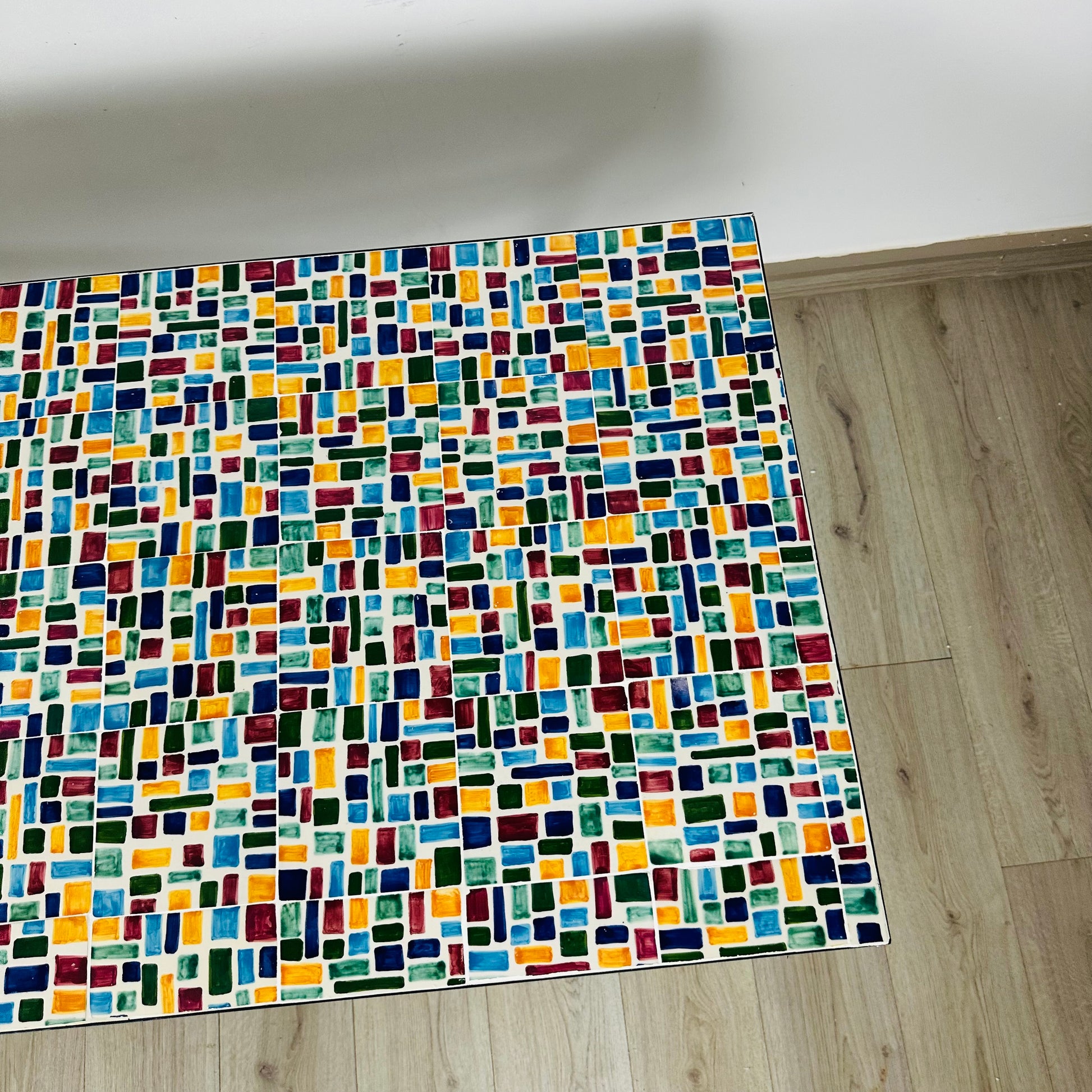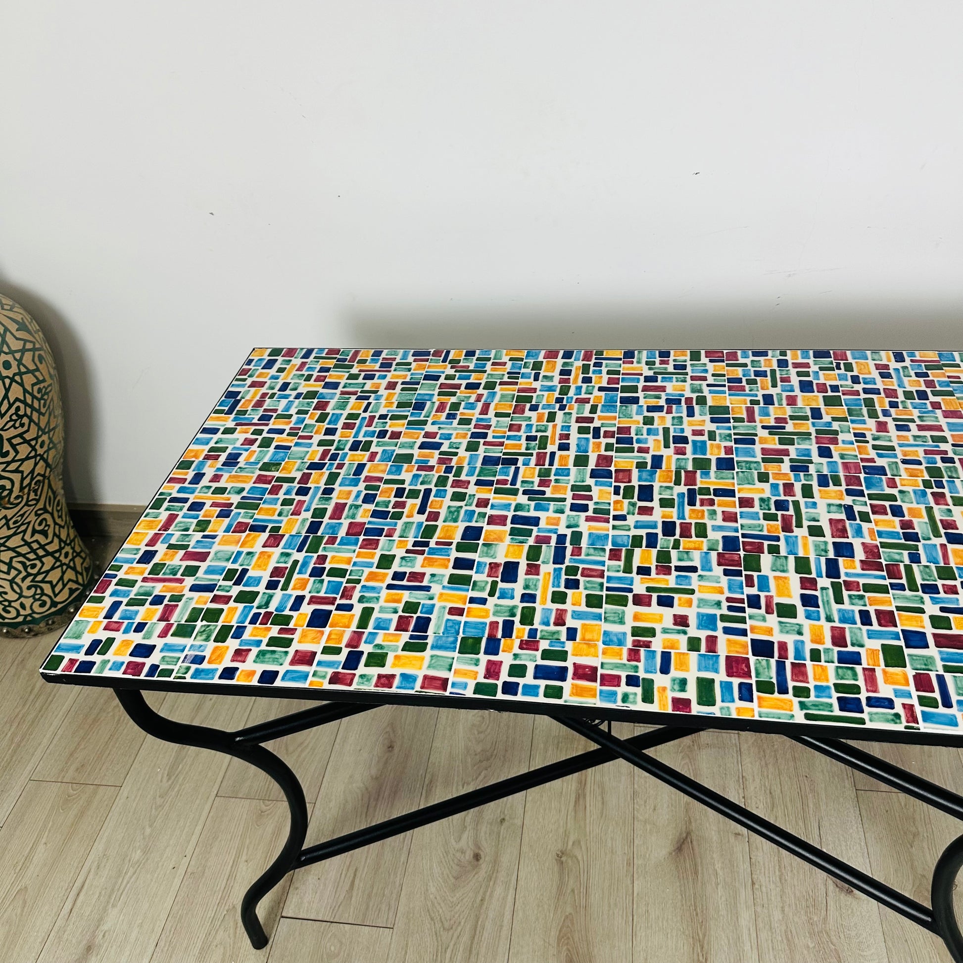 This handcrafted Moroccan Zellige mosaic table showcases a playful and modern abstract pattern, featuring a dynamic arrangement of colorful mosaic tiles in a mosaic-like patchwork. The randomized placement of bold hues, including deep blues, warm yellows, fiery reds, and lush greens, makes this table a true artistic statement piece. Whether used indoors or outdoors, it brings a lively and energetic atmosphere to any setting.