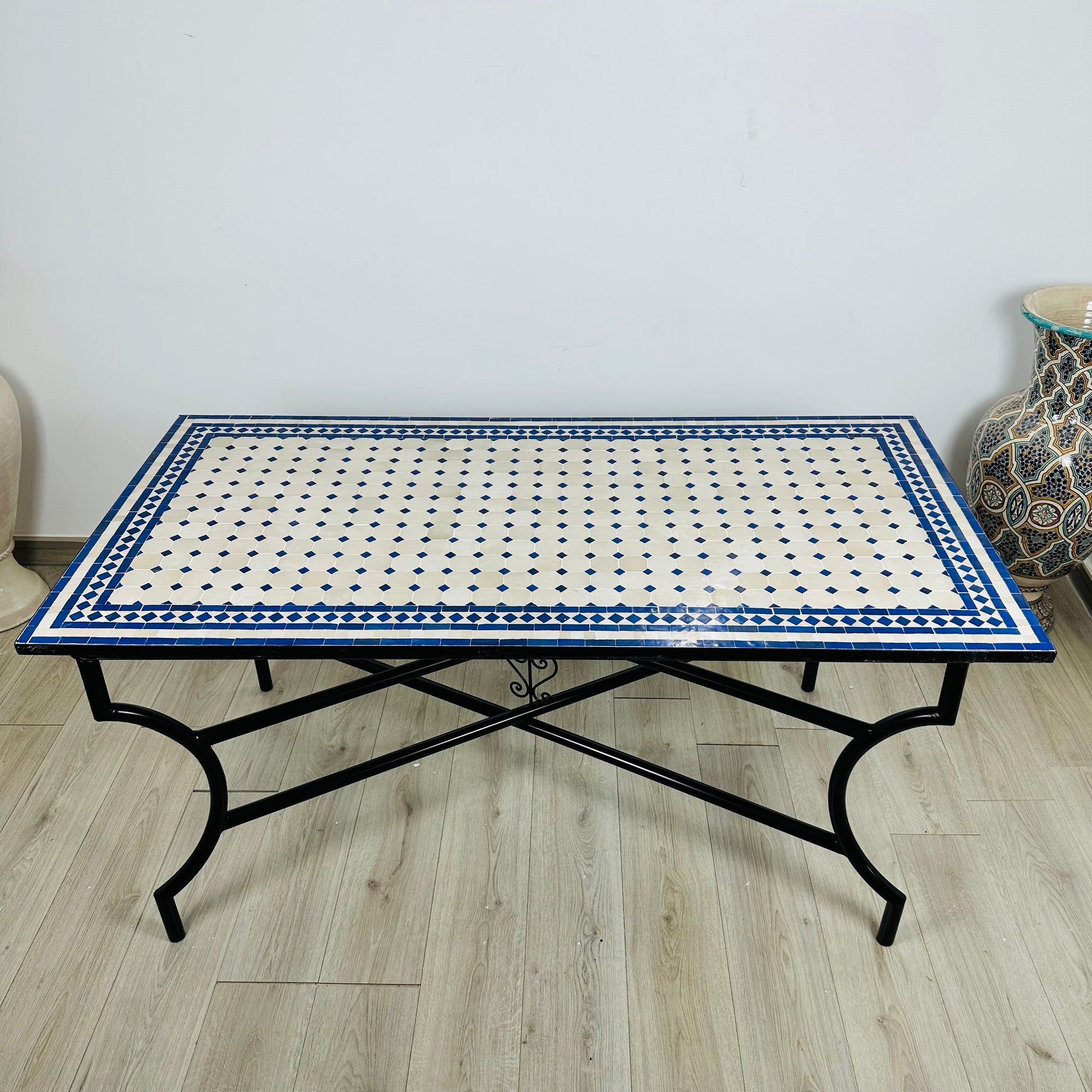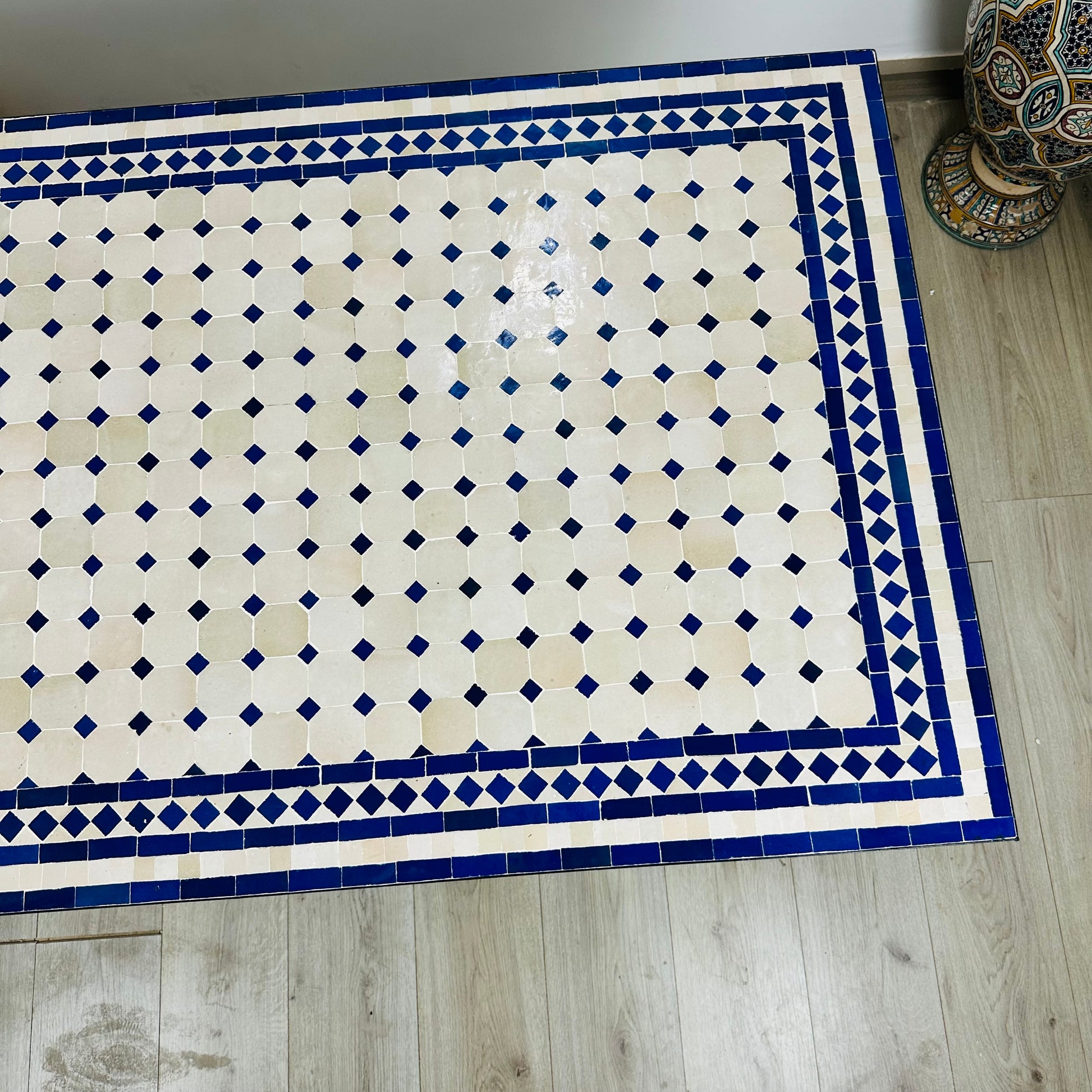 This handcrafted Moroccan Zellige mosaic table is a stunning work of art, featuring a richly detailed geometric design with vibrant shades of blue, white, and terracotta. Inspired by traditional Moroccan craftsmanship, this table adds an authentic touch of North African culture to any indoor or outdoor space. It is available in rectangular, square, round, or oval shapes, making it a versatile choice for different settings.