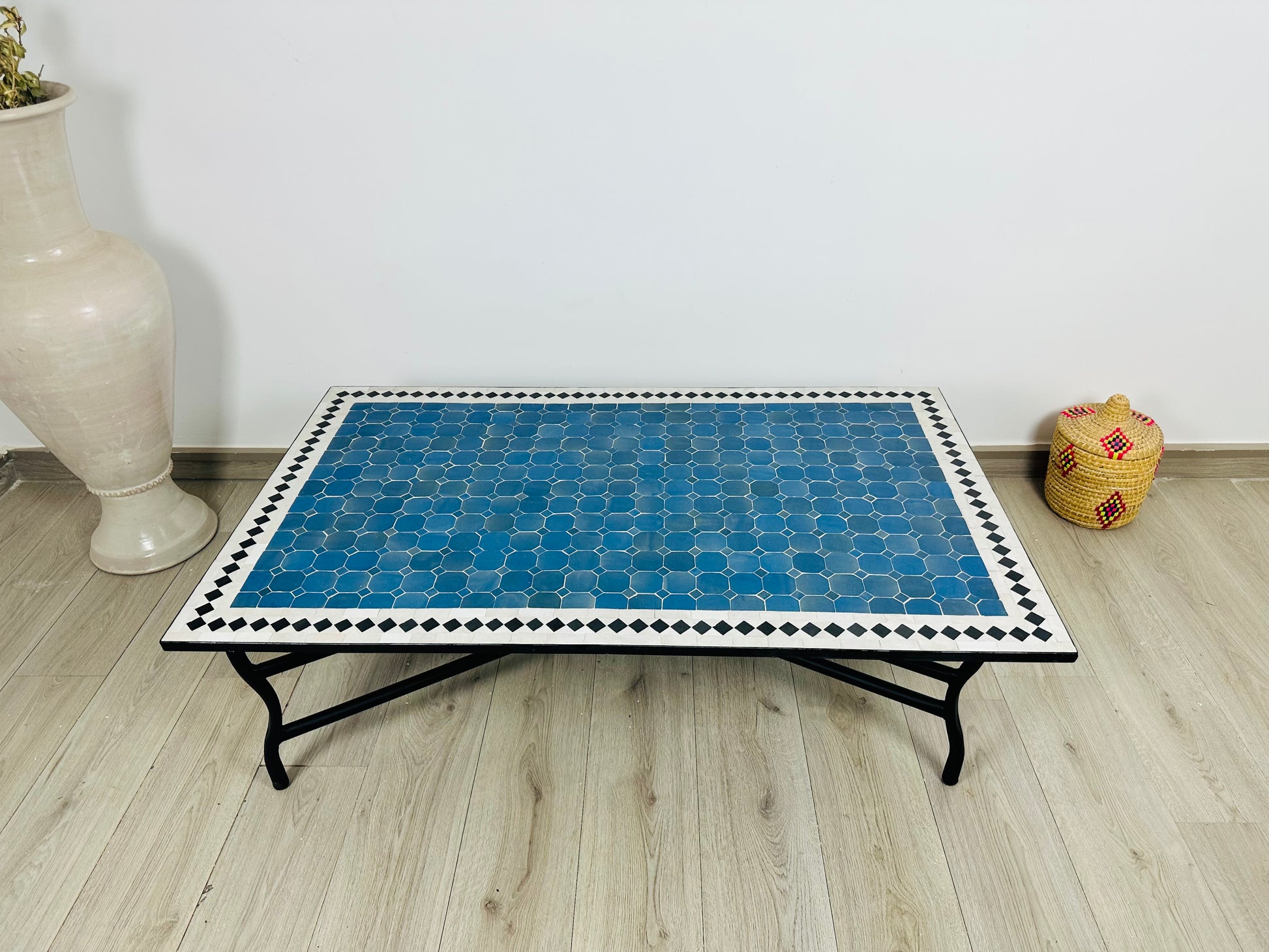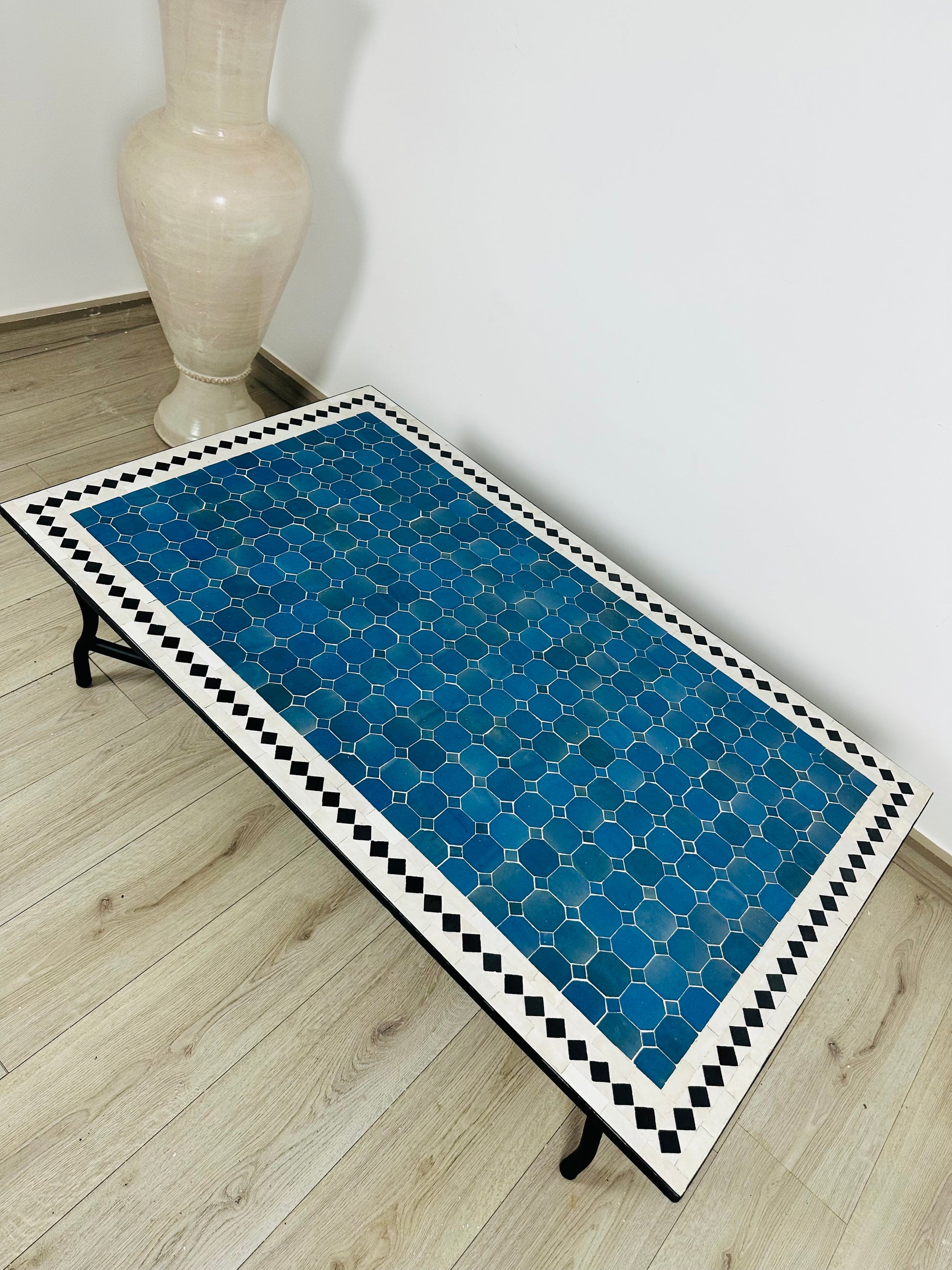 This handcrafted Moroccan Zellige mosaic table showcases a mesmerizing deep blue hexagonal pattern with a bold black and white border. The clean geometric lines and striking contrast give it a timeless elegance, making it perfect for both traditional and modern spaces. Whether placed indoors or outdoors, this table is a sophisticated blend of Moroccan craftsmanship and contemporary design.