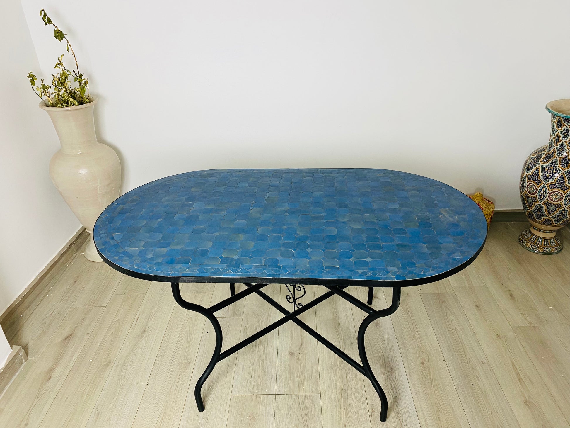 Bring Moroccan craftsmanship into your home with this elegant blue mosaic table.