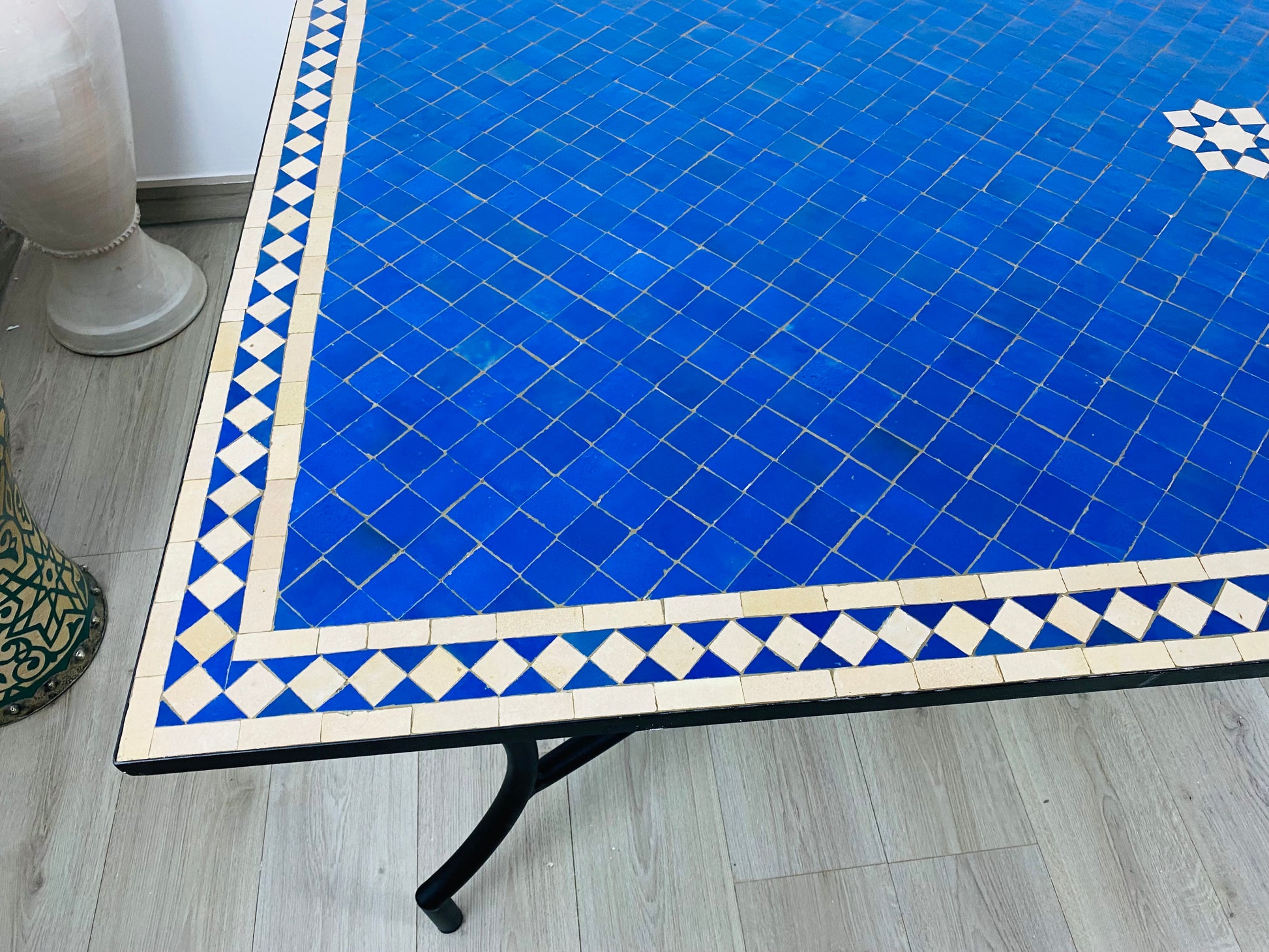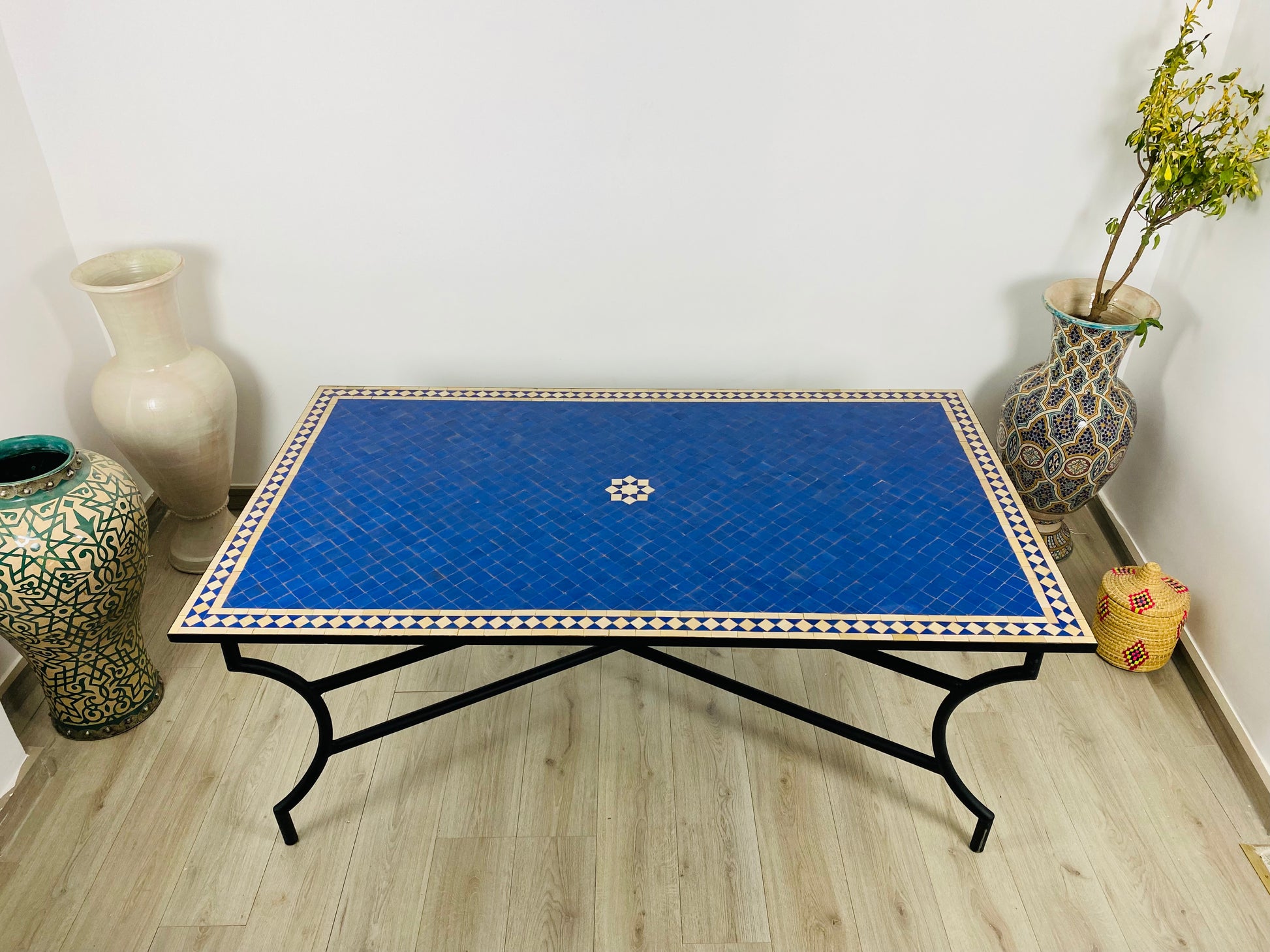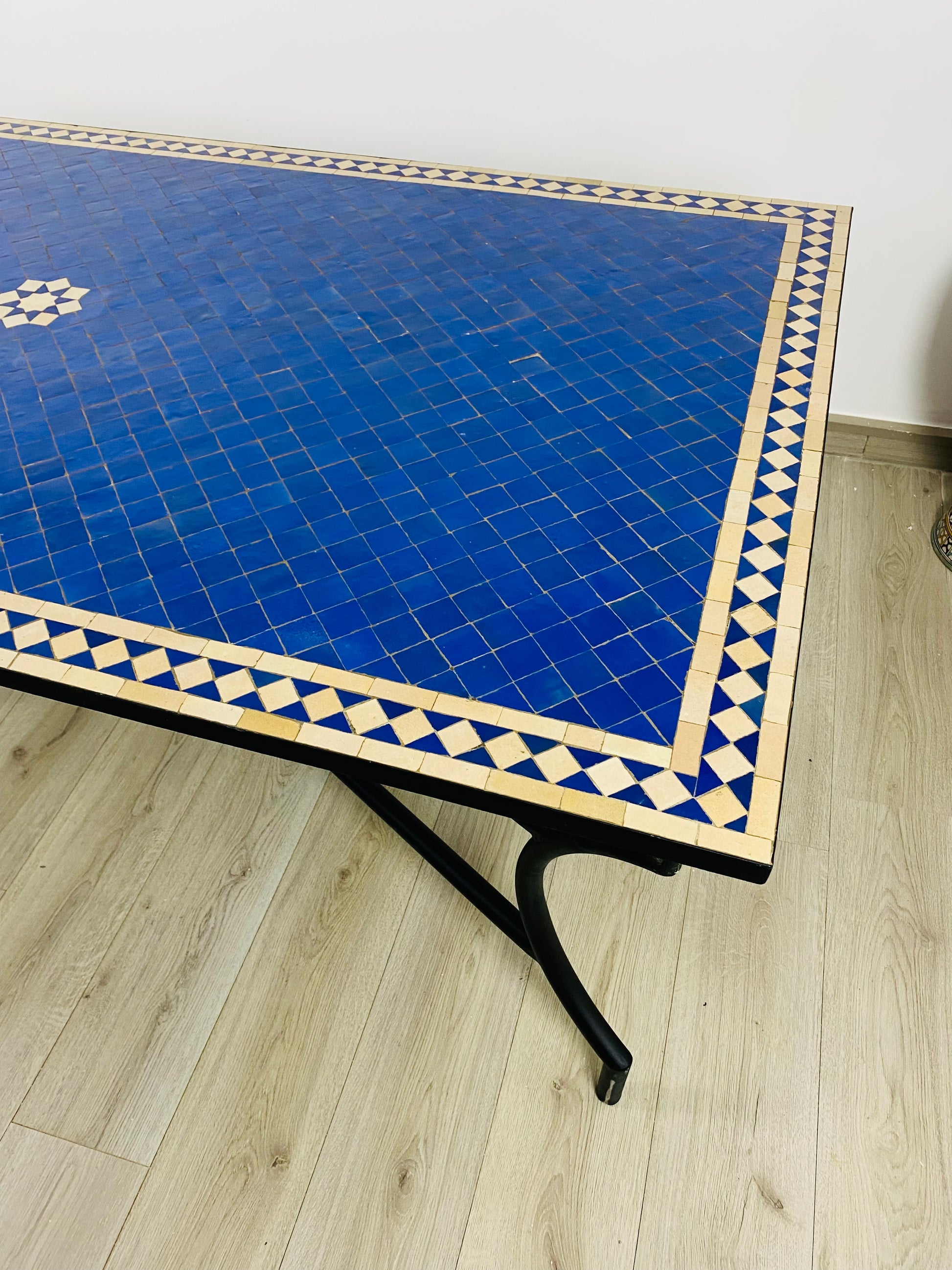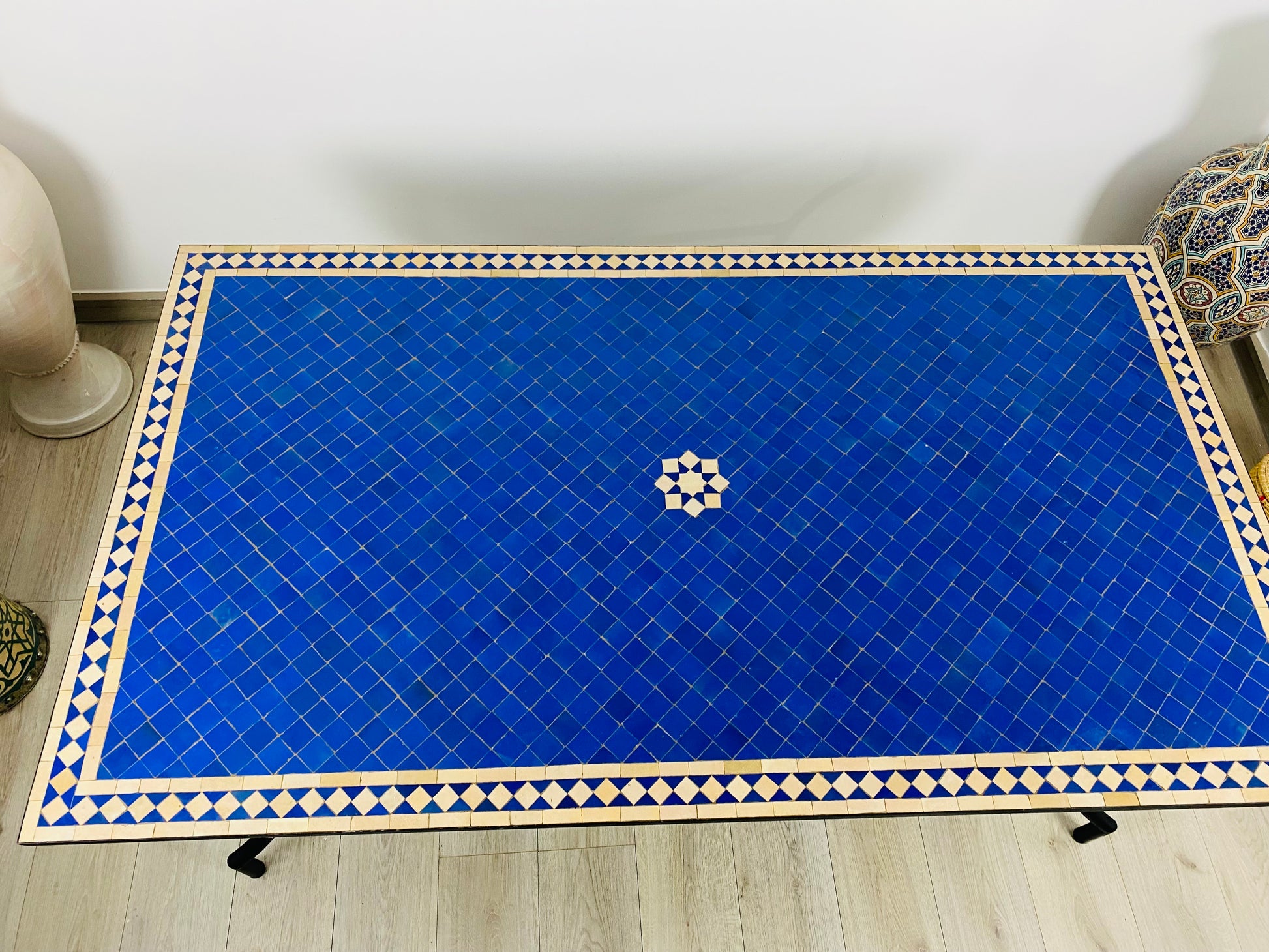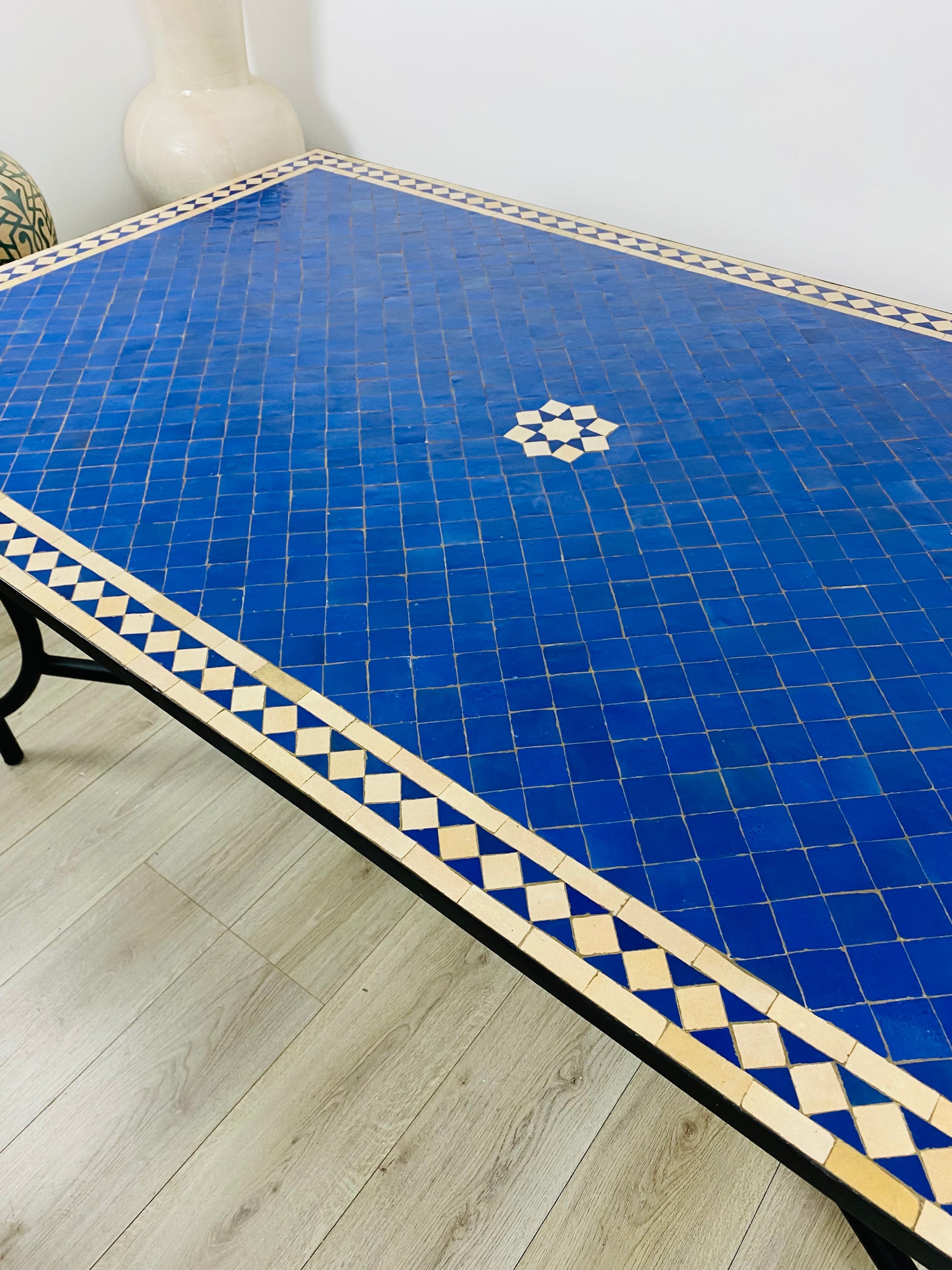 This handcrafted Moroccan Zellige mosaic table features a rich deep blue surface with a classic geometric border in sandy beige, creating a timeless and sophisticated look. A subtle central motif adds a touch of Moroccan artistry, making it a perfect blend of tradition and minimalism.