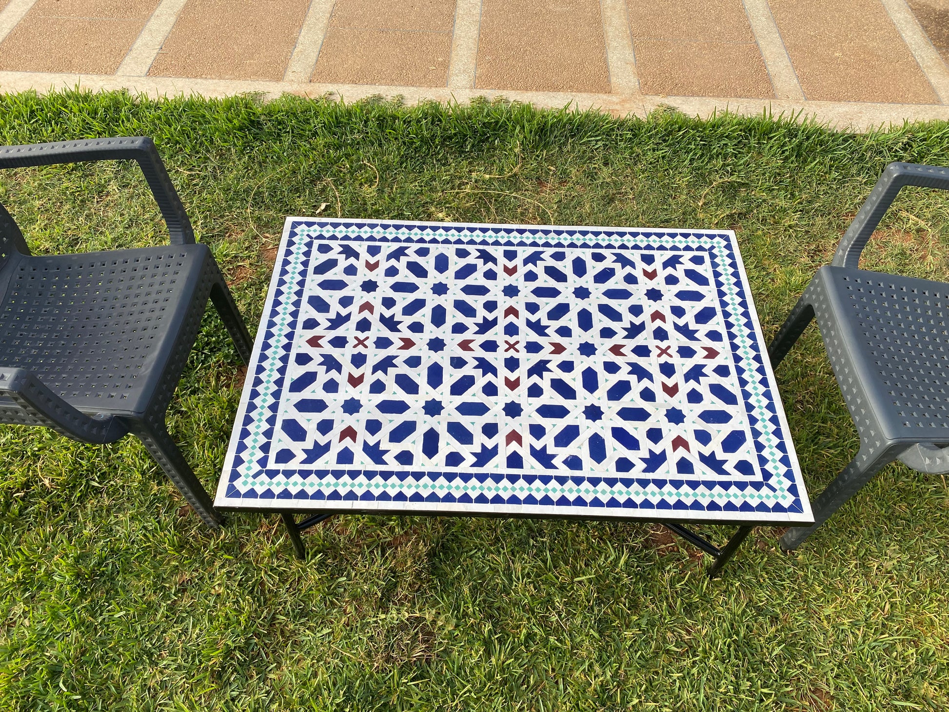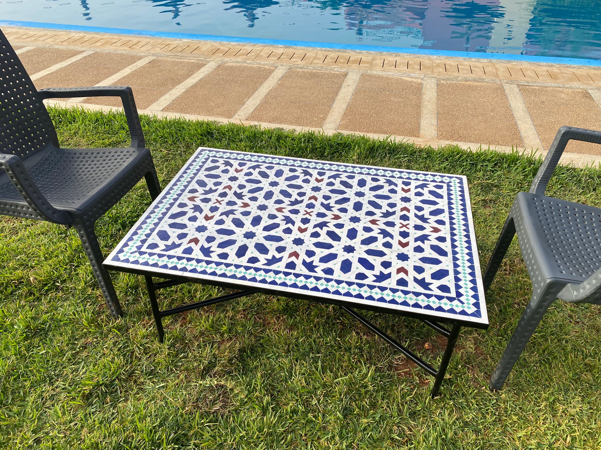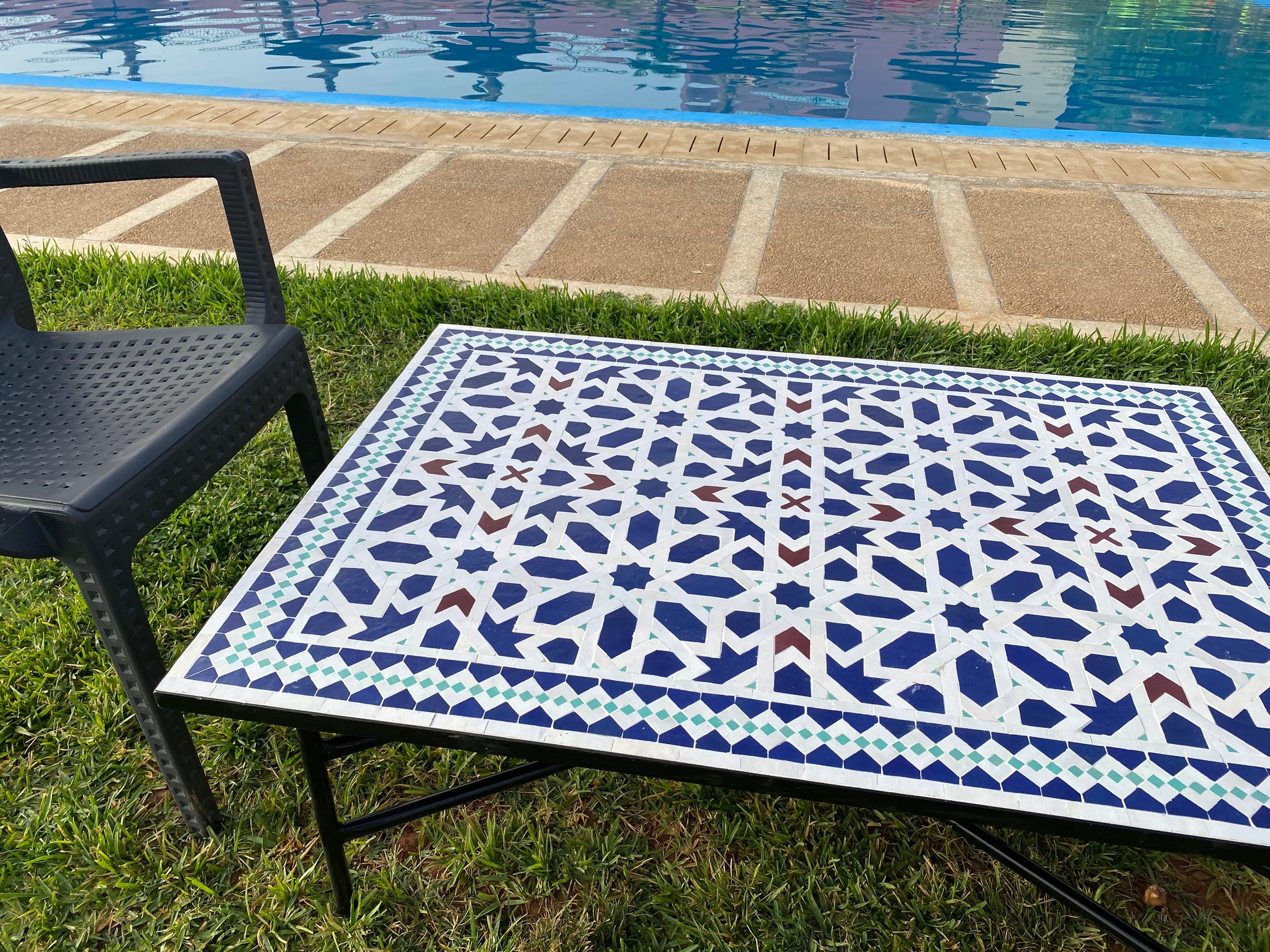 This stunning Moroccan Zellige mosaic table features an intricate geometric pattern, handcrafted by skilled artisans. Its combination of deep blue and earthy tones creates a bold yet refined look, perfect for any space.