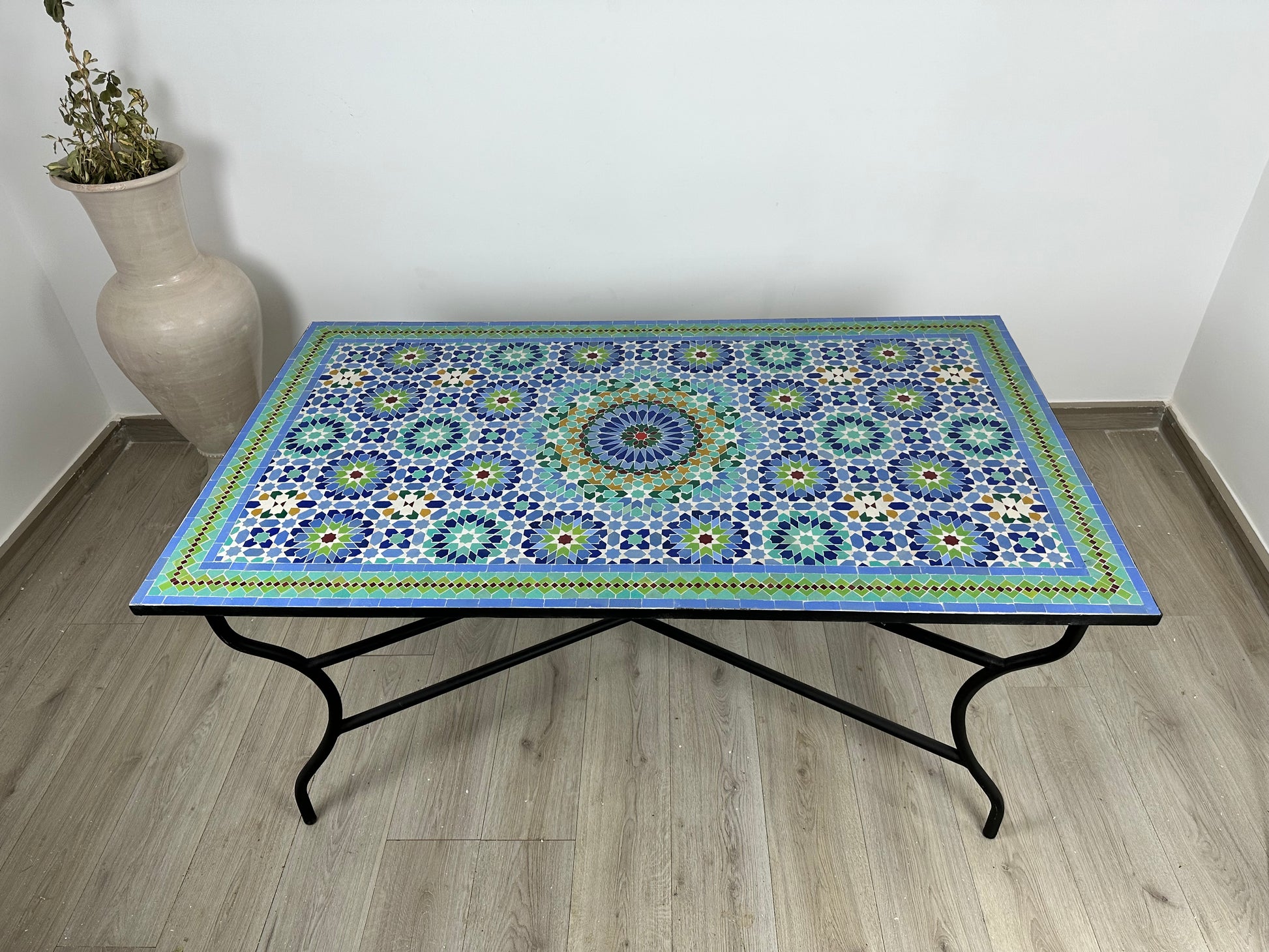 Traditional Moroccan ceramic tiles, cement, and a handcrafted wrought iron base