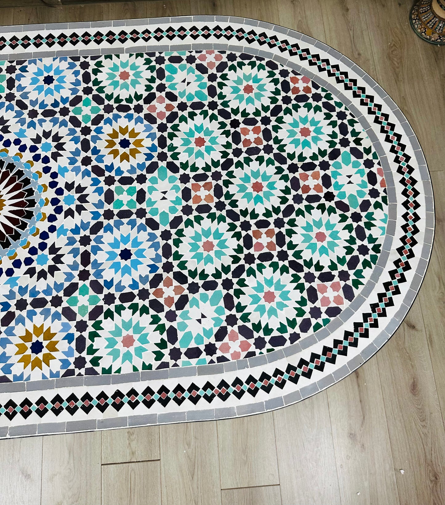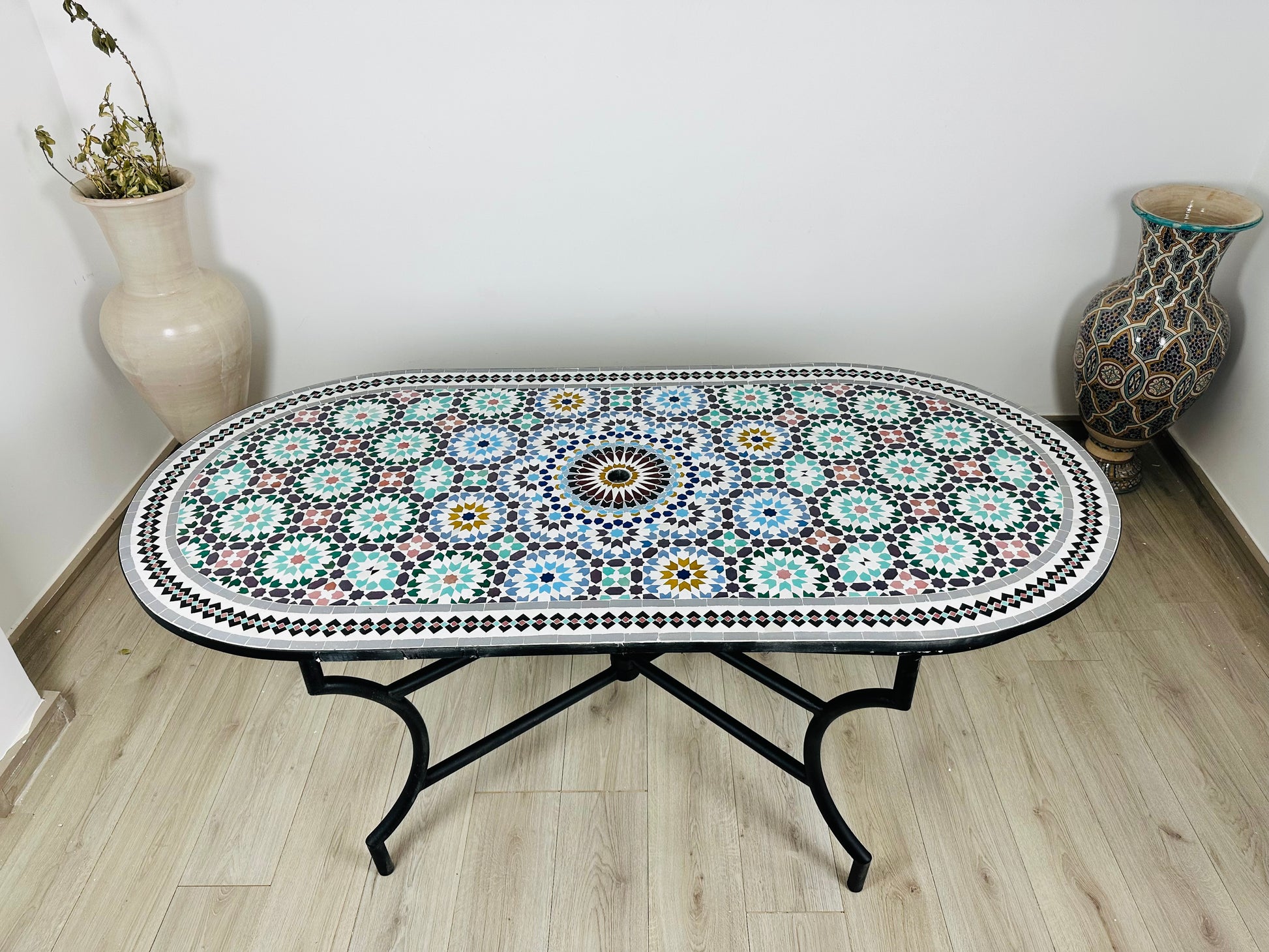This handcrafted Moroccan Zellige mosaic table is a true work of art, showcasing a meticulously arranged pattern in soft blues, earthy greens, delicate pinks, and deep black accents. The traditional geometric motifs radiate from the center, creating a captivating and harmonious composition. Perfect for any space, this piece seamlessly blends Moroccan heritage with modern elegance.