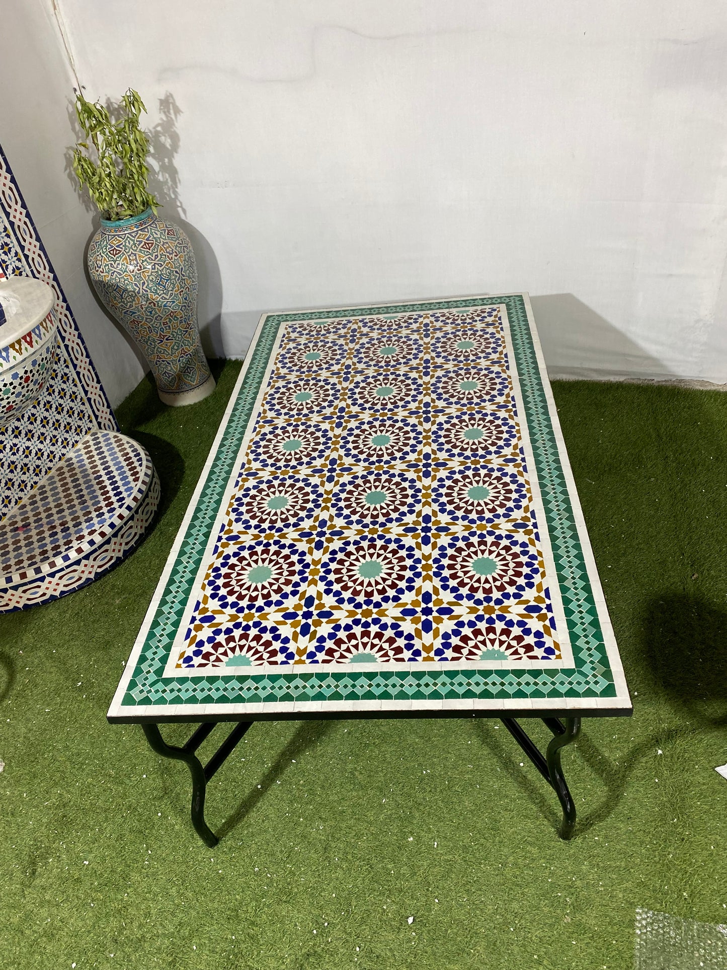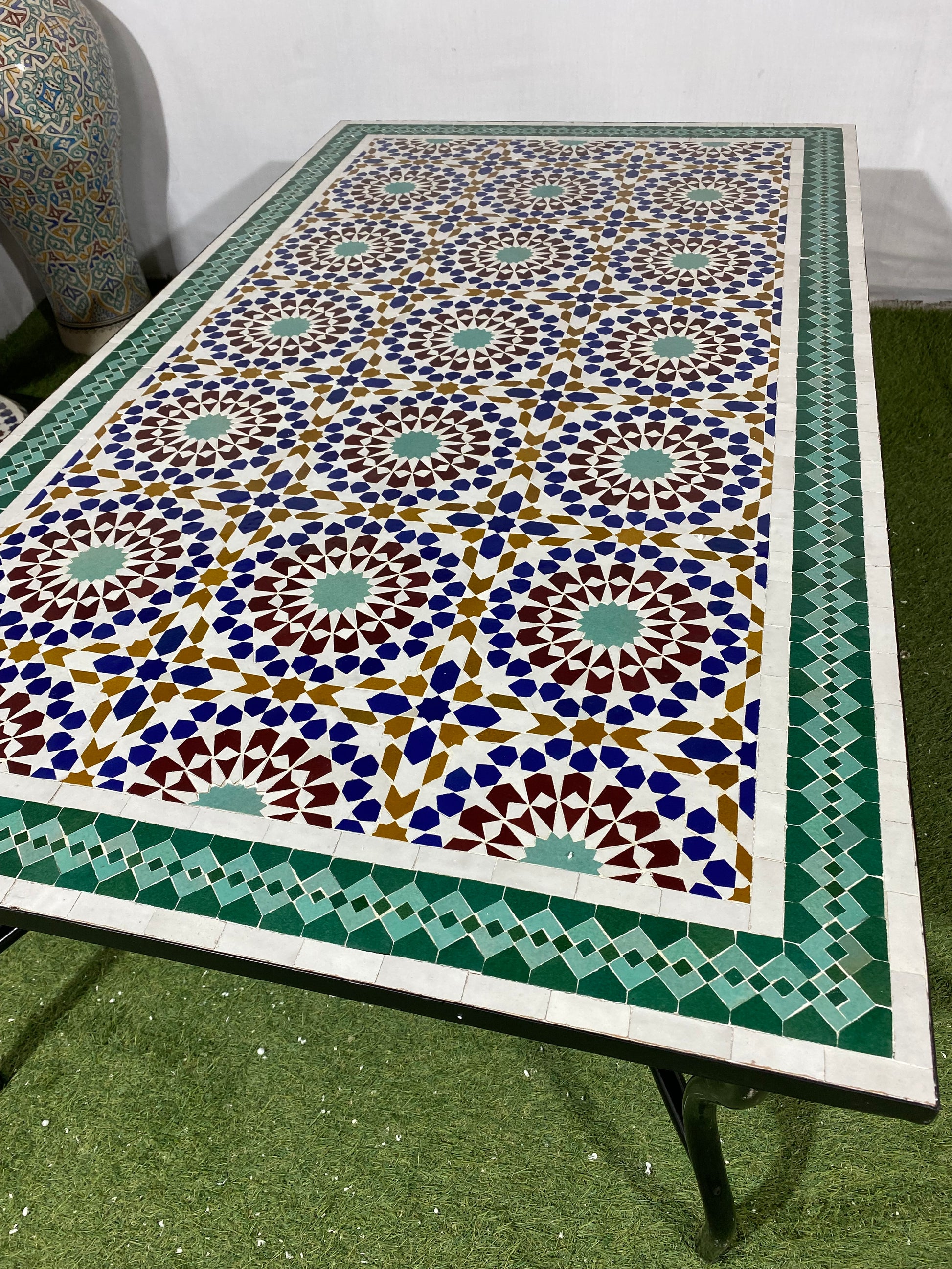 This handcrafted Moroccan Zellige mosaic table features a refined geometric pattern in rich green, cream, and deep blue tones. The sophisticated border enhances its timeless beauty, making it a stunning centerpiece for both indoor and outdoor settings.