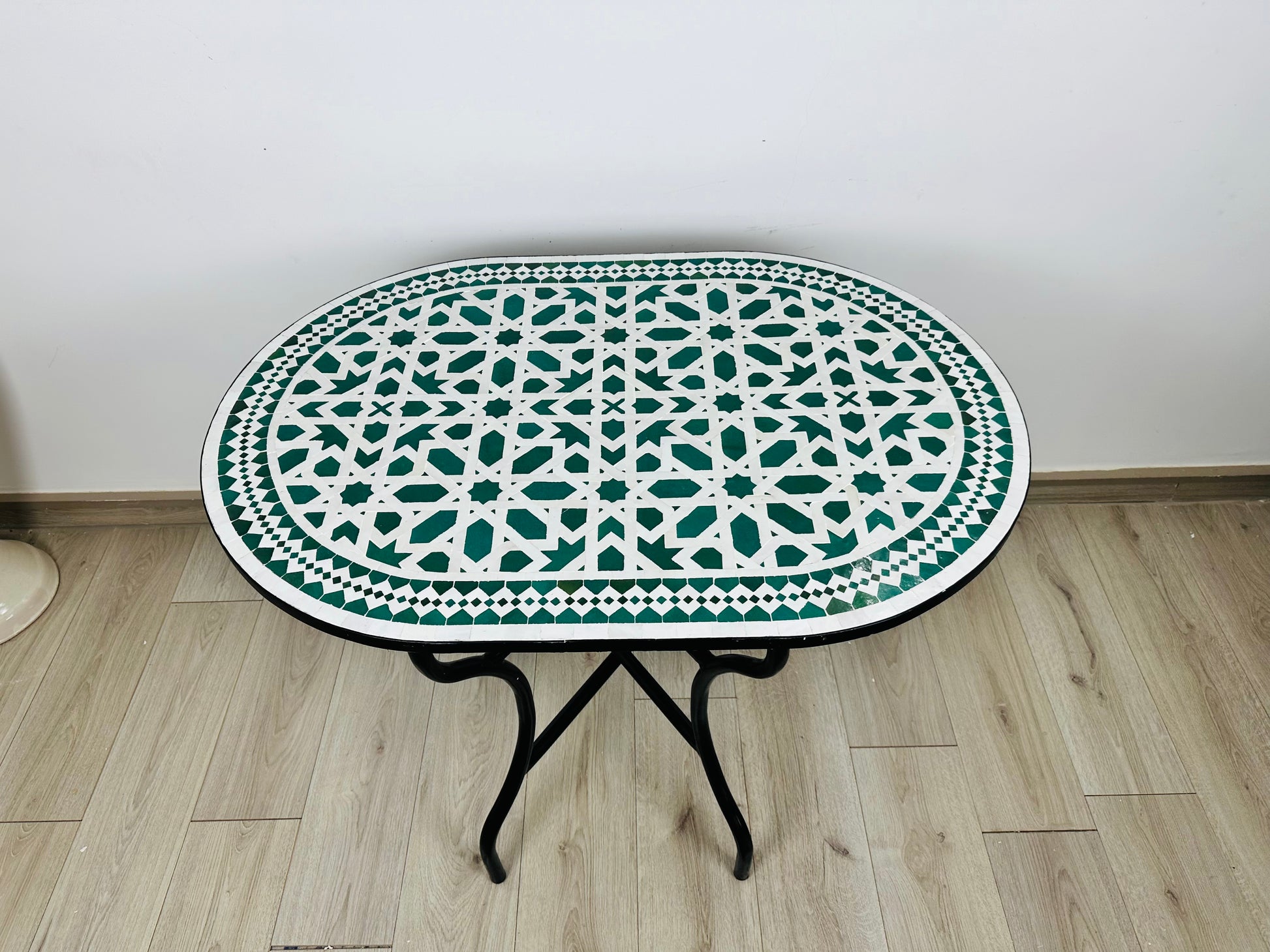 Handmade Moroccan Zellige Mosaic Table – Elegant Green & White Design