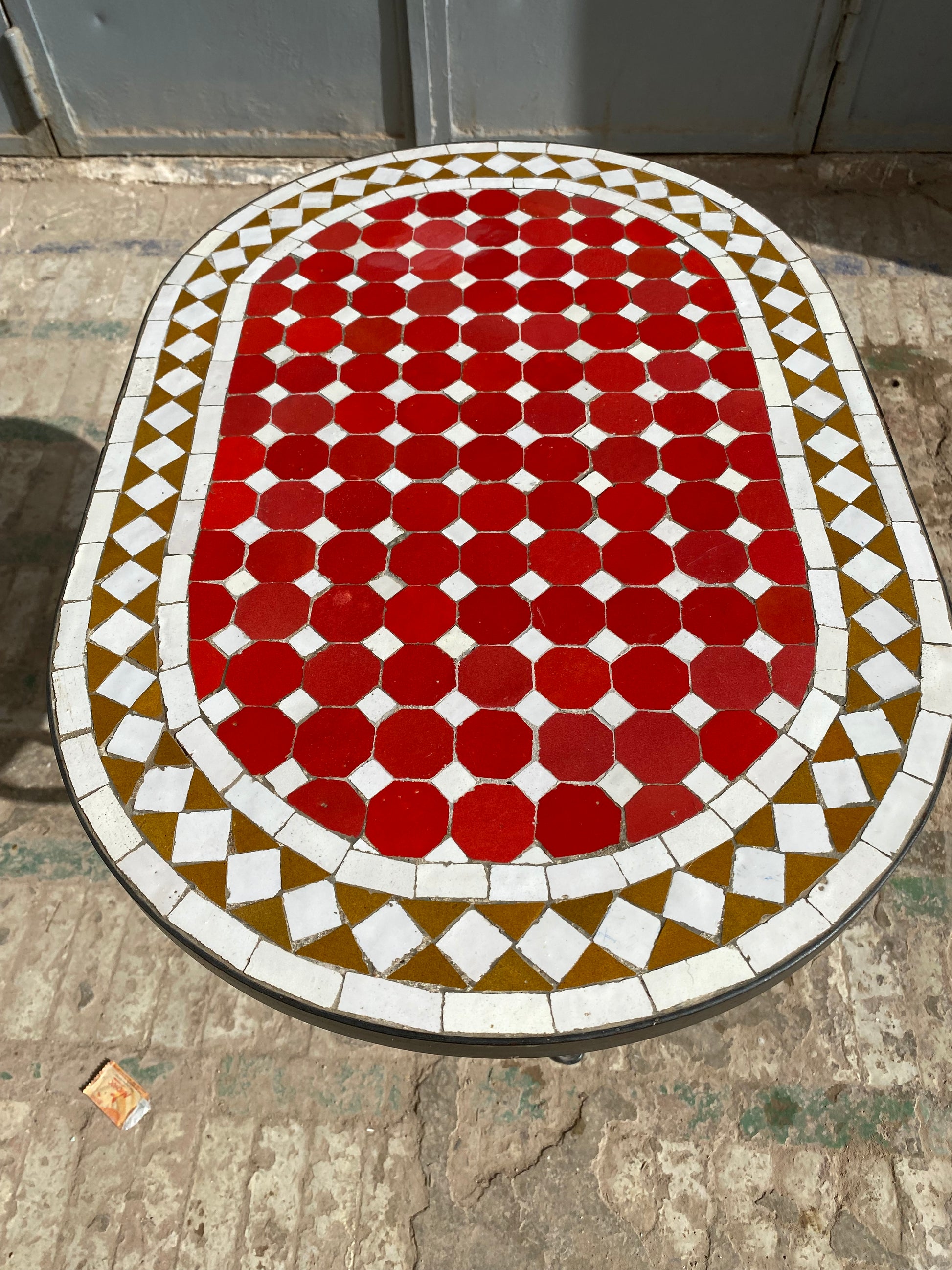 This handcrafted Moroccan Zellige mosaic table captivates with its striking red tile design, framed by a sophisticated white and mustard geometric border. Its rich color and bold contrast bring warmth and character to any space, blending Moroccan artistry with timeless appeal.