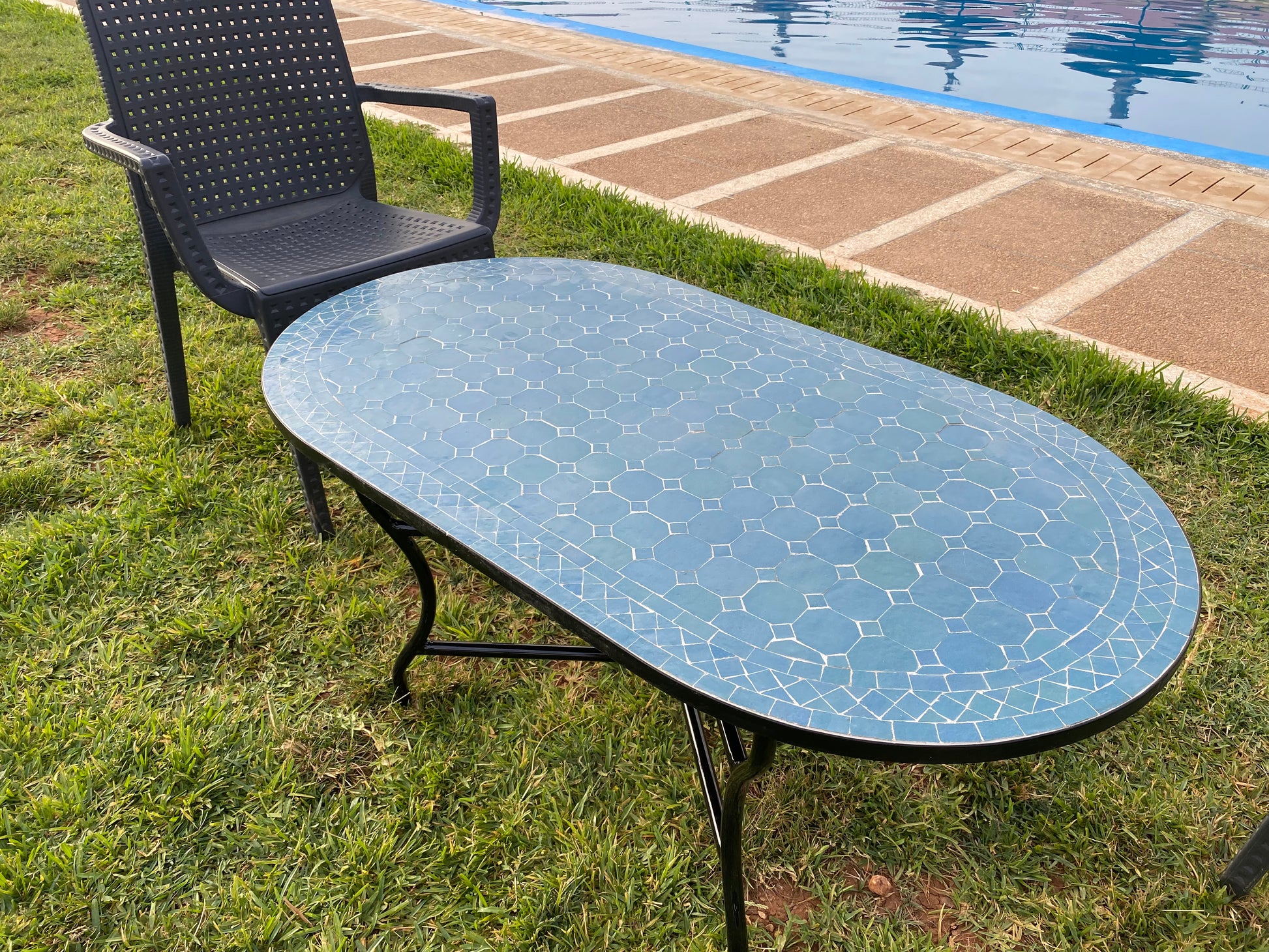 This Moroccan Zellige mosaic table features a soothing blue tile design, bringing a touch of tranquility and sophistication to any space. Handcrafted with precision, it offers both beauty and durability for any indoor or outdoor setting.