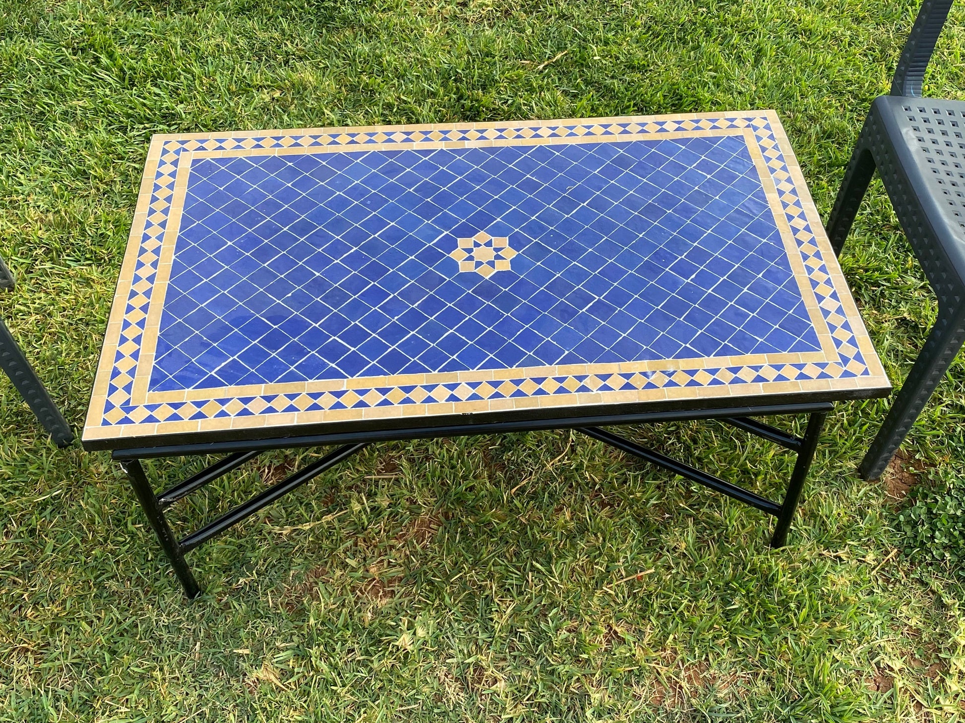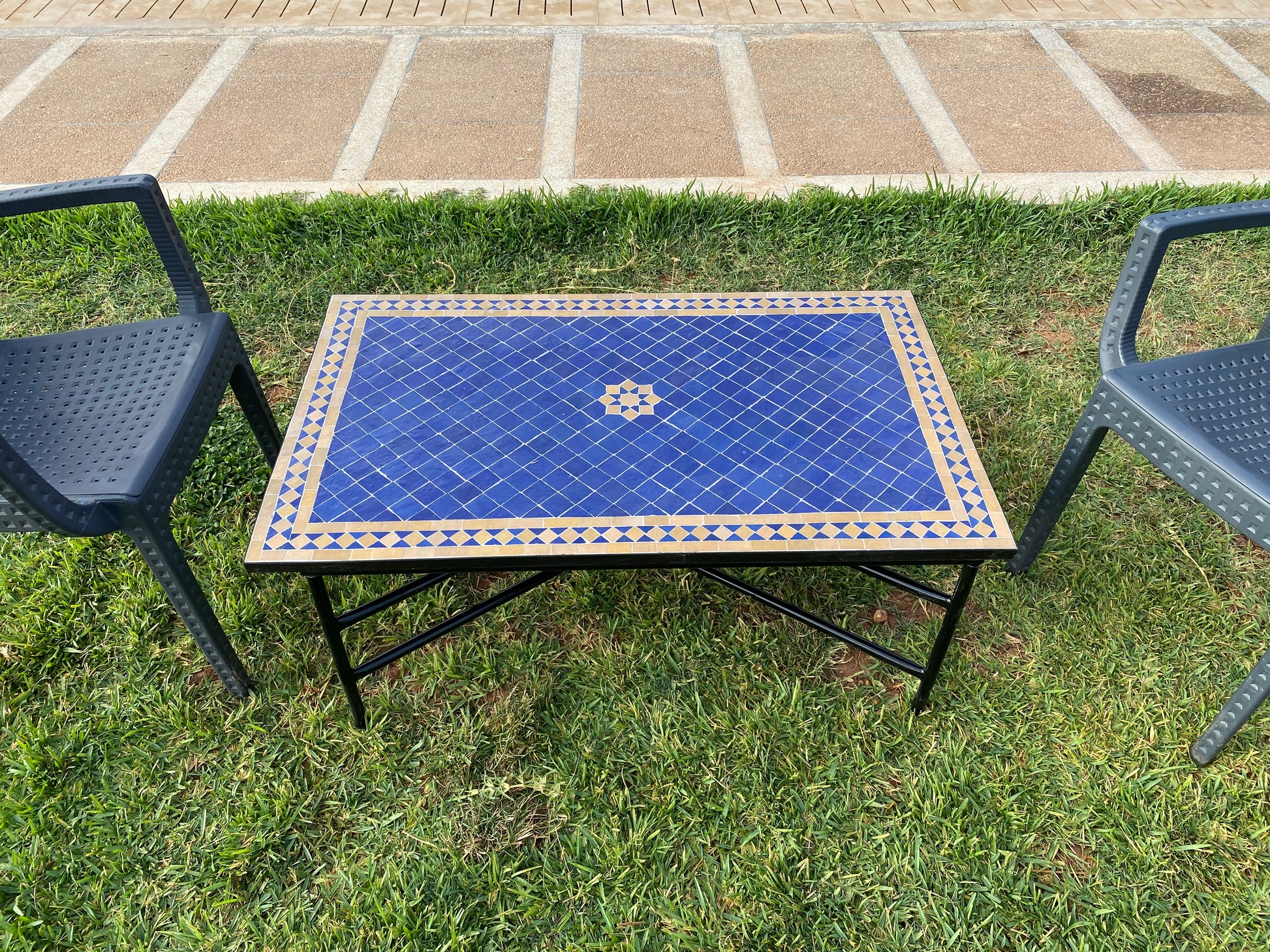 This exquisite Moroccan Zellige mosaic table features a rich deep blue tile design with intricate geometric borders, adding an air of sophistication and charm to any setting. Handcrafted with precision, it serves as a striking centerpiece for both indoor and outdoor spaces.