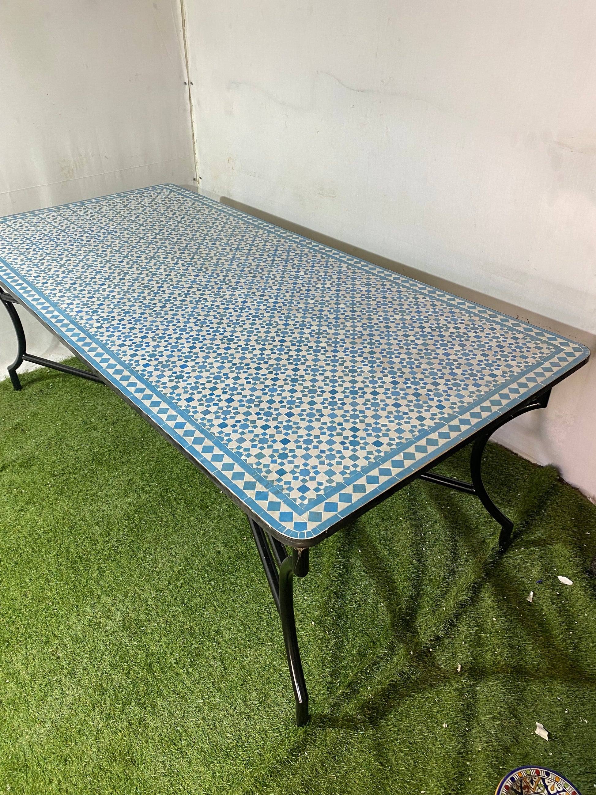 This exquisite Moroccan Zellige mosaic table features a detailed blue and white geometric pattern, showcasing the timeless beauty of traditional craftsmanship. Its subtle yet intricate design complements any indoor or outdoor space.