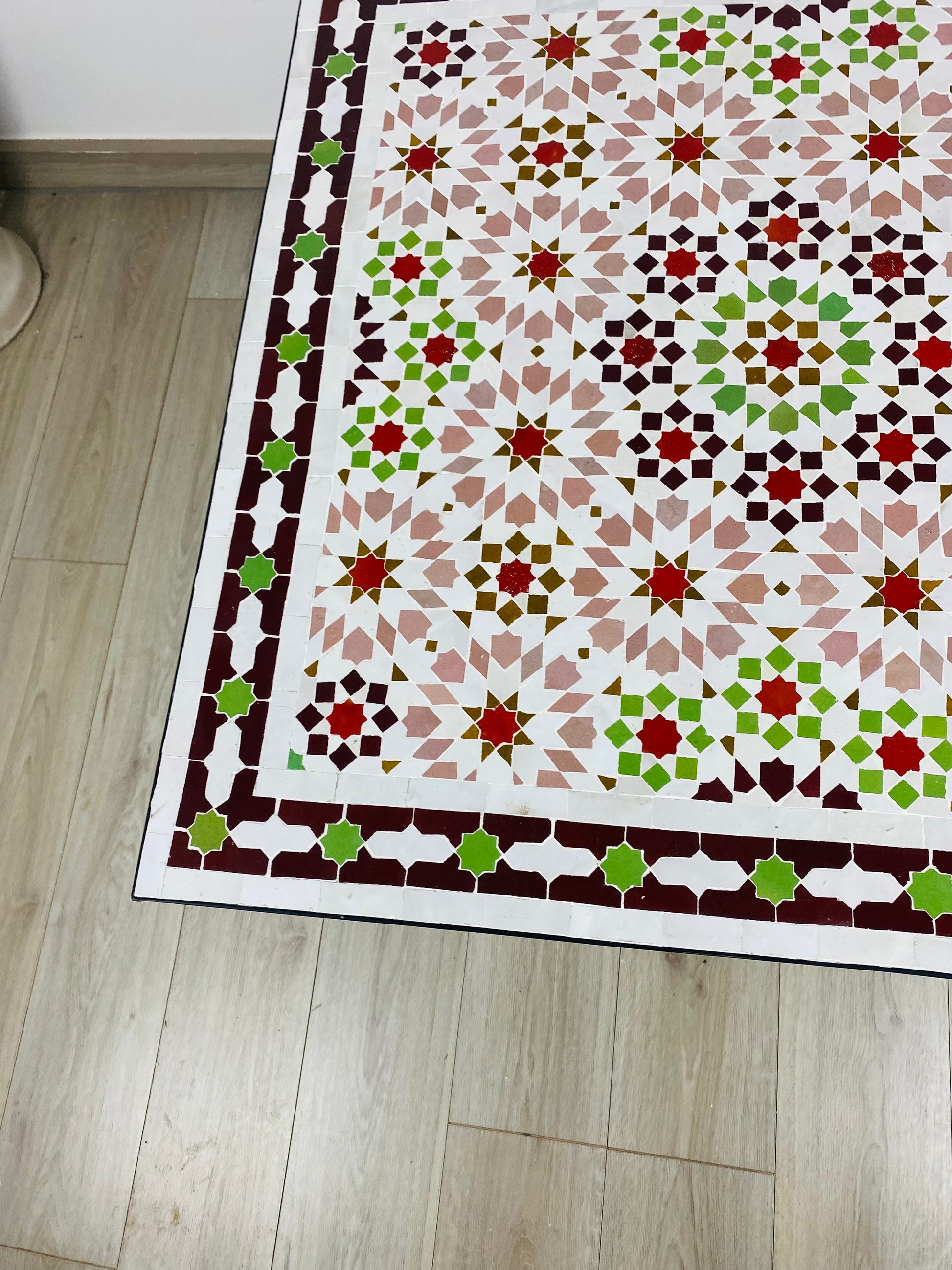 Handmade Moroccan Zellige Mosaic Table – Classic Red, Green & White Starburst
