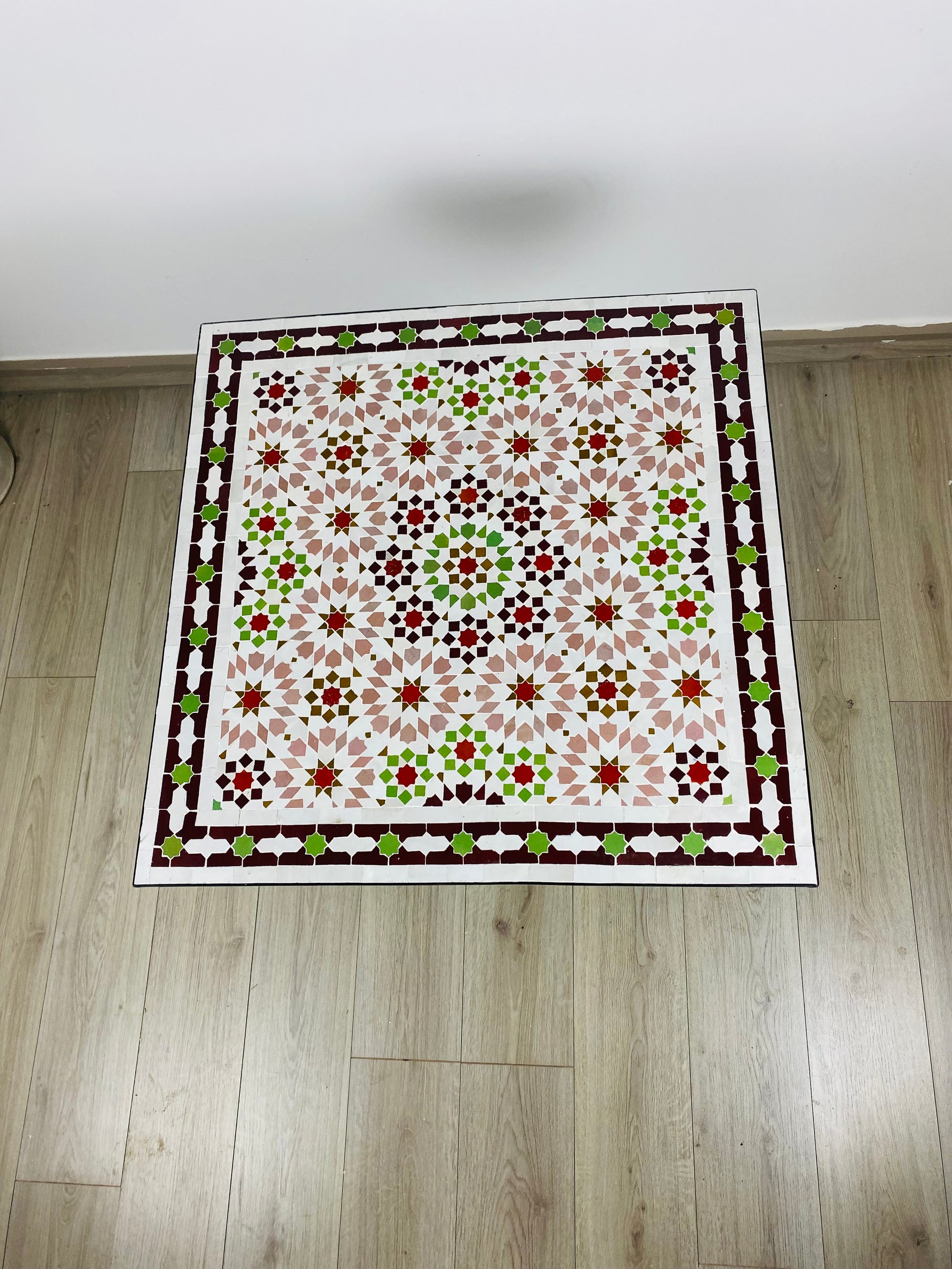 An exquisite display of Moroccan artistry, this handcrafted Zellige mosaic table features an intricate starburst pattern in warm red, green, and white tones. The vibrant and symmetrical design brings a touch of heritage and elegance, making it the perfect statement piece for any setting.