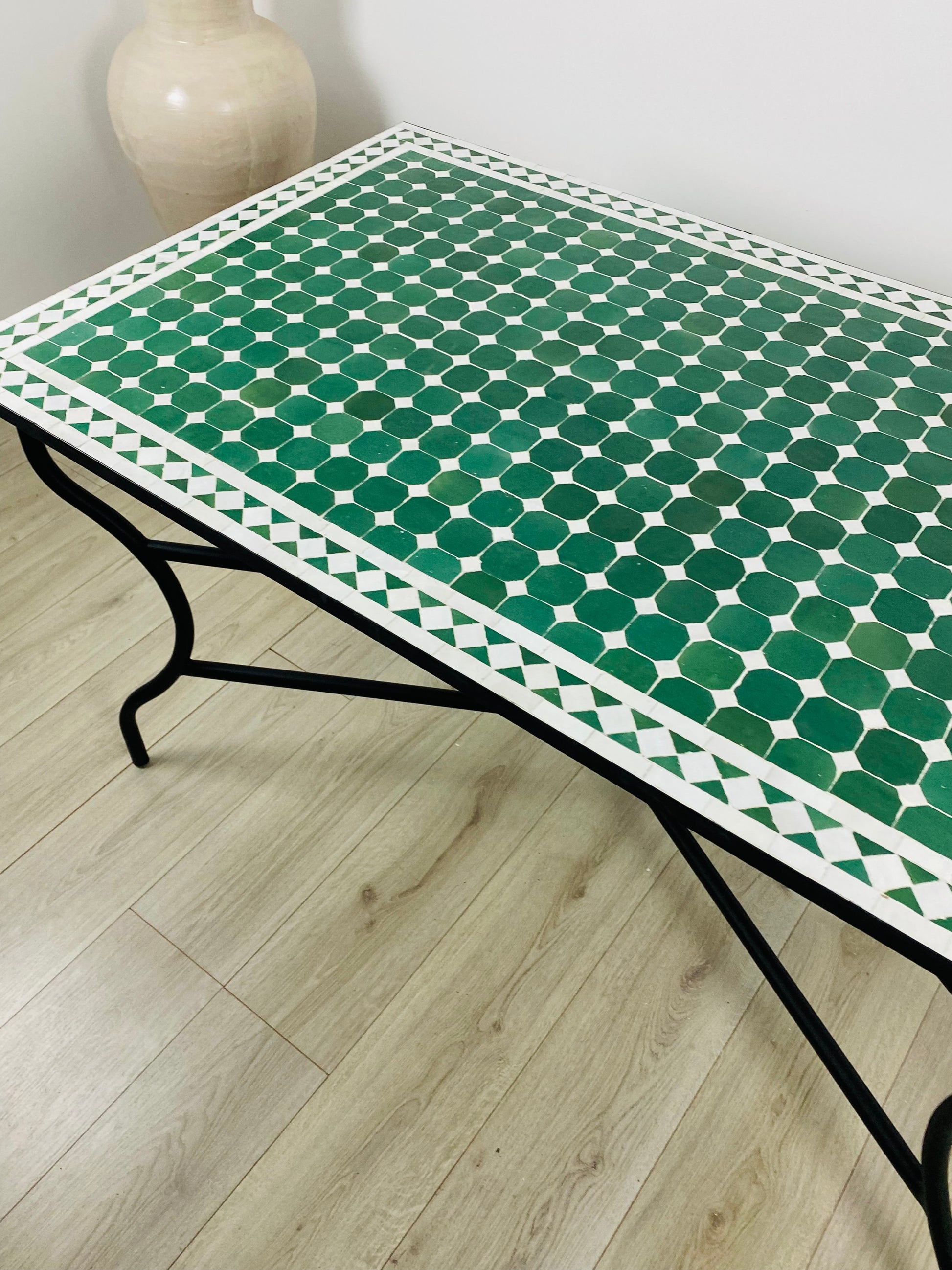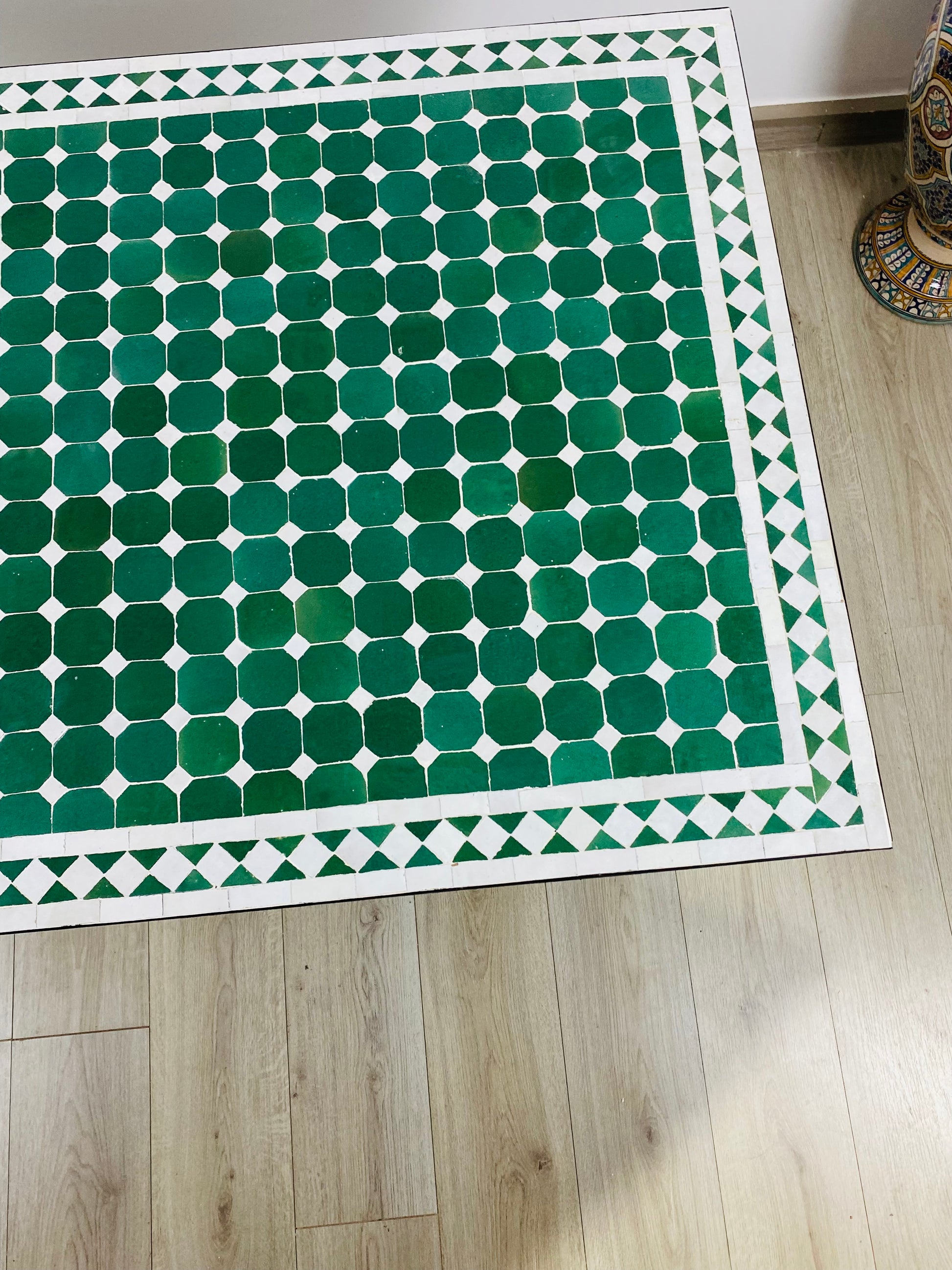 This Moroccan Zellige mosaic table features a timeless green tile design with a crisp white border, offering a refined and serene aesthetic. The balanced color contrast makes it a versatile addition to any indoor or outdoor space, adding both elegance and authenticity.
