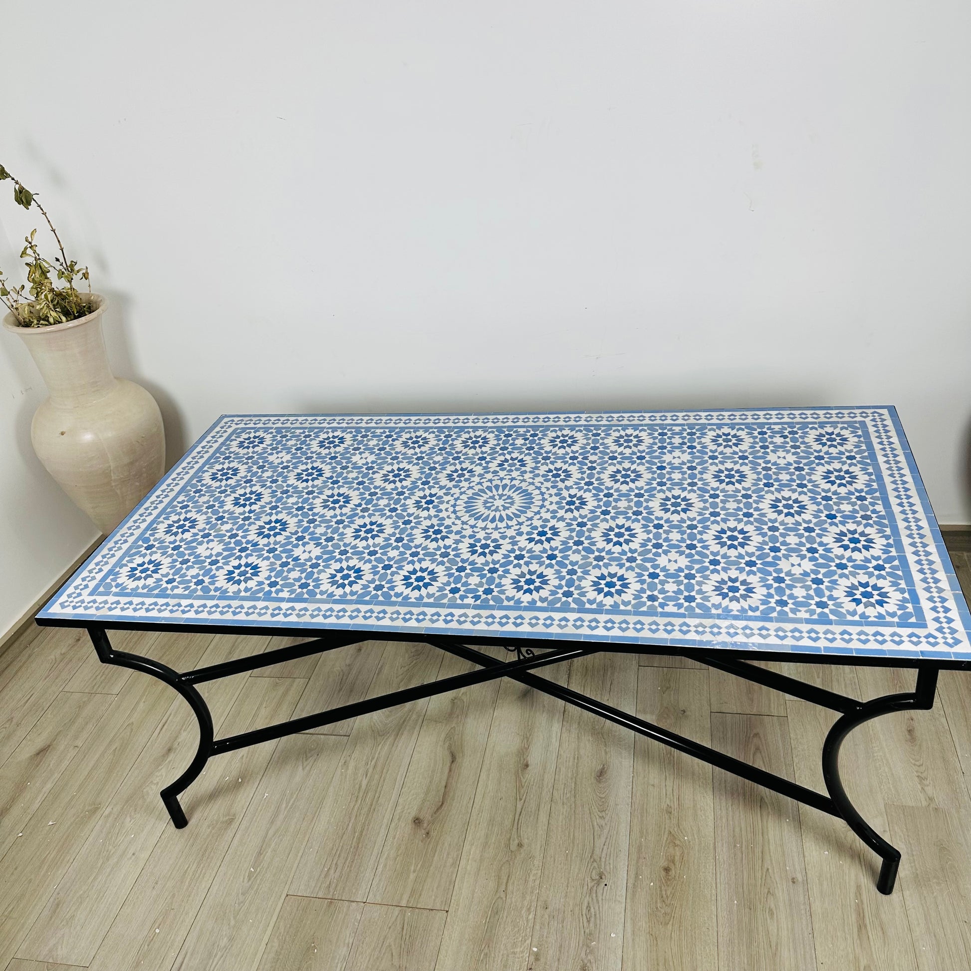 This exquisite Moroccan Zellige mosaic table features a delicate and intricate blue and white geometric floral design, inspired by traditional Moroccan craftsmanship. The symmetrical pattern and fine detailing make this table a sophisticated addition to any space. Available in rectangular, square, round, or oval shapes, it serves as a dining, coffee, or decorative table, perfect for both indoor and outdoor settings.