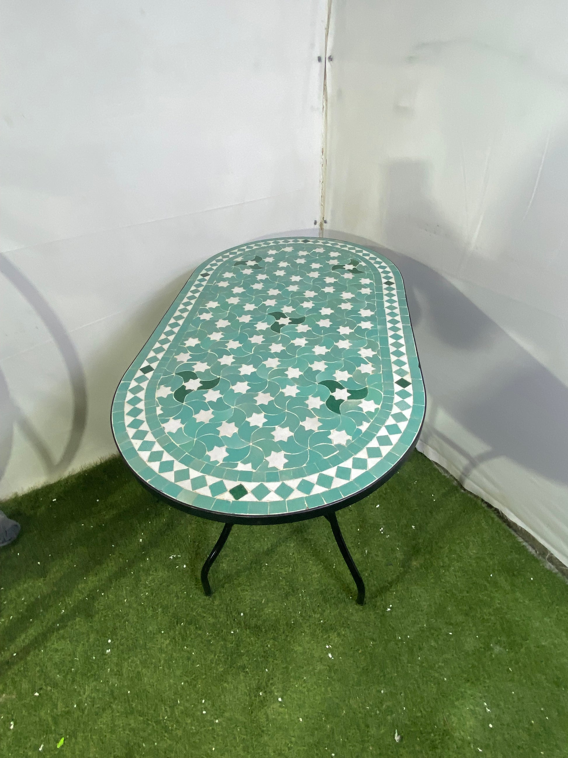 This delicate Moroccan mosaic table showcases a soothing soft green base adorned with white star patterns, evoking a sense of calm and sophistication. The elegant design adds a unique charm, perfect for tranquil interiors, cozy patios, or garden settings.