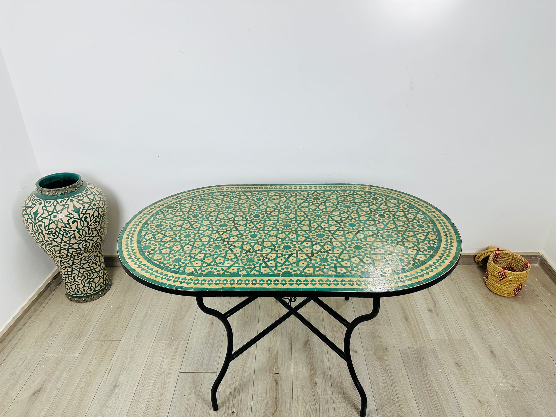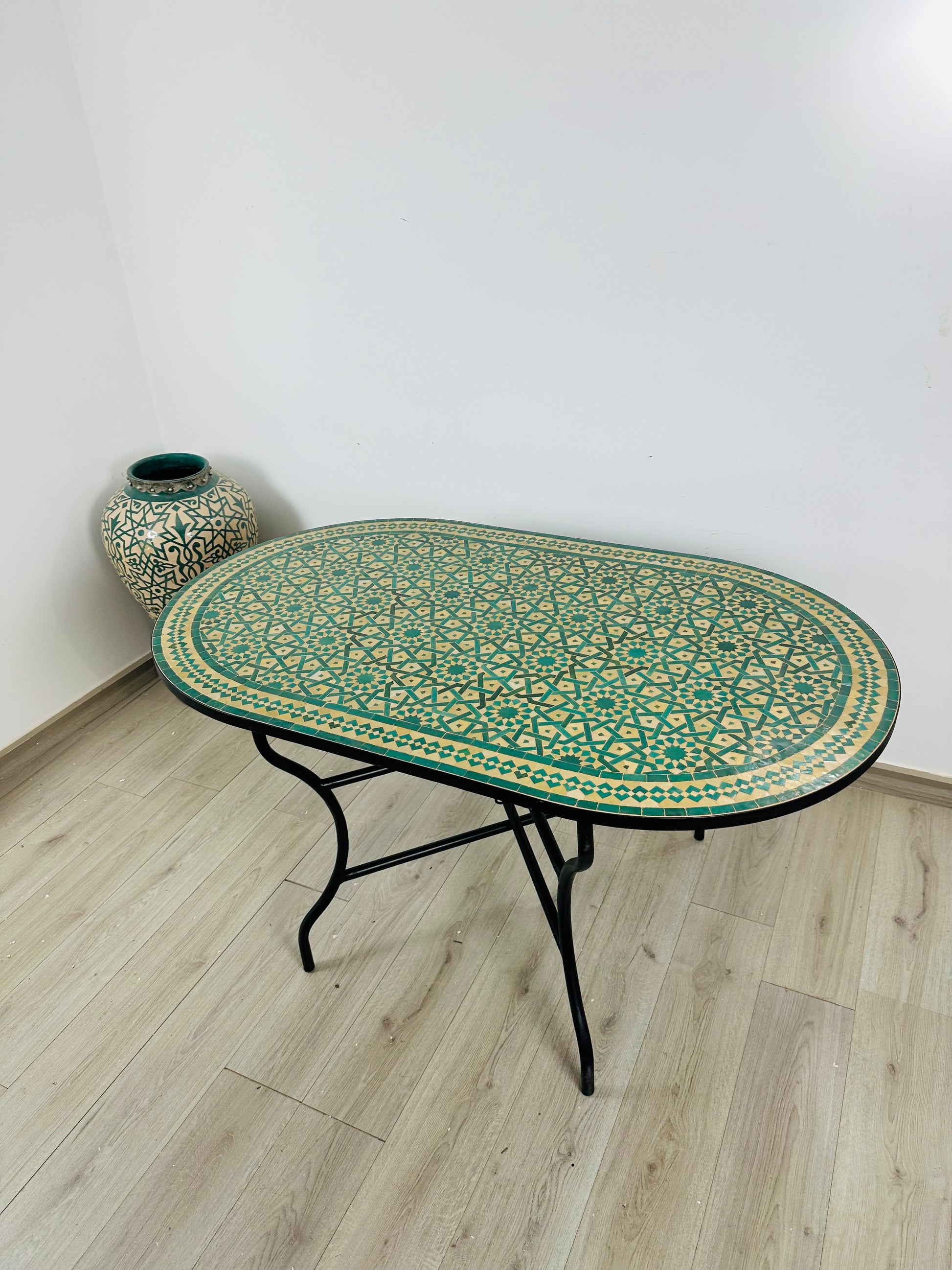 - High-quality Moroccan ceramic tiles, cement, and a durable black iron base