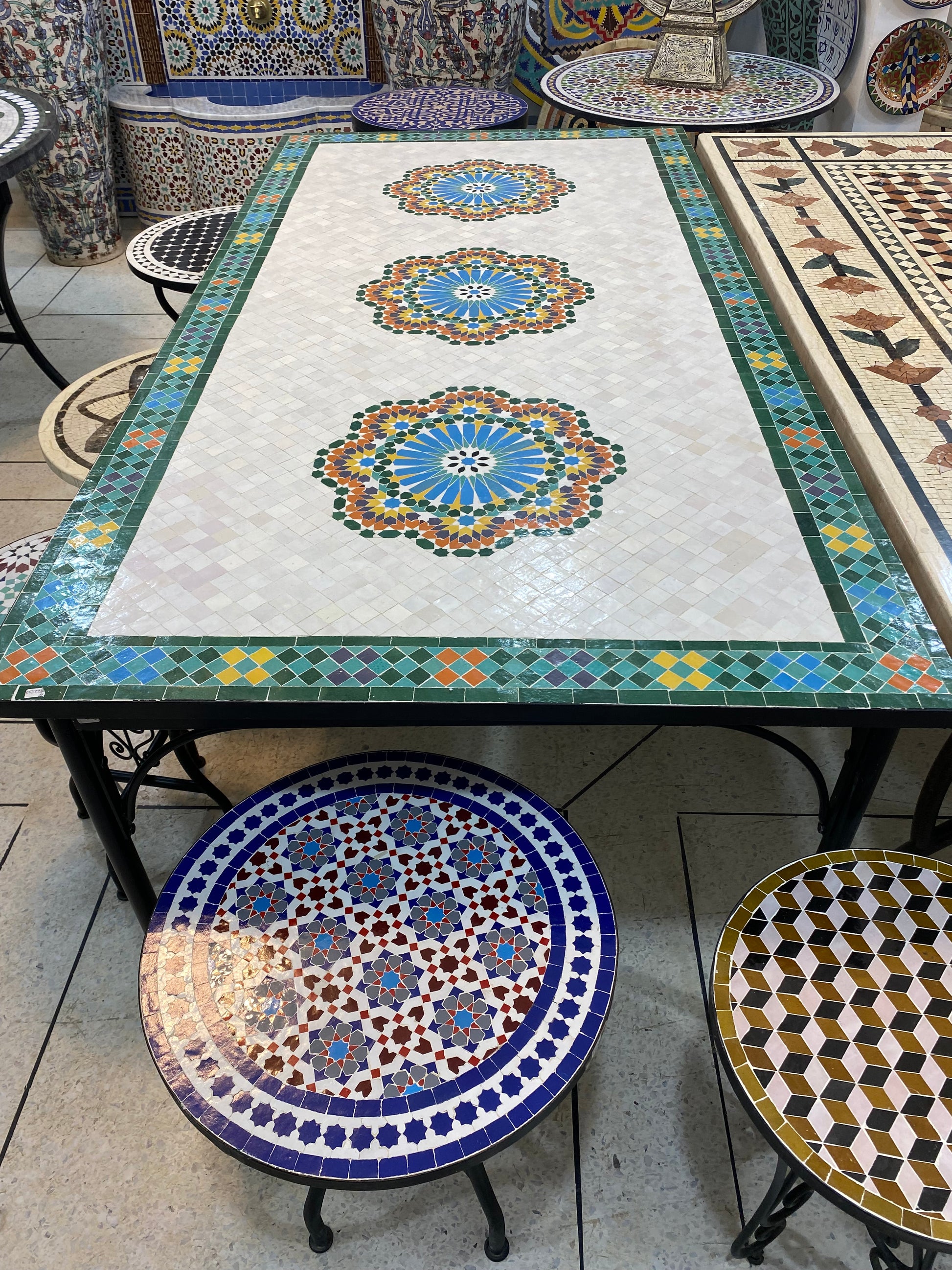 - TABLES : Mosaic, tiles, Clay, Iron, legs cap, metal base.